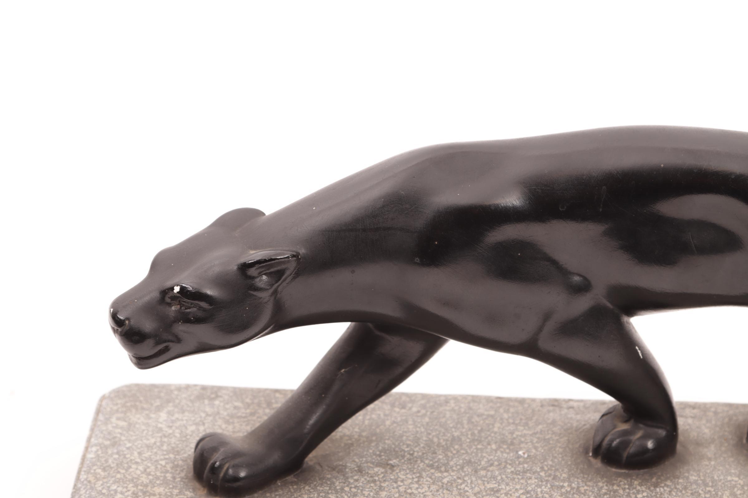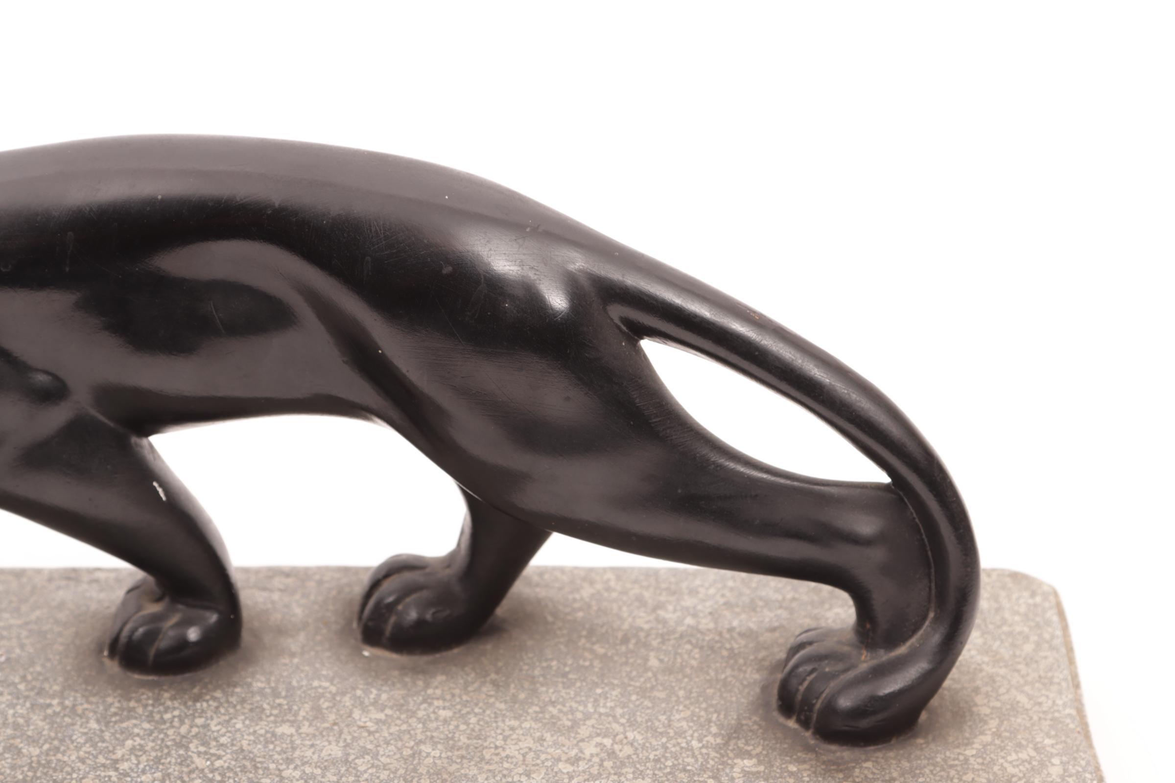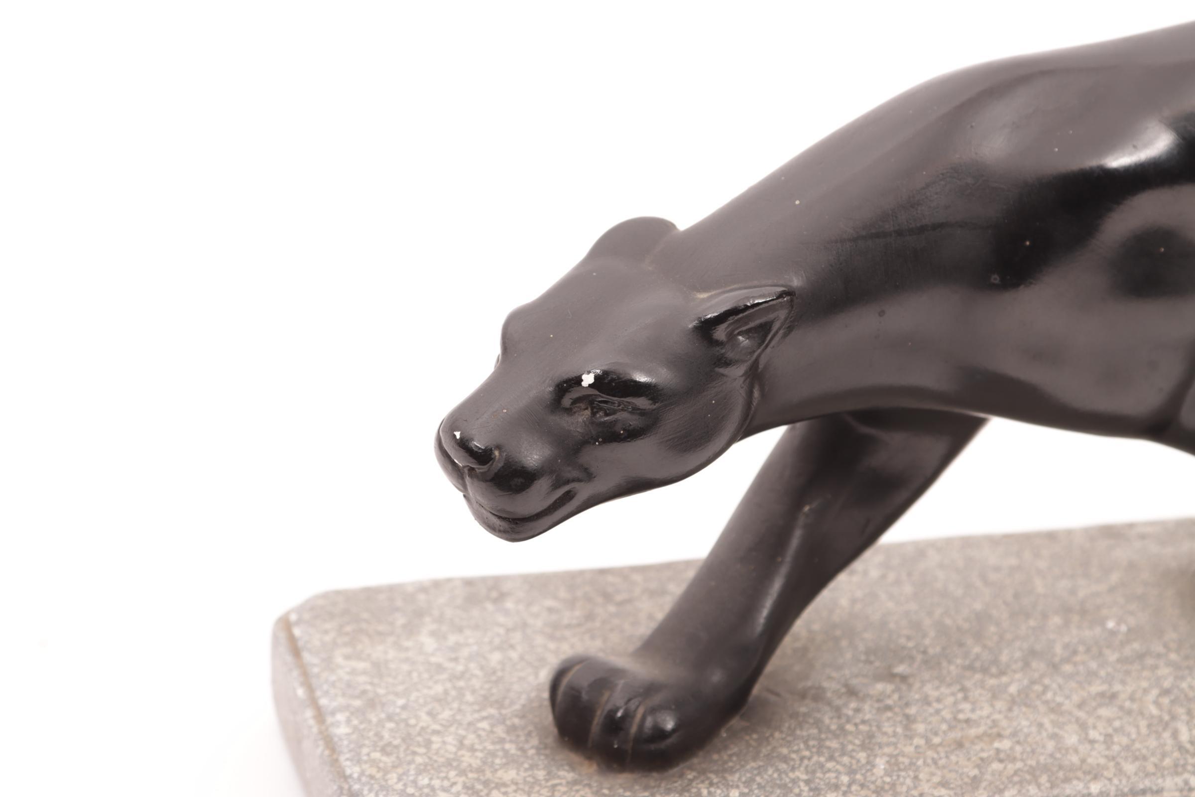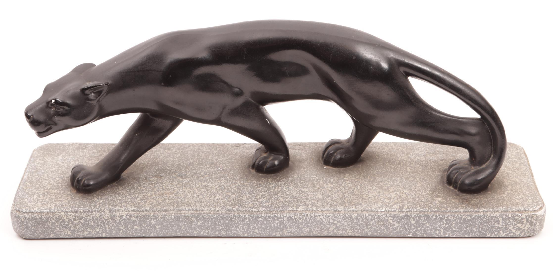 Terracotta Art Deco sculptuur van een zwarte panter op grijs basement