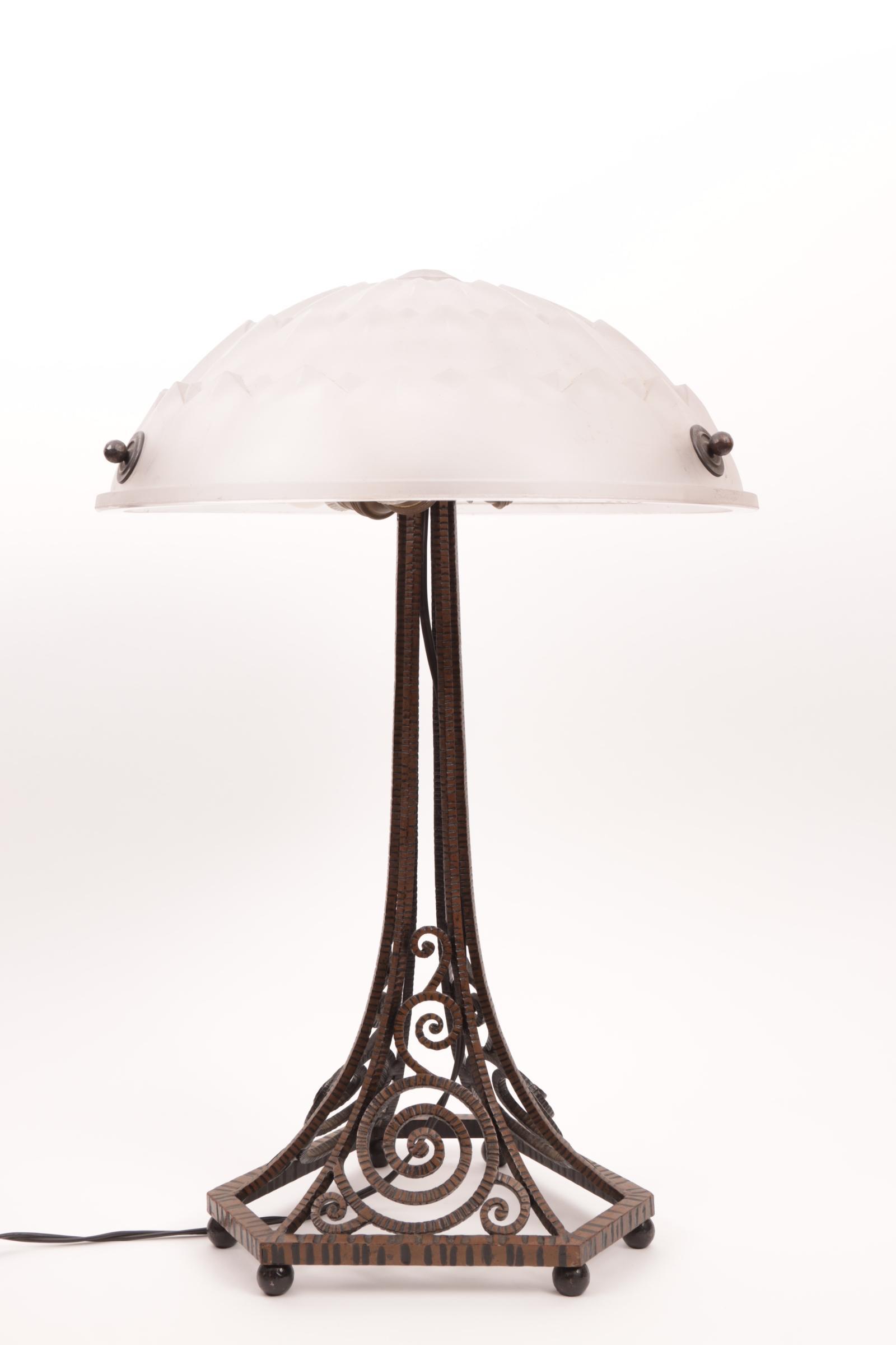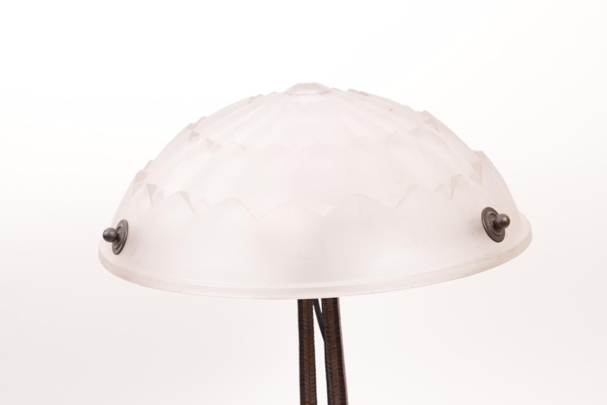 Art Deco tafellamp op smeedijzer voet met satiné glaskap in hoogreliëf, h.52 cm.