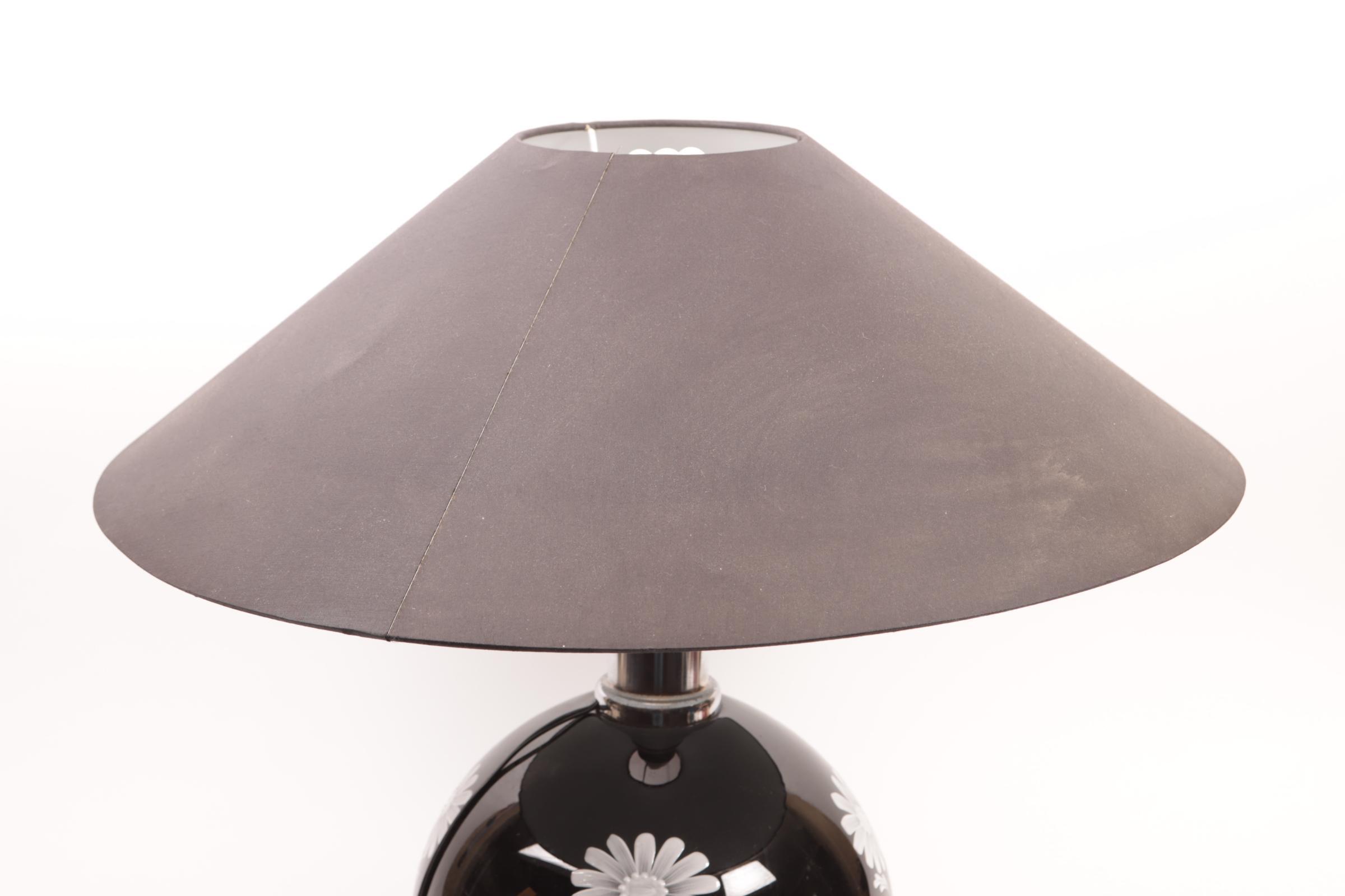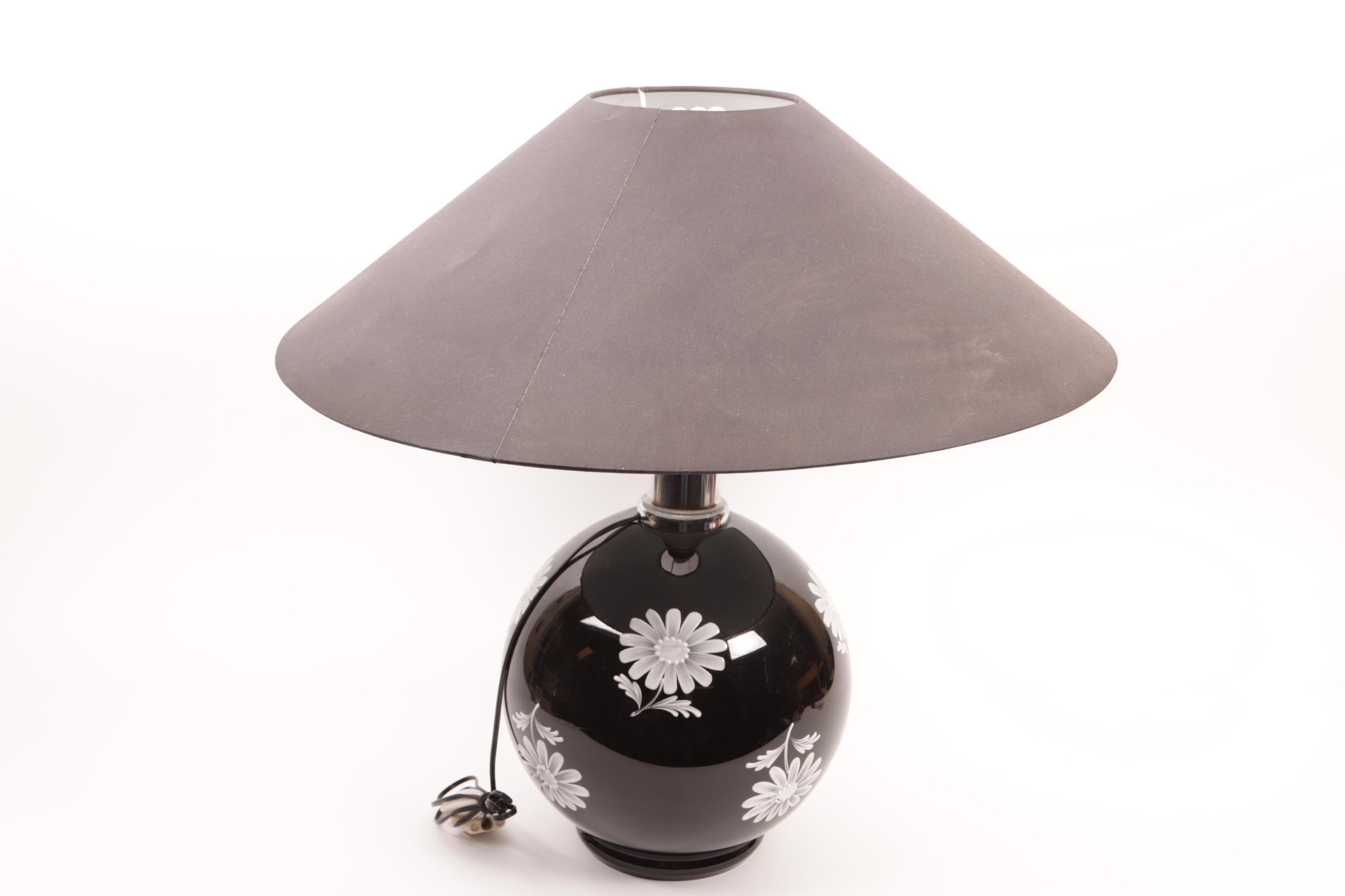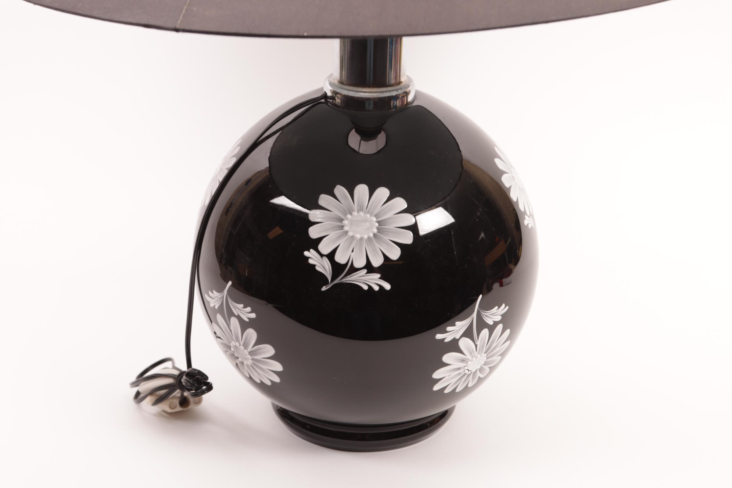 Tafellamp op zwart glazen voet met decor van witte bloemen en zwart stoffen kap, h.54 cm.