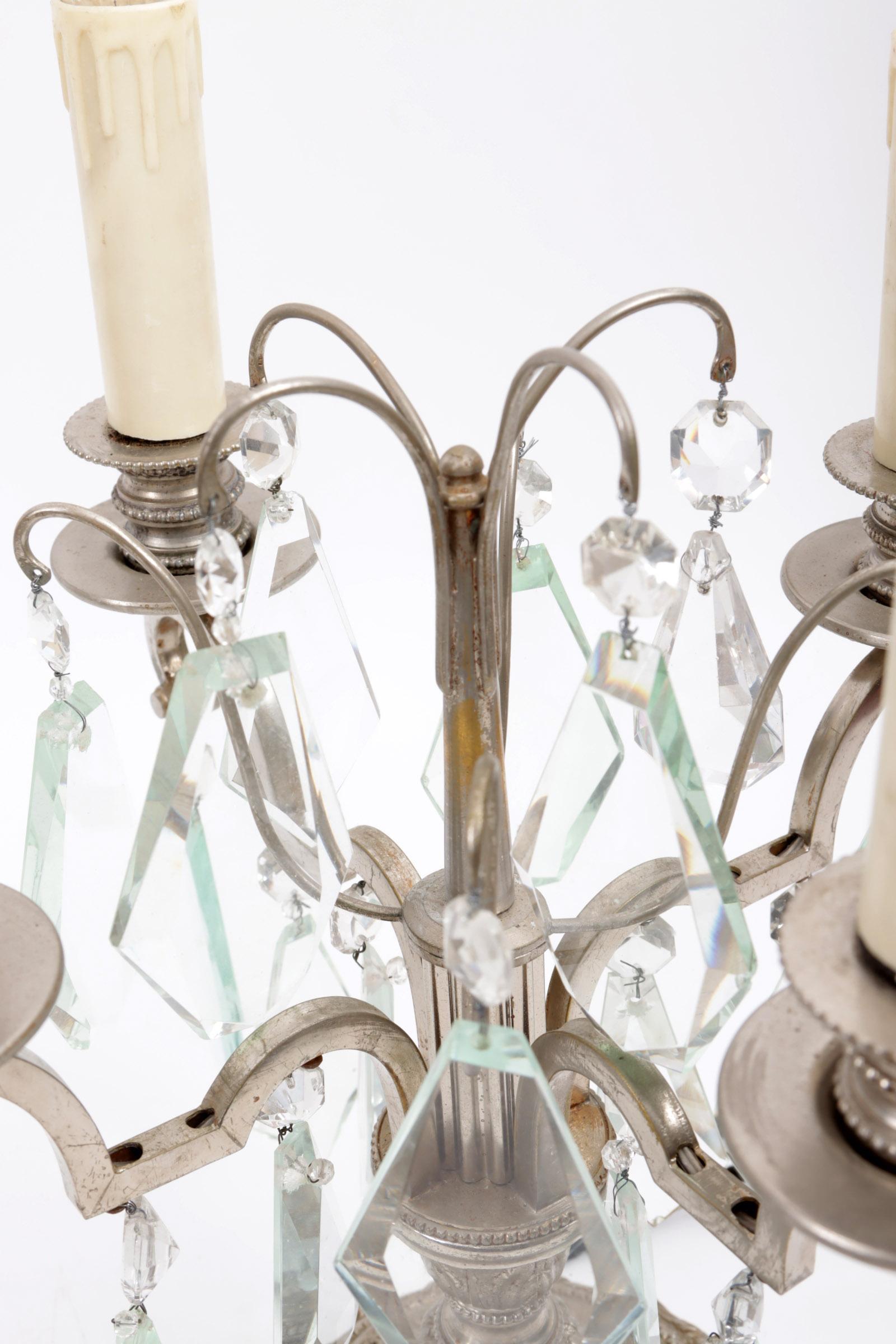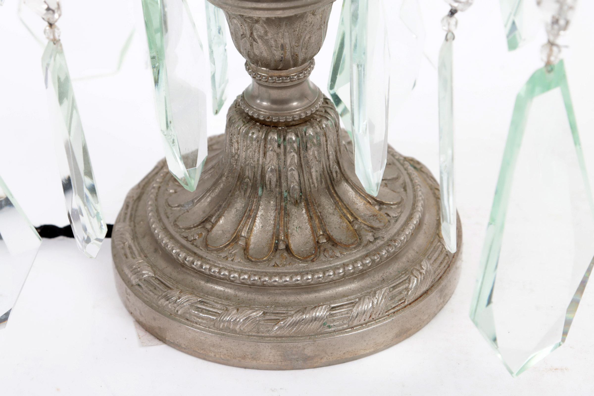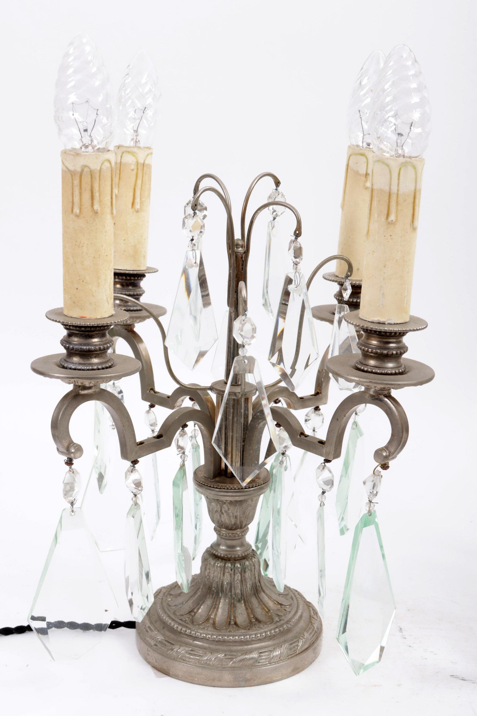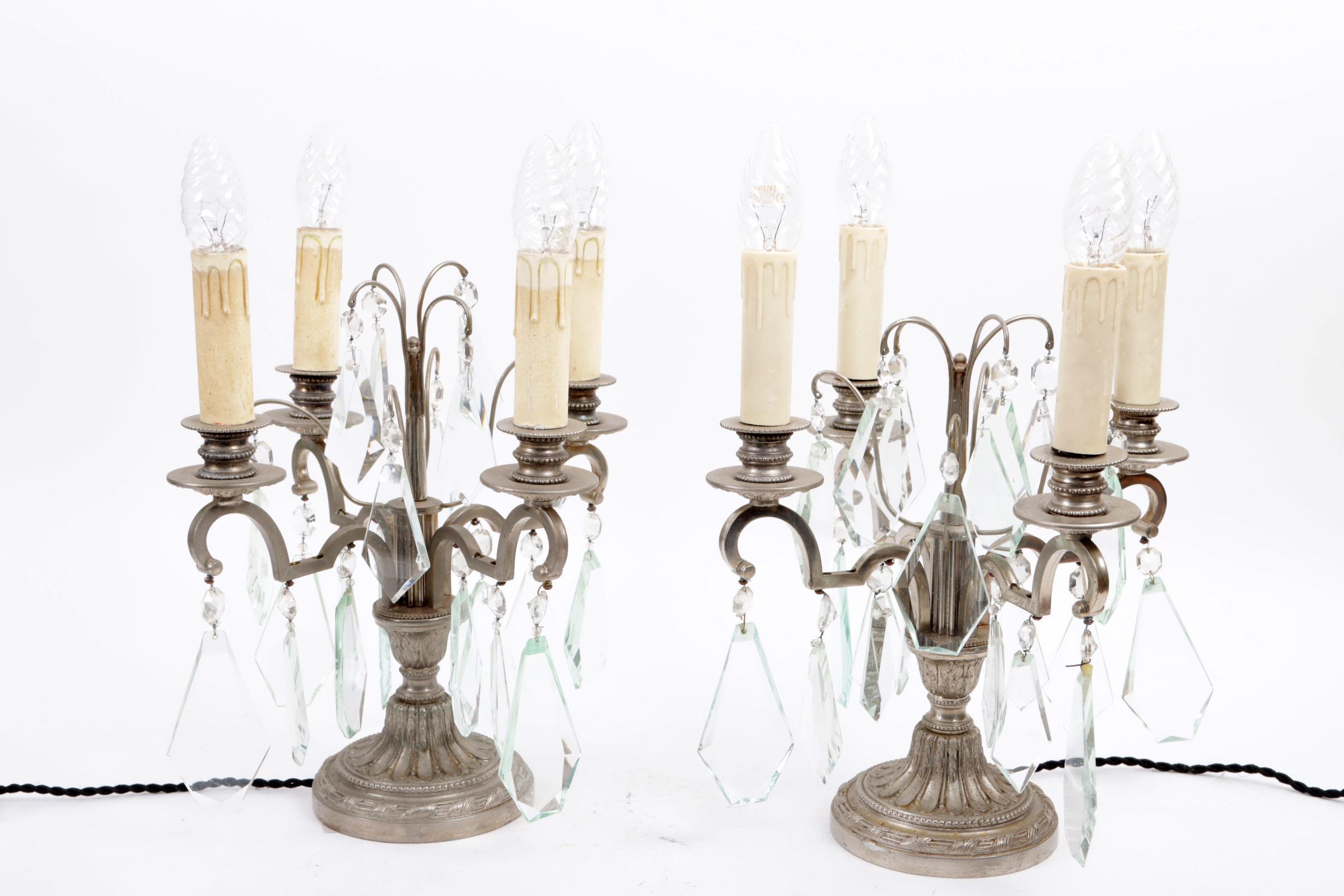 Twee antieke tafellampen met glazen pegels, opnieuw elektrisch ingericht, h.42 cm.