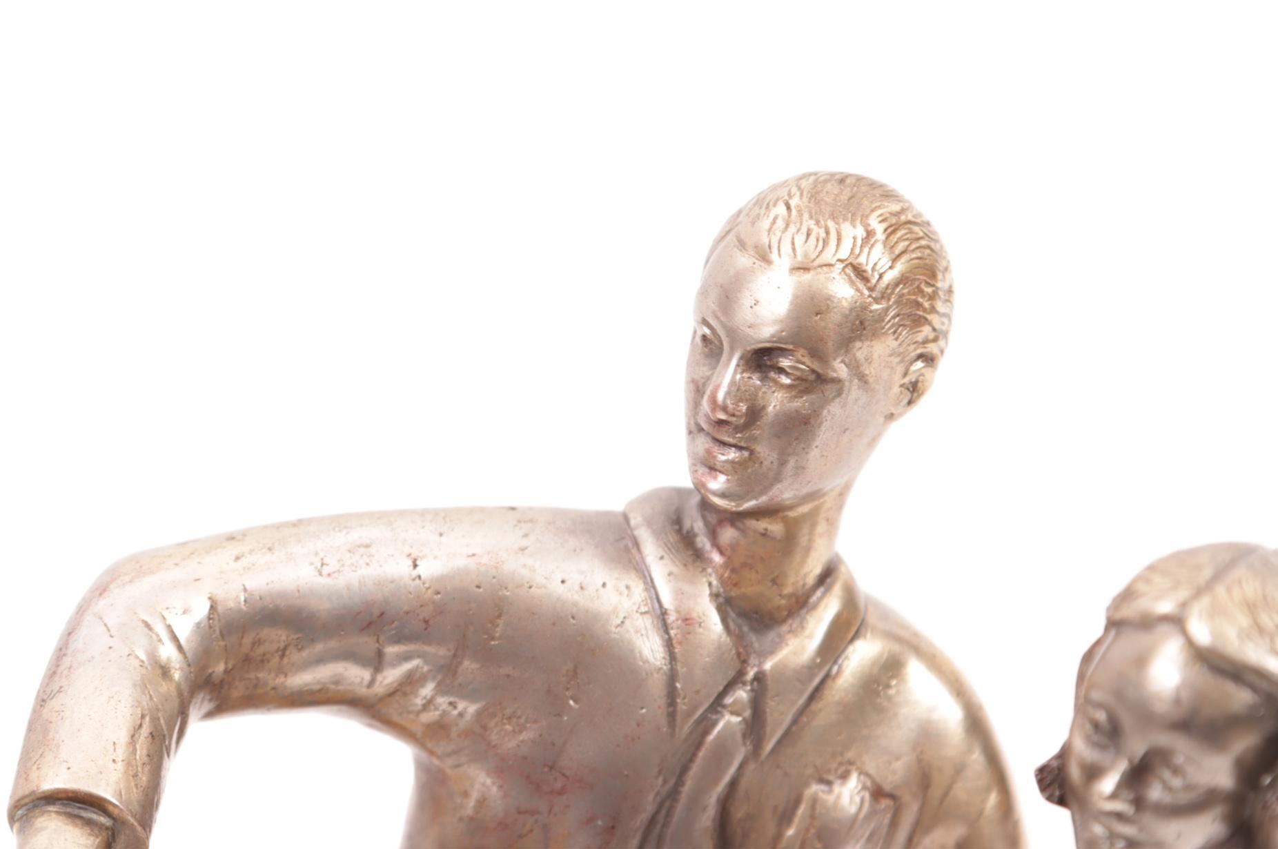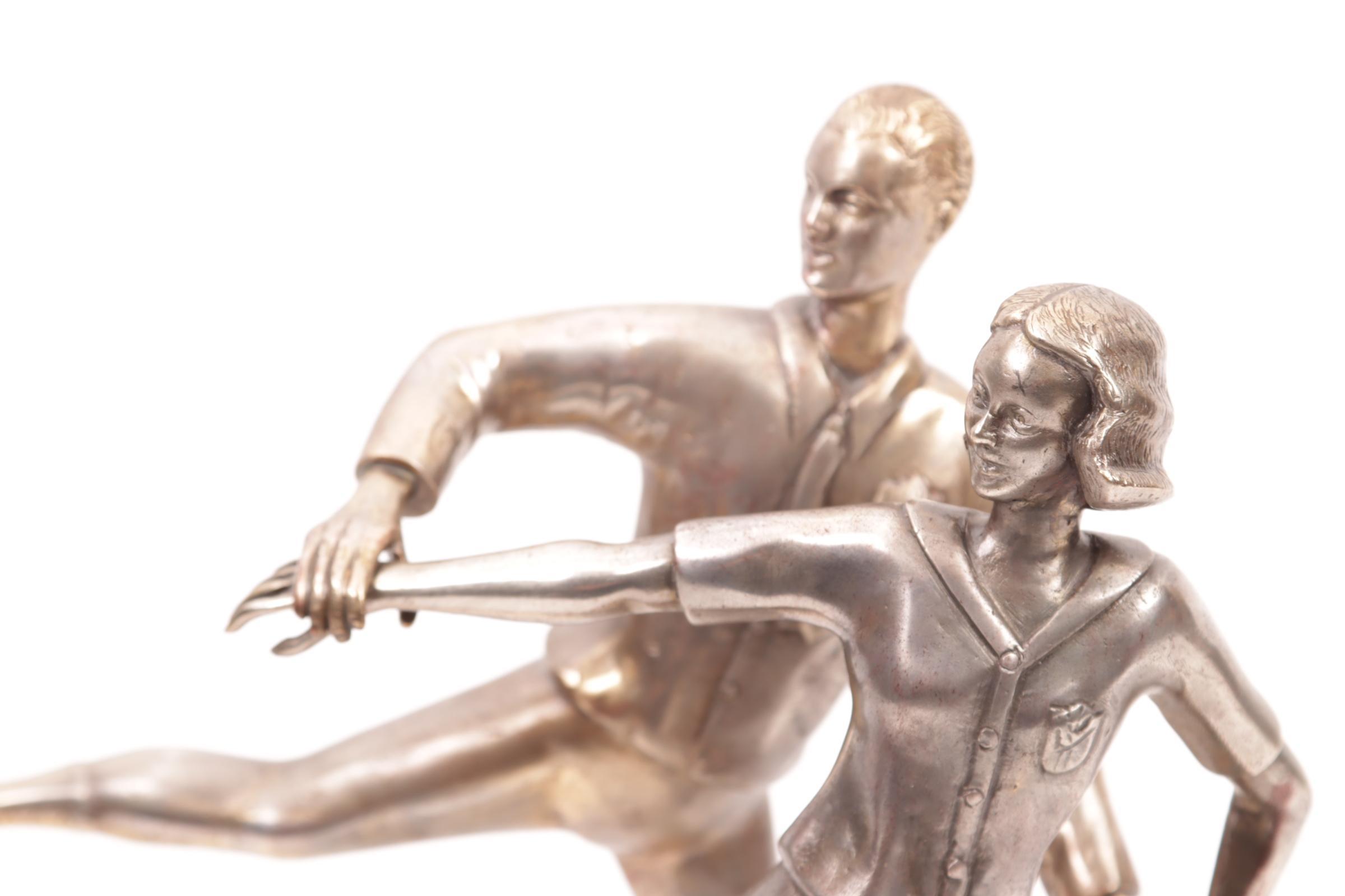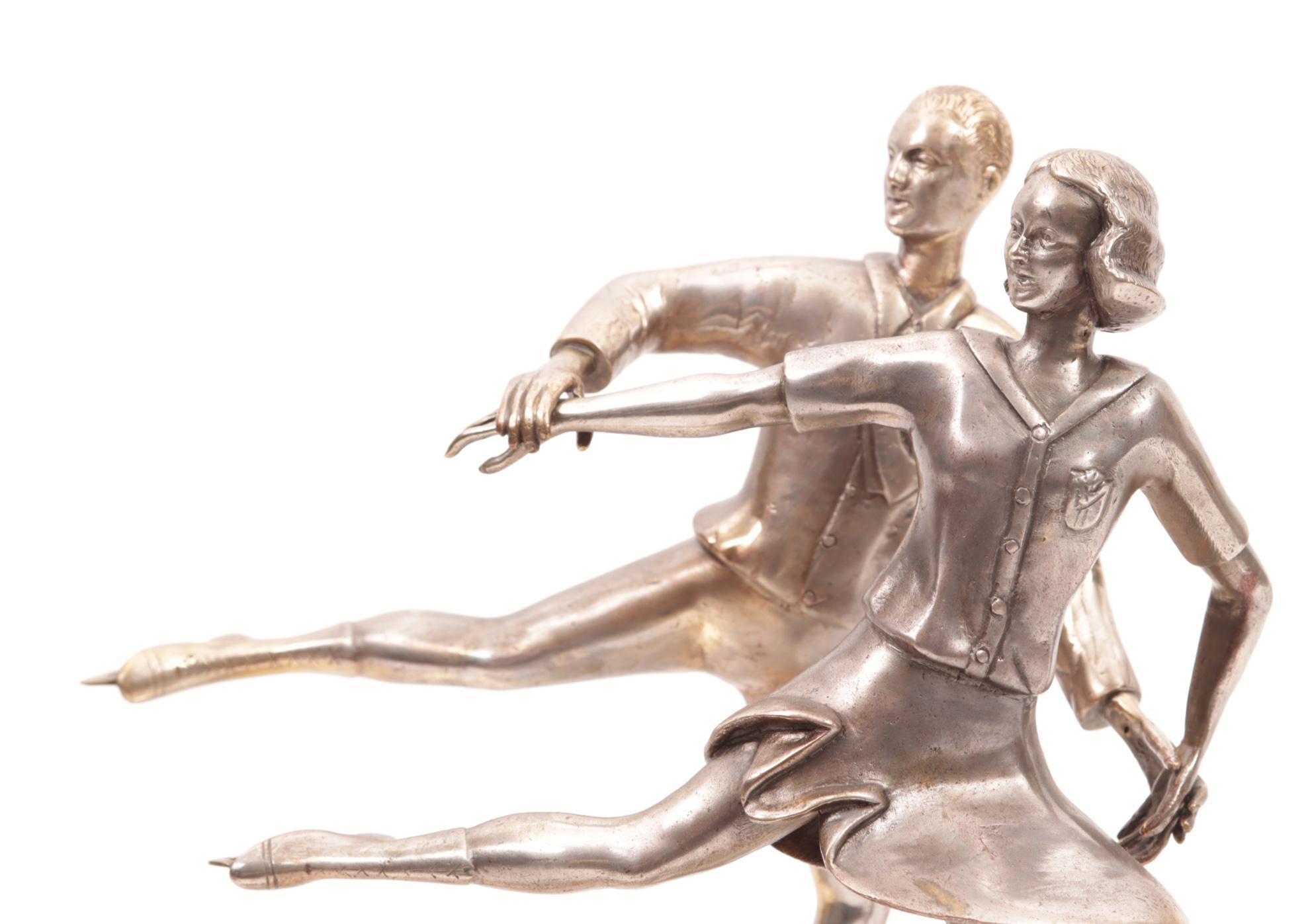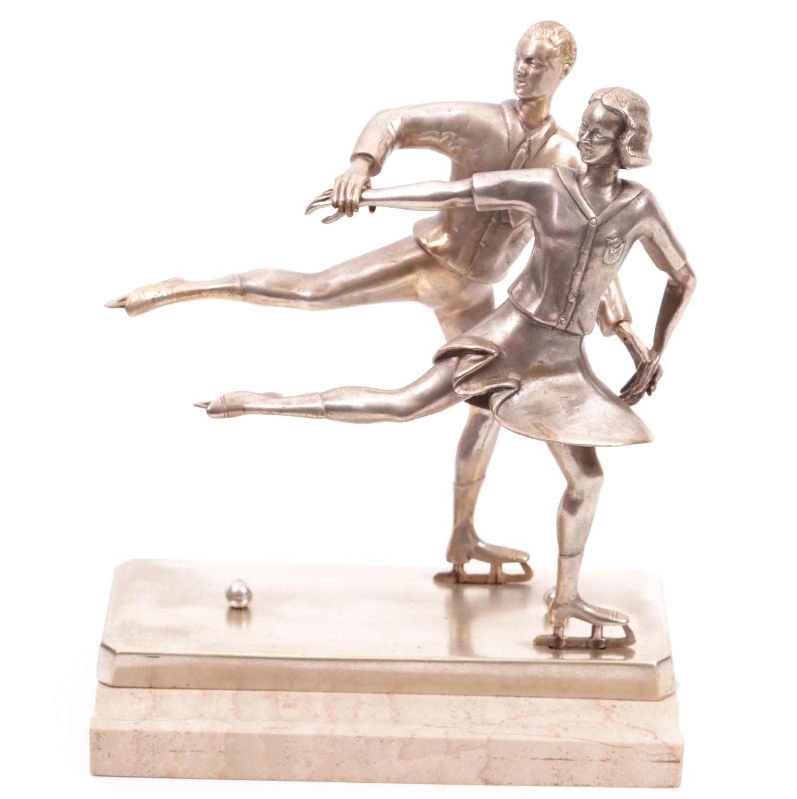 Bronzen Art Deco beeld van twee schaatsers op marmeren basement met uitsparing voor een pen, h.27 ccm.