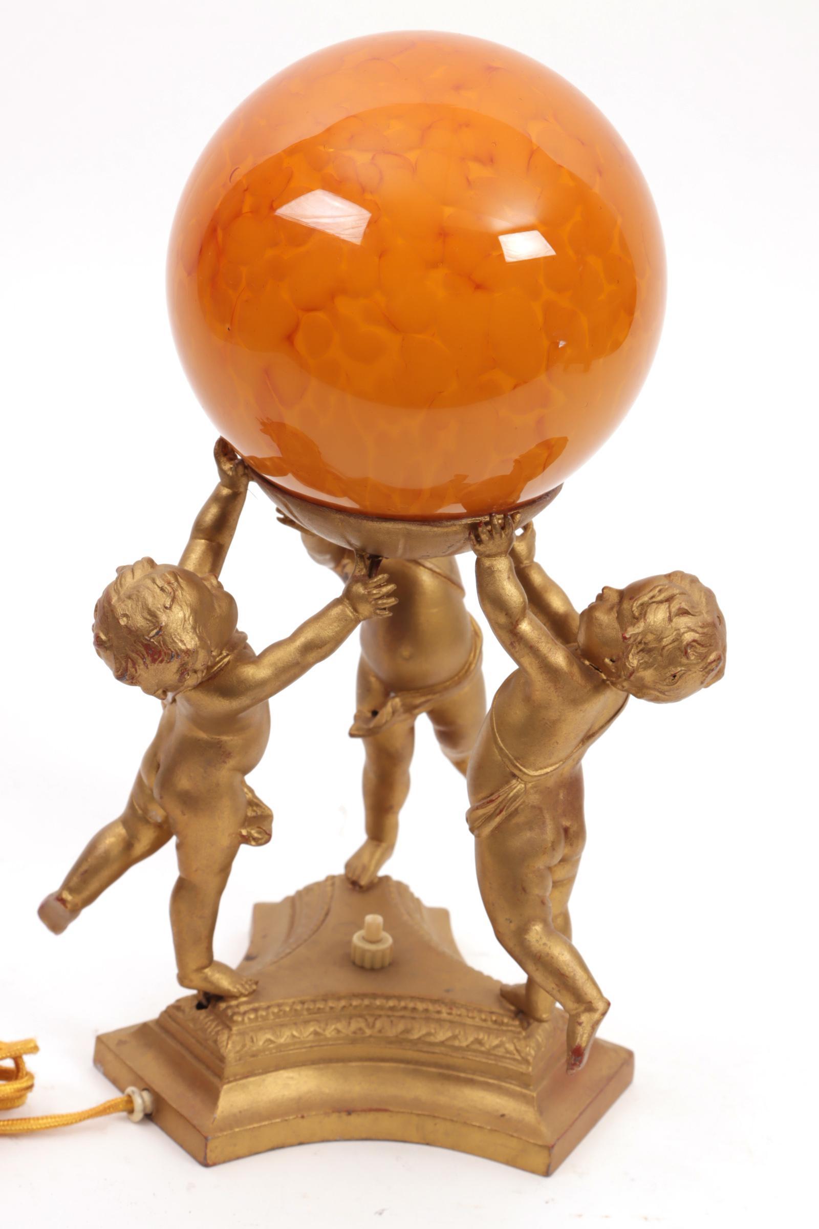 Tafellamp met amberkleurige glazen bol gedragen door drie kindjes h.35 cm.
