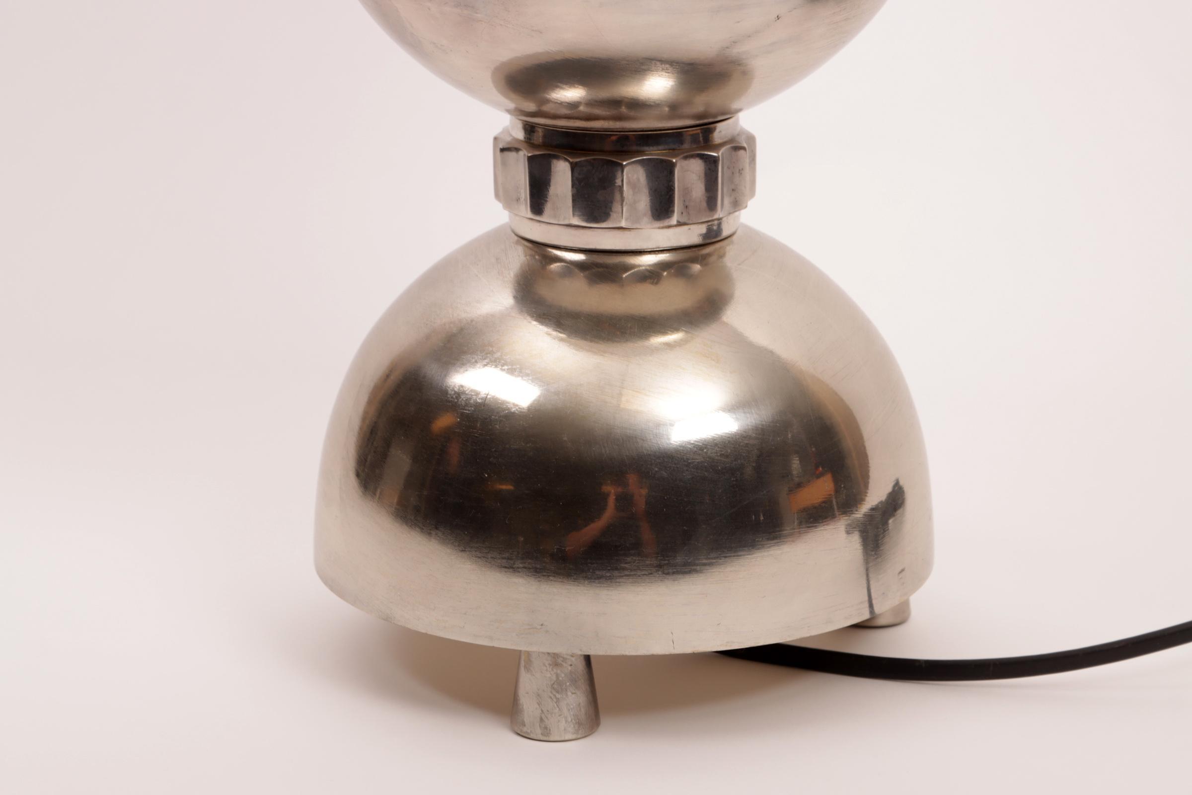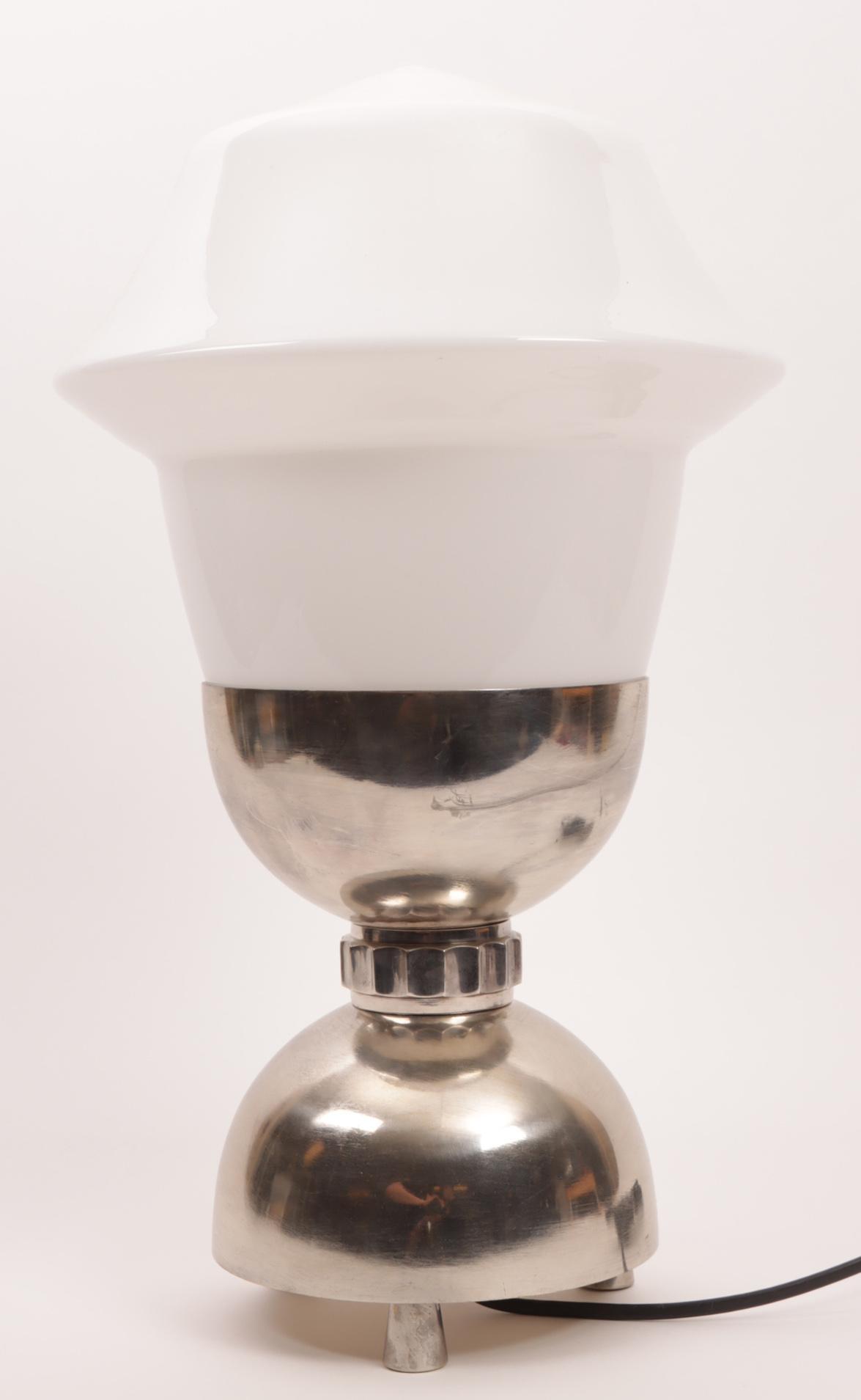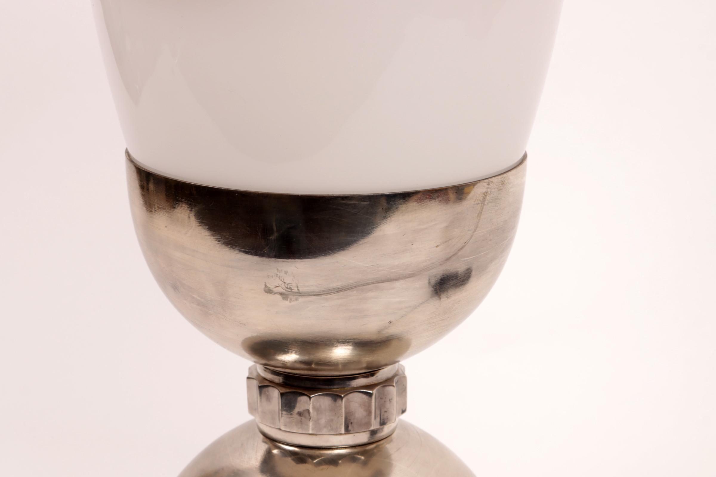 Art Deco tafellamp op verzilverde voet met melkglazen kap, h.42 cm.