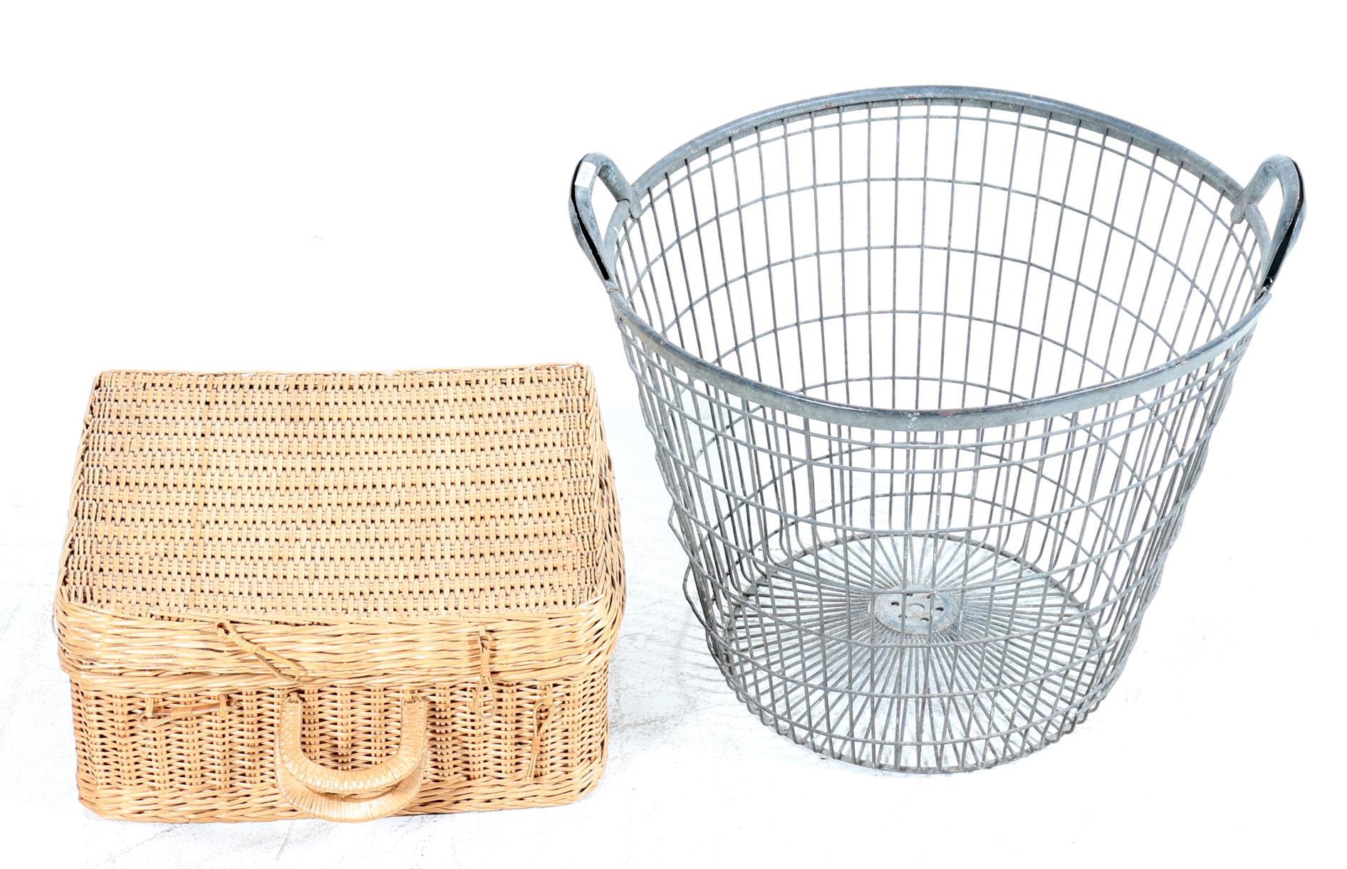 Oude metalen mand en rieten koffer