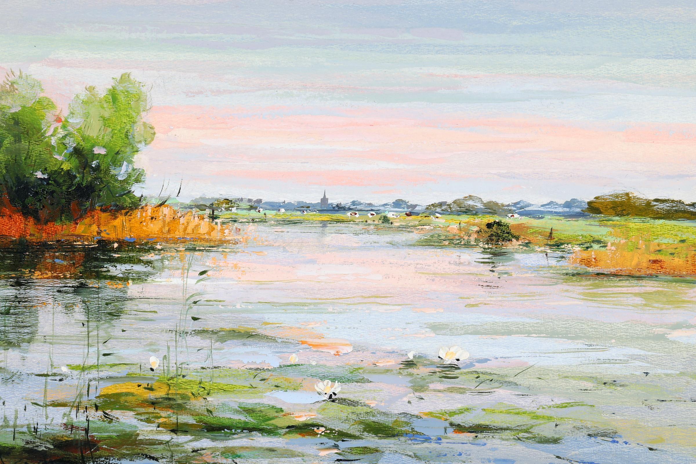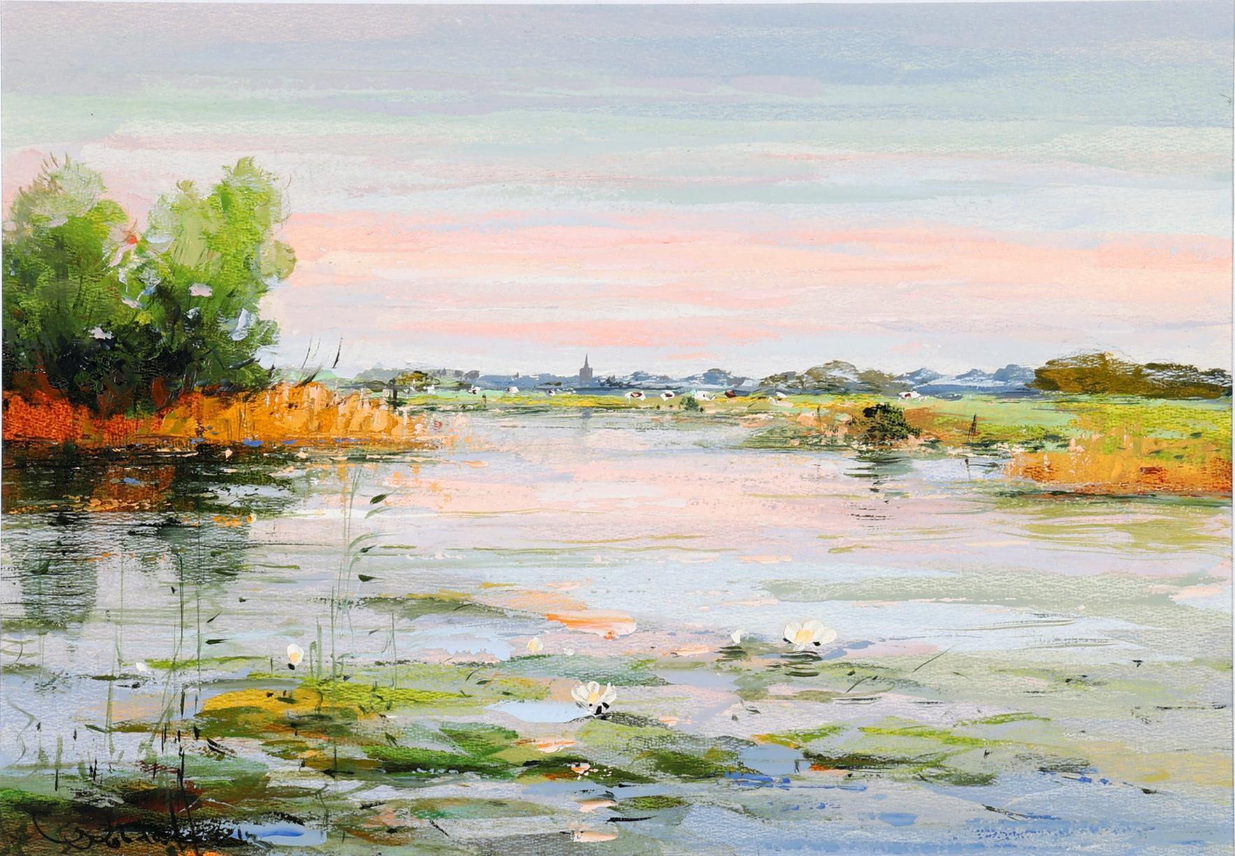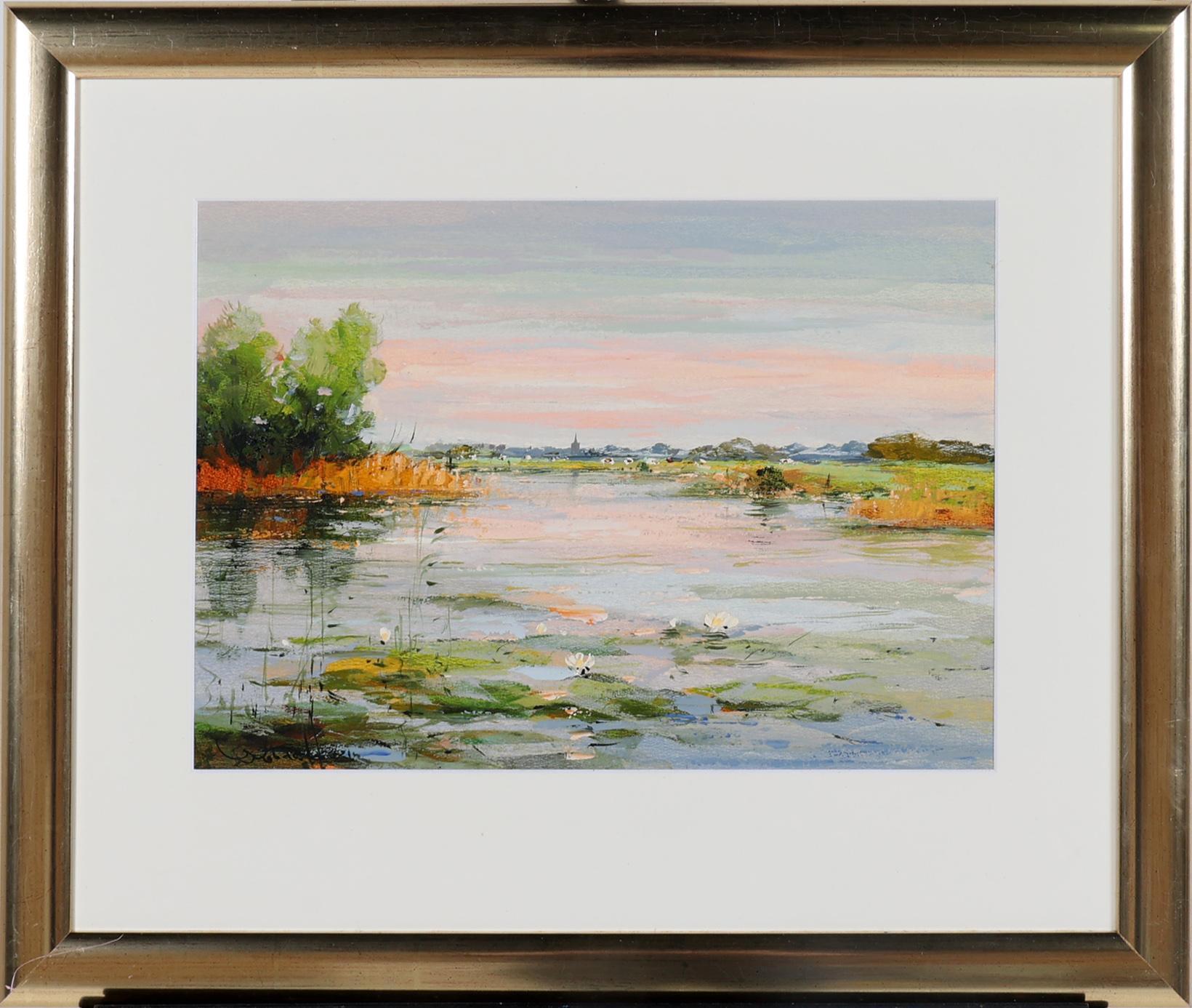 Rob de Haan, Plassengezicht met waterlelies en kerkje op de achtergrond, olieverf op board, 48 x 34 cm.