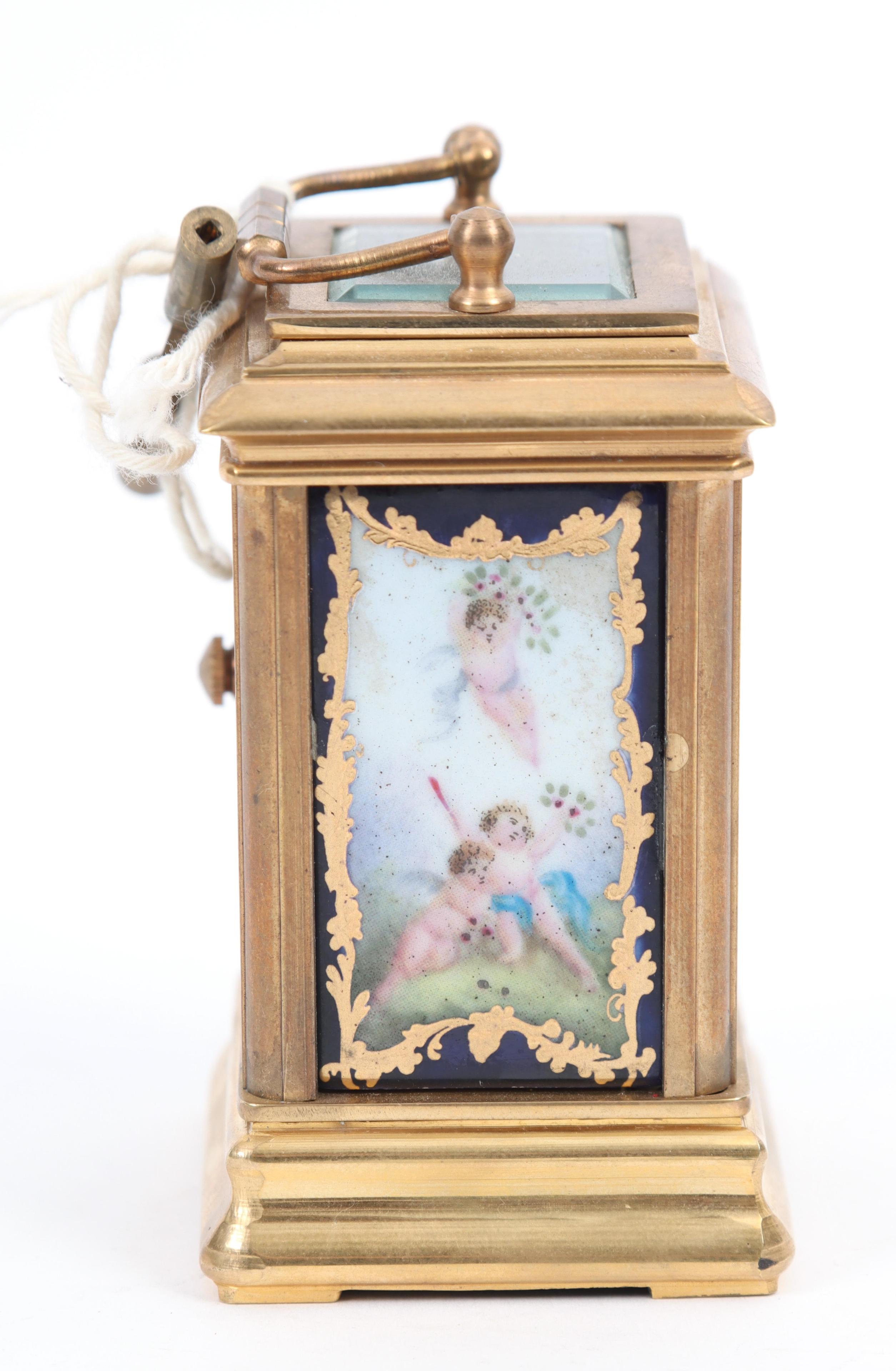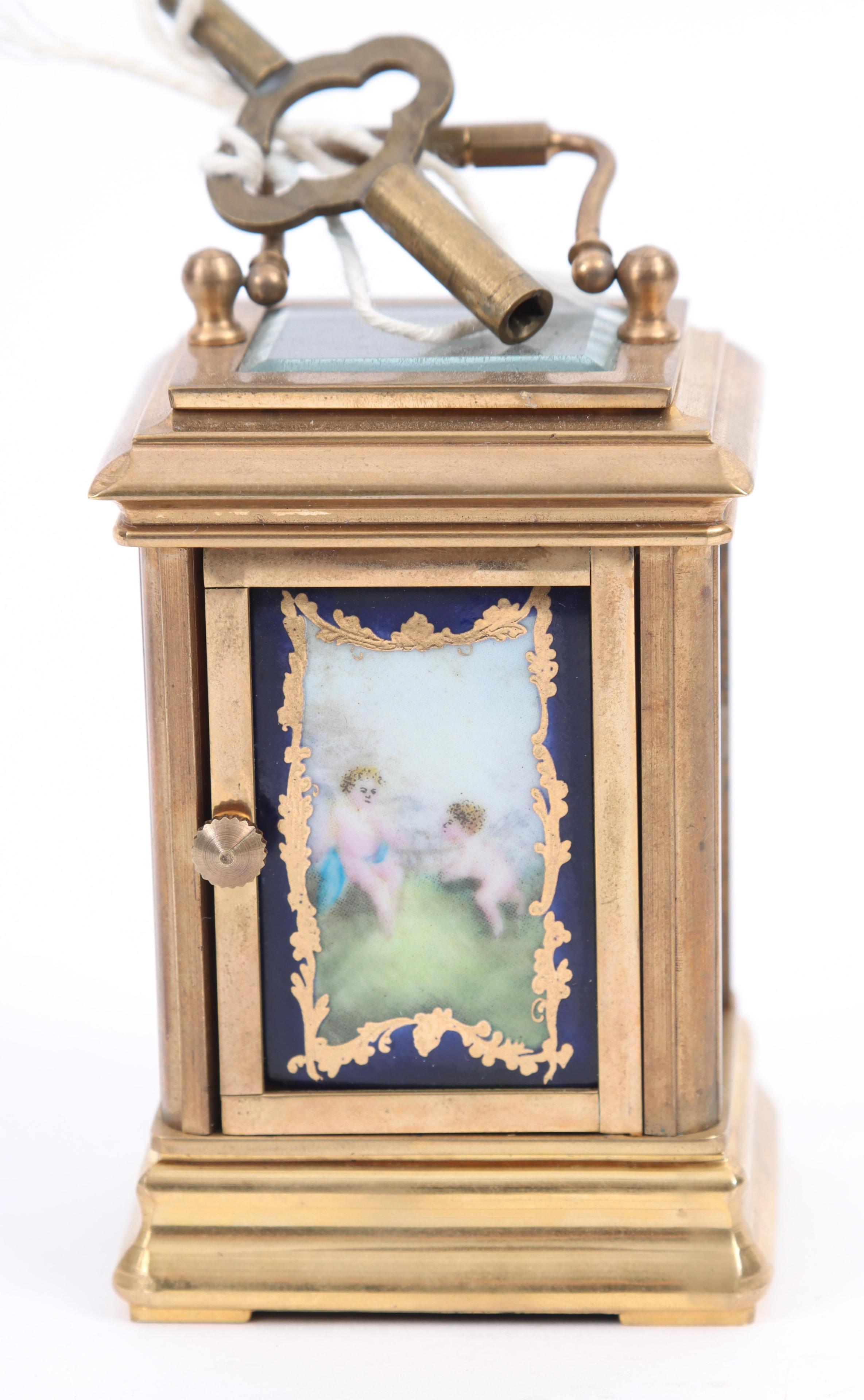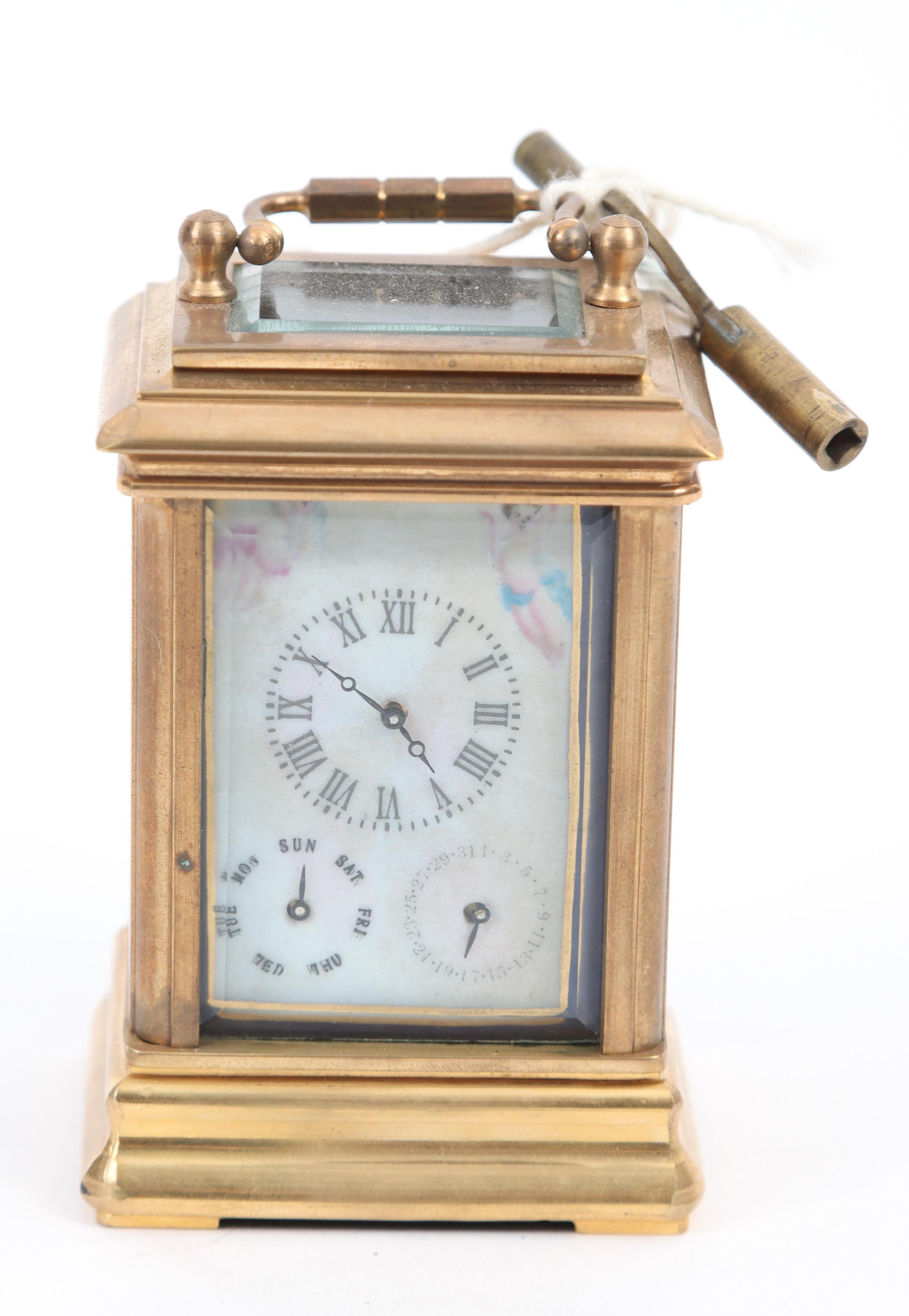 Carriage klok met 3 wijzerplaten en porseleinen plaquettes, h.9 cm.
