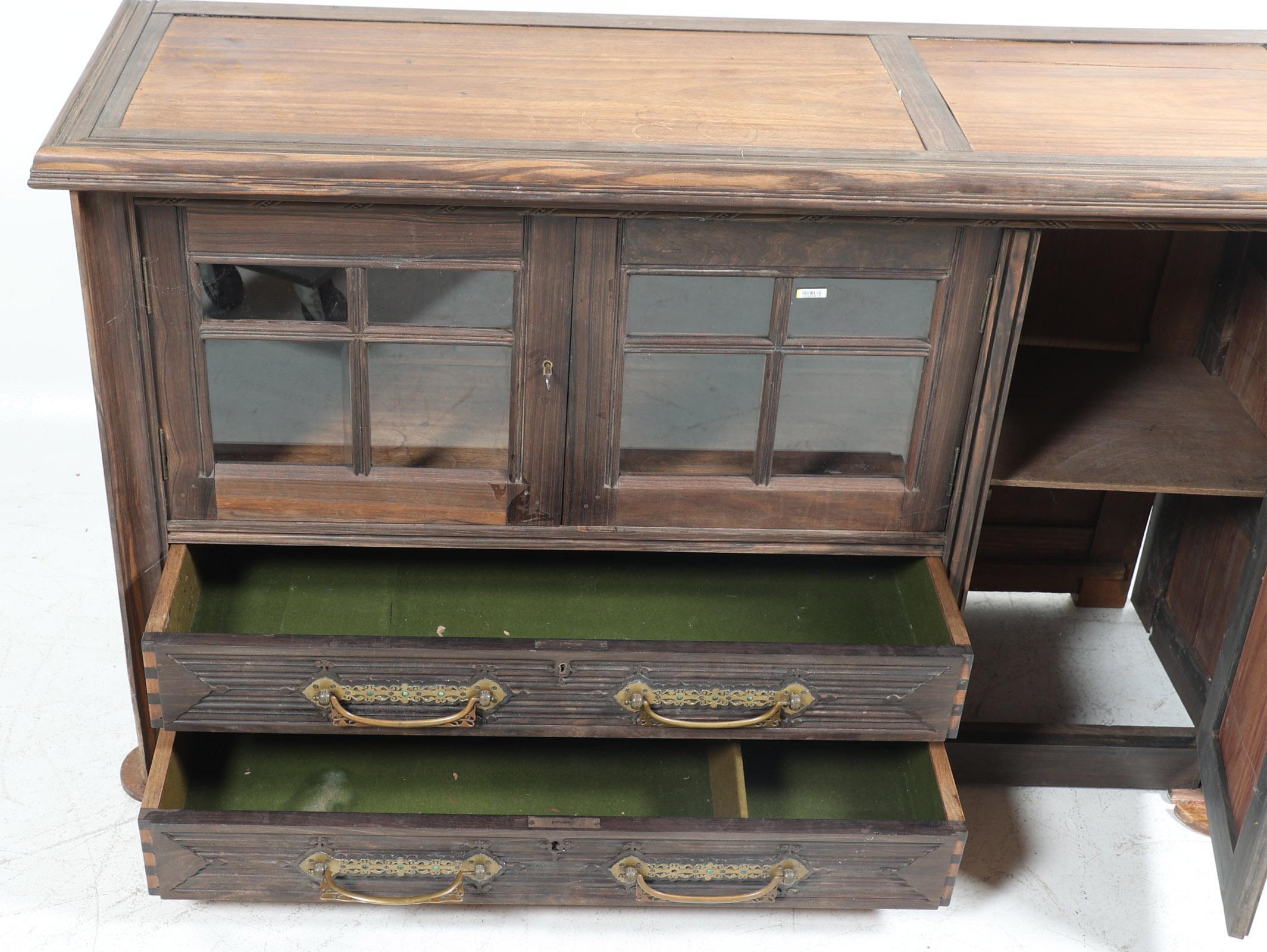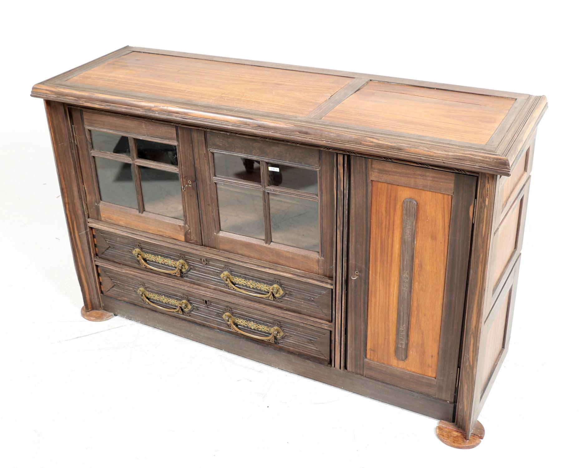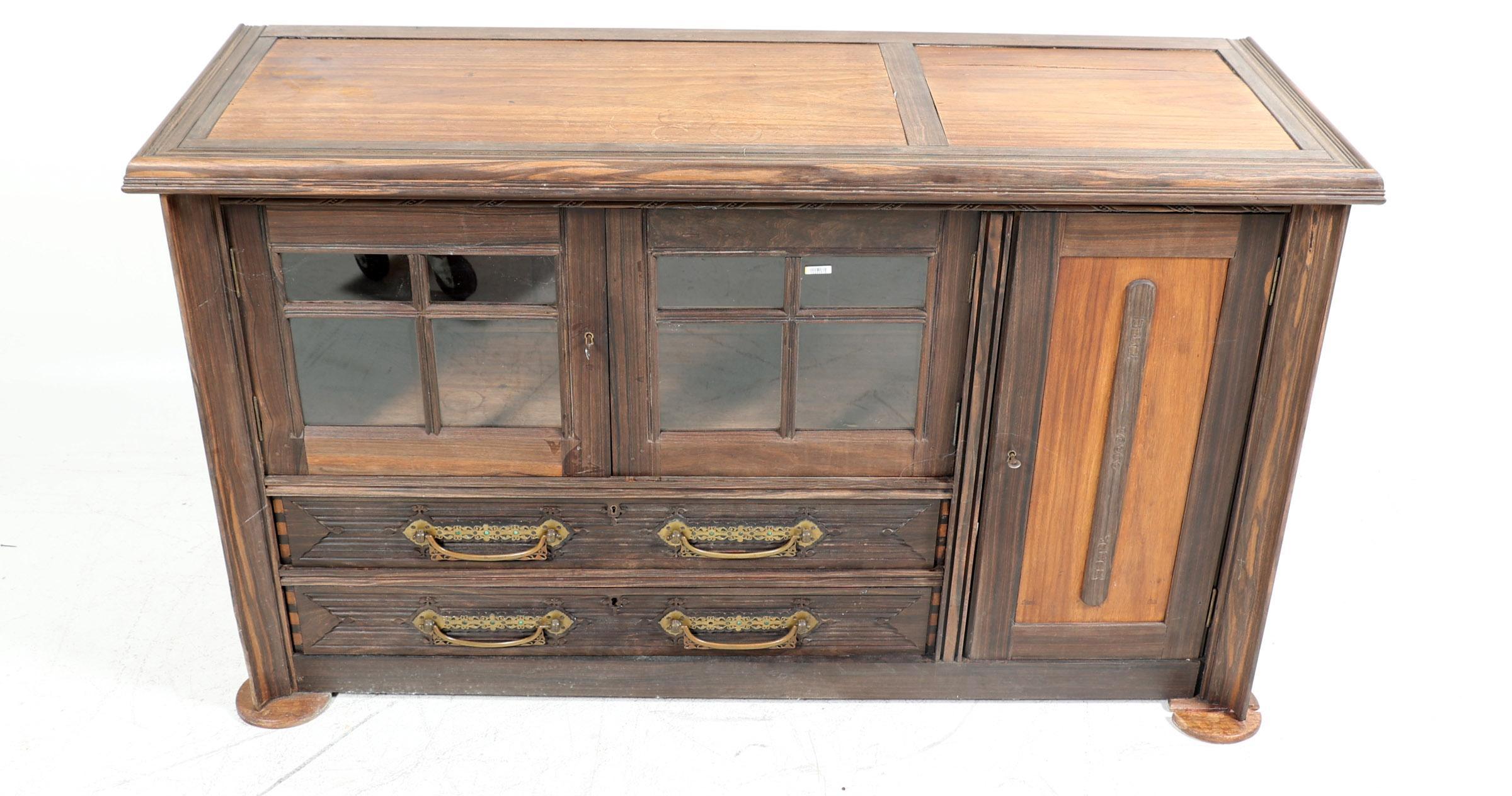 Een dressoir, ontworpen door Theo Nieuwenhuis, 1866-1951, uitvoering E.J. van Wisselingh & Co., circa 1915, coromandelhout, messing en agaat Rechthoekig blad met geprofileerde zijkanten. Aan de voorzijde twee glazen deuren met daarboven twee laden. Rechts één deur.H. 87,5 x B. 147 x D. 48 cm, Provenance:– Collection Arnold van Buuren (1873 – 1943), The Netherlands