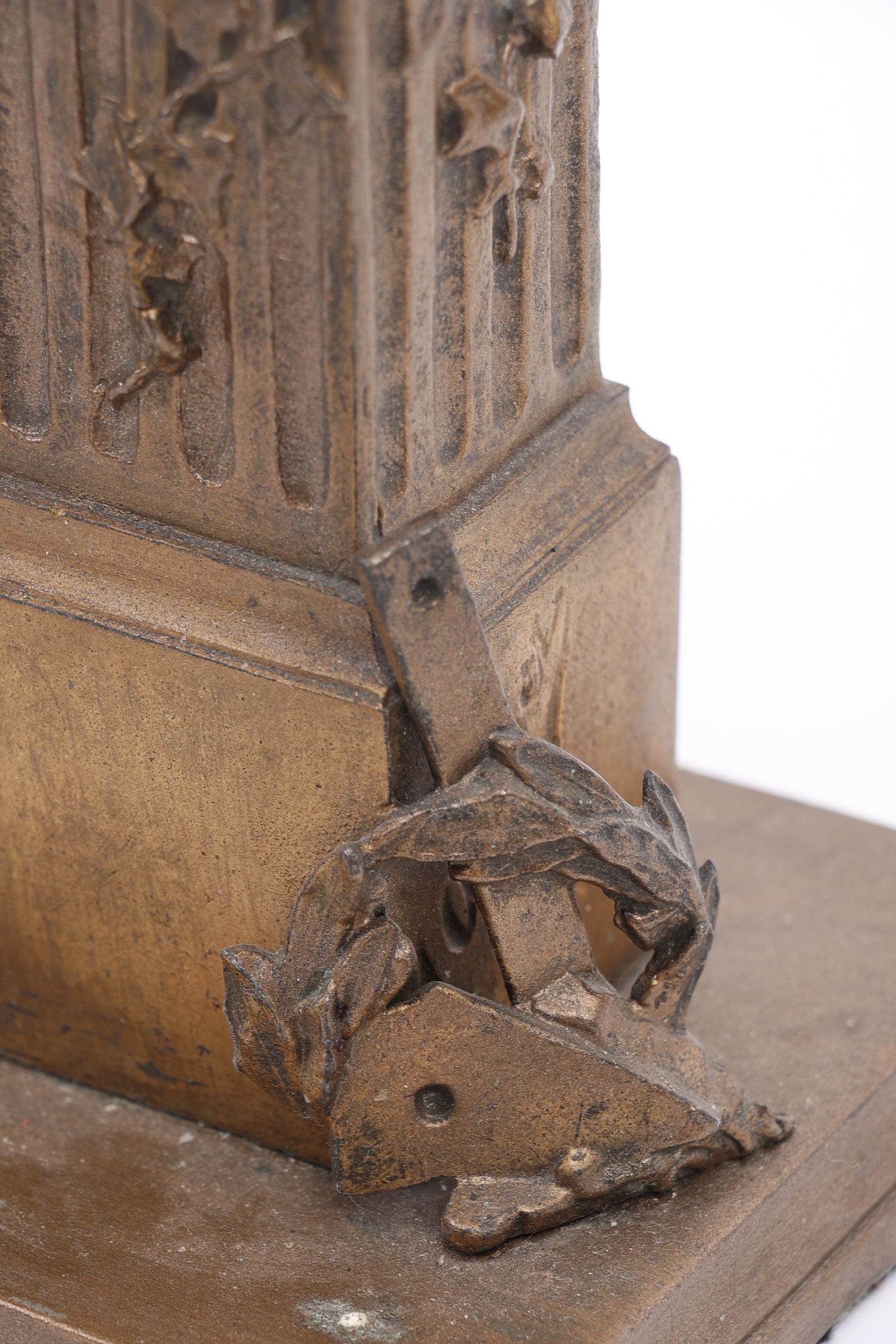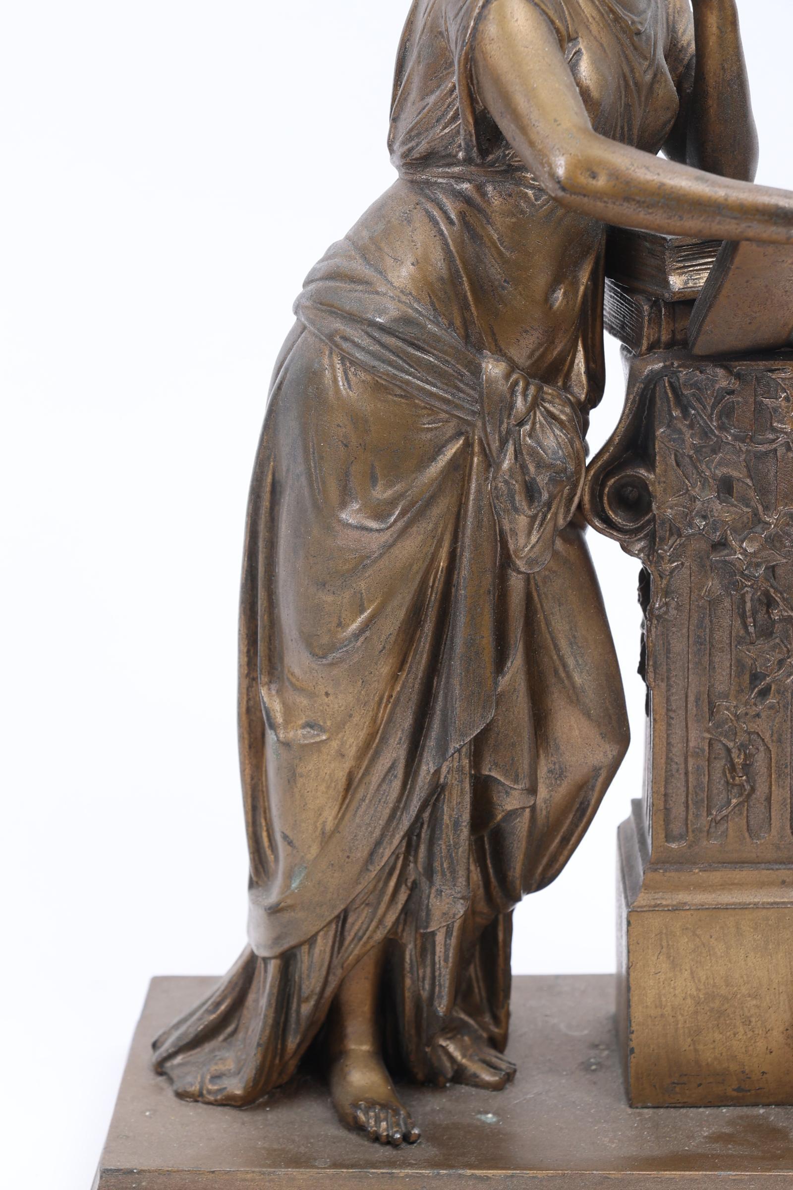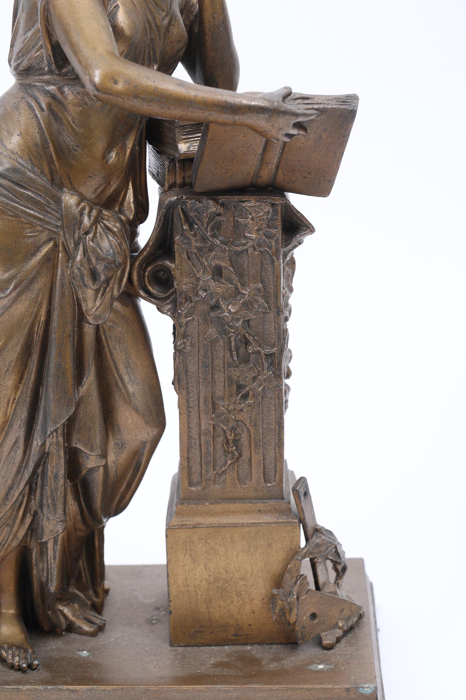 Bronskleurig legering beeld van een vrouw bij zuil, h.34 cm.