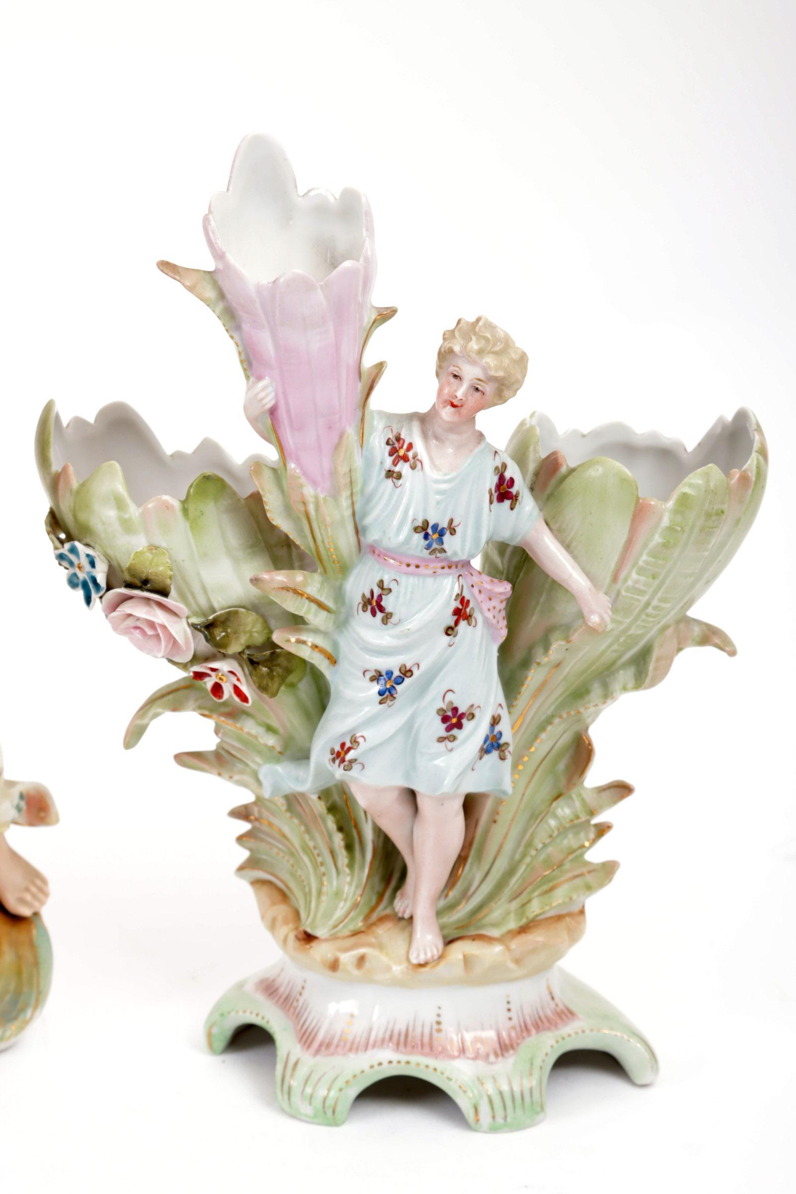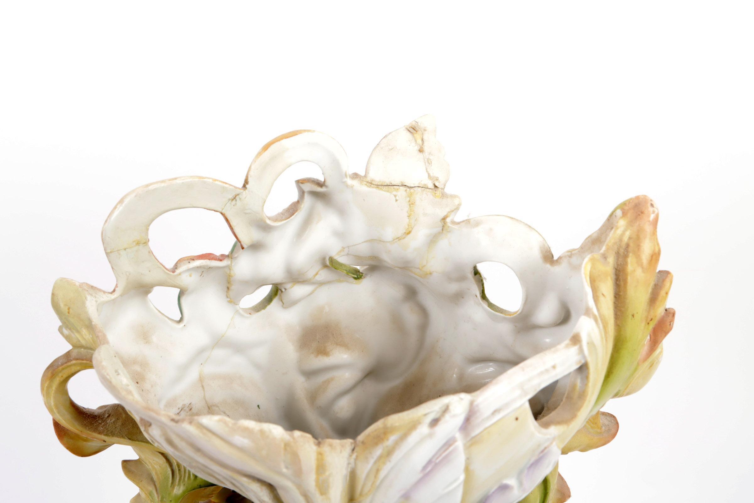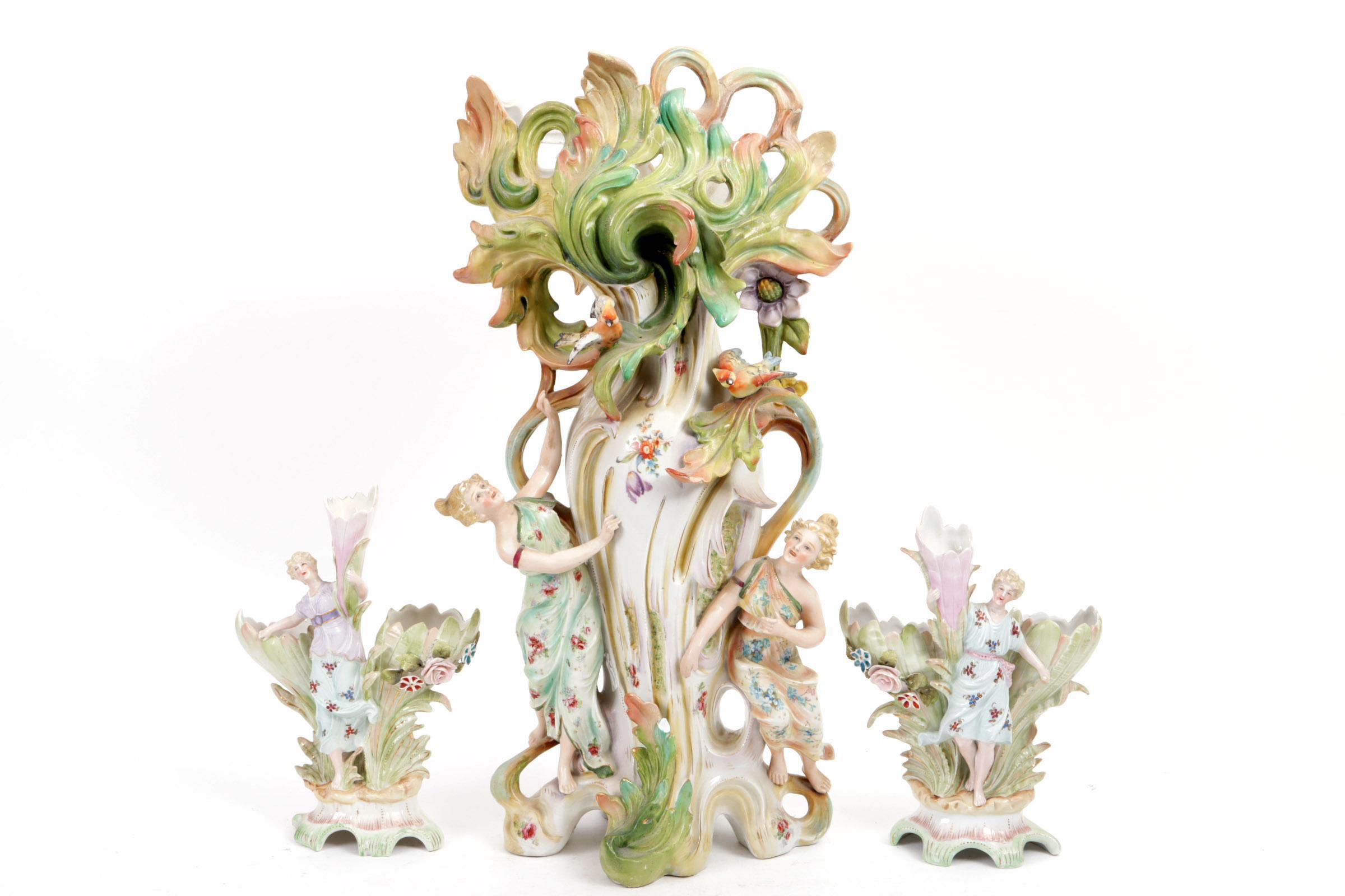 Gepolychromeerd Jugendstil-stijl vaas en 2 kleine bloemenvaasjes (defecten)