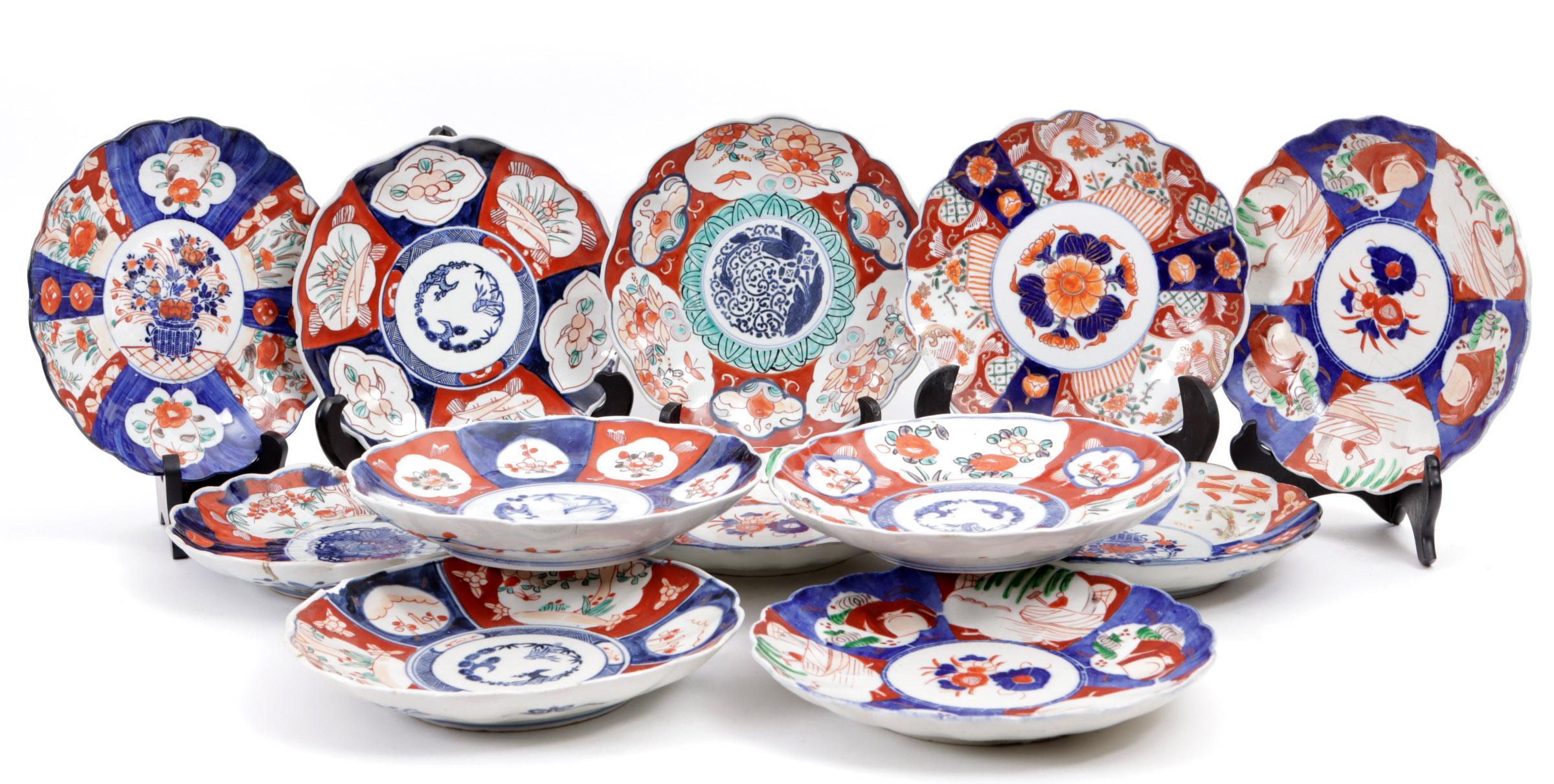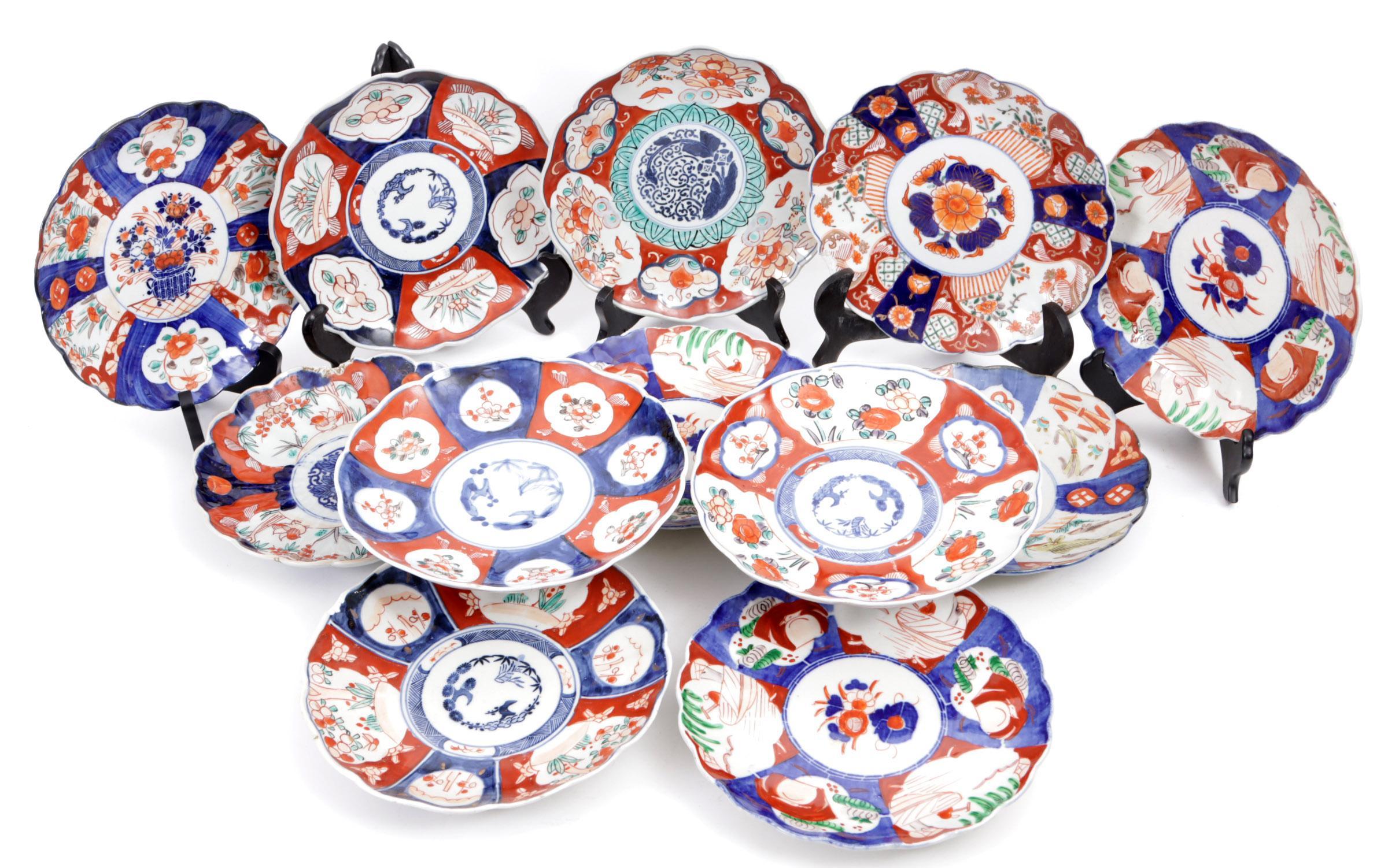 Koop 12 Imari porseleinen borden met kartelrand, diam.21 cm.