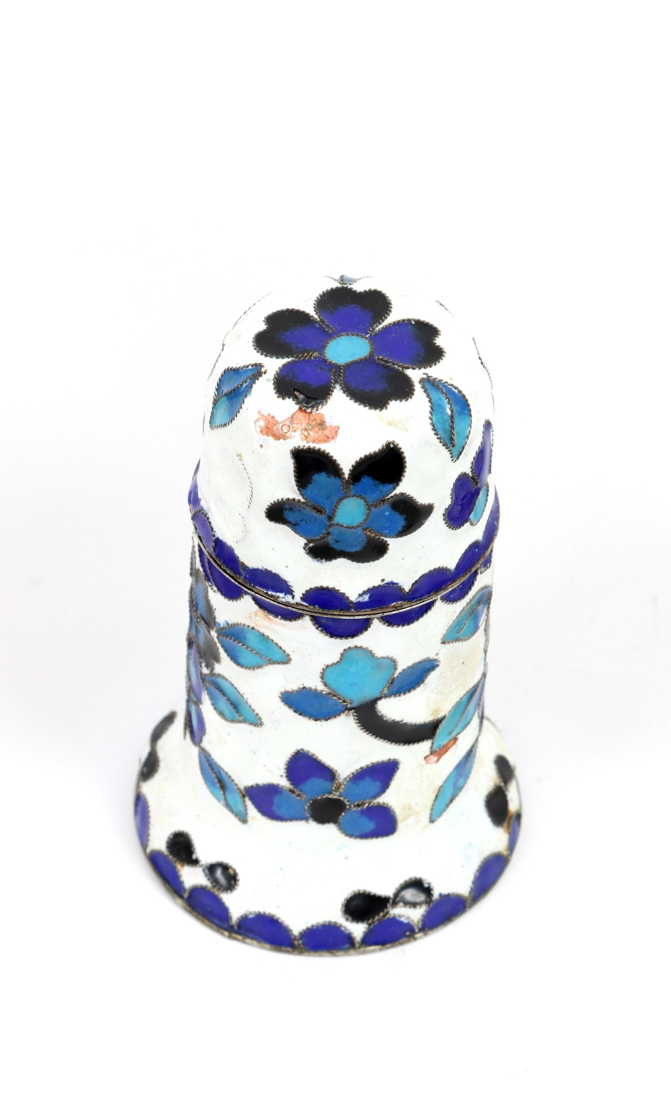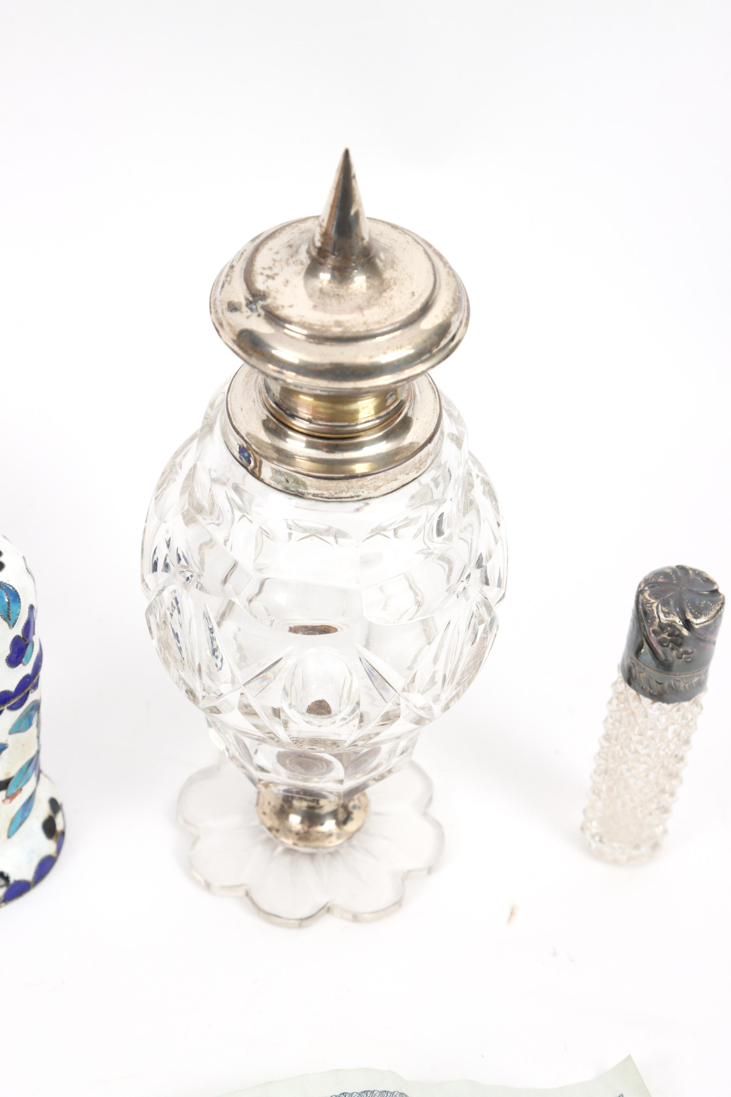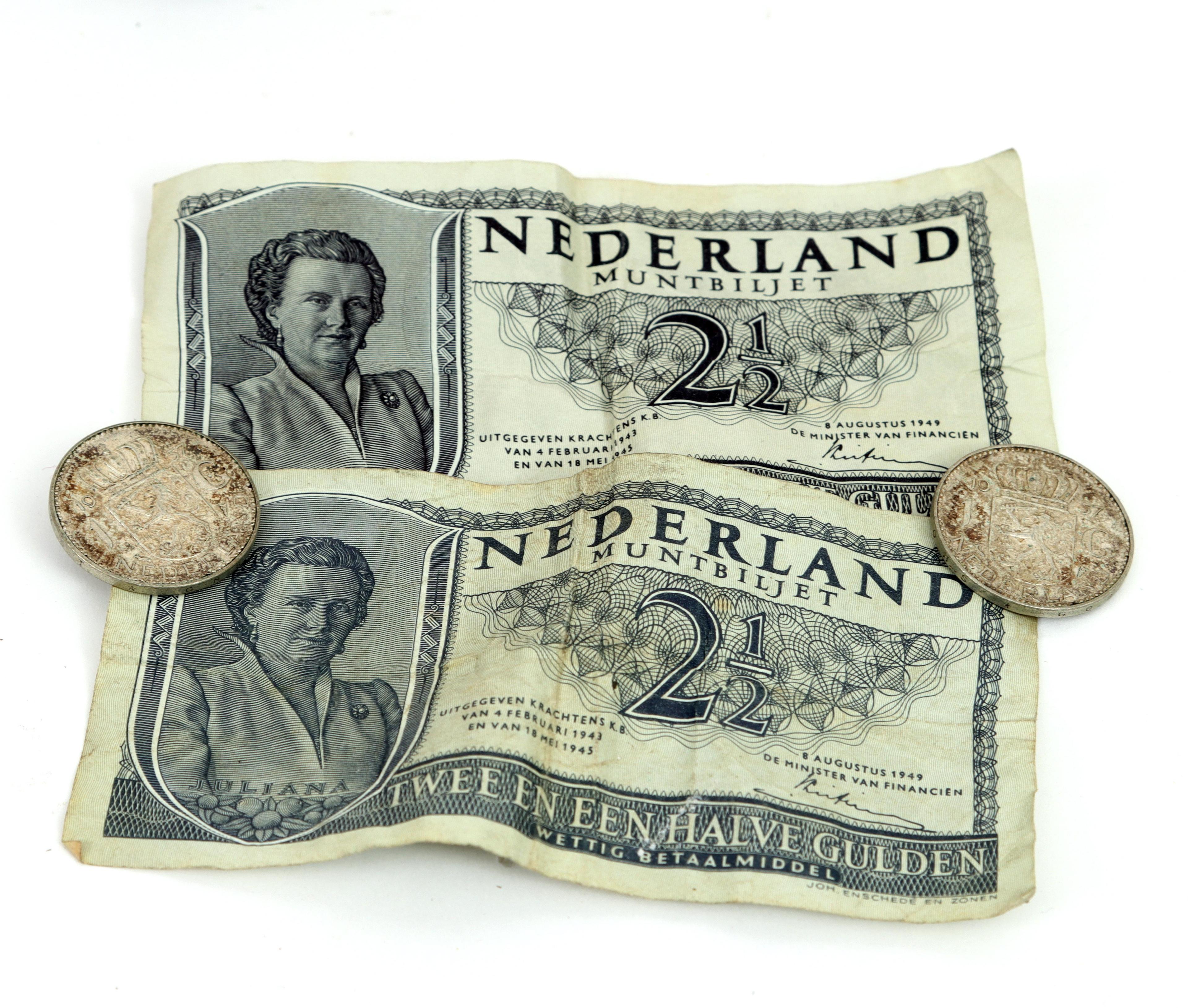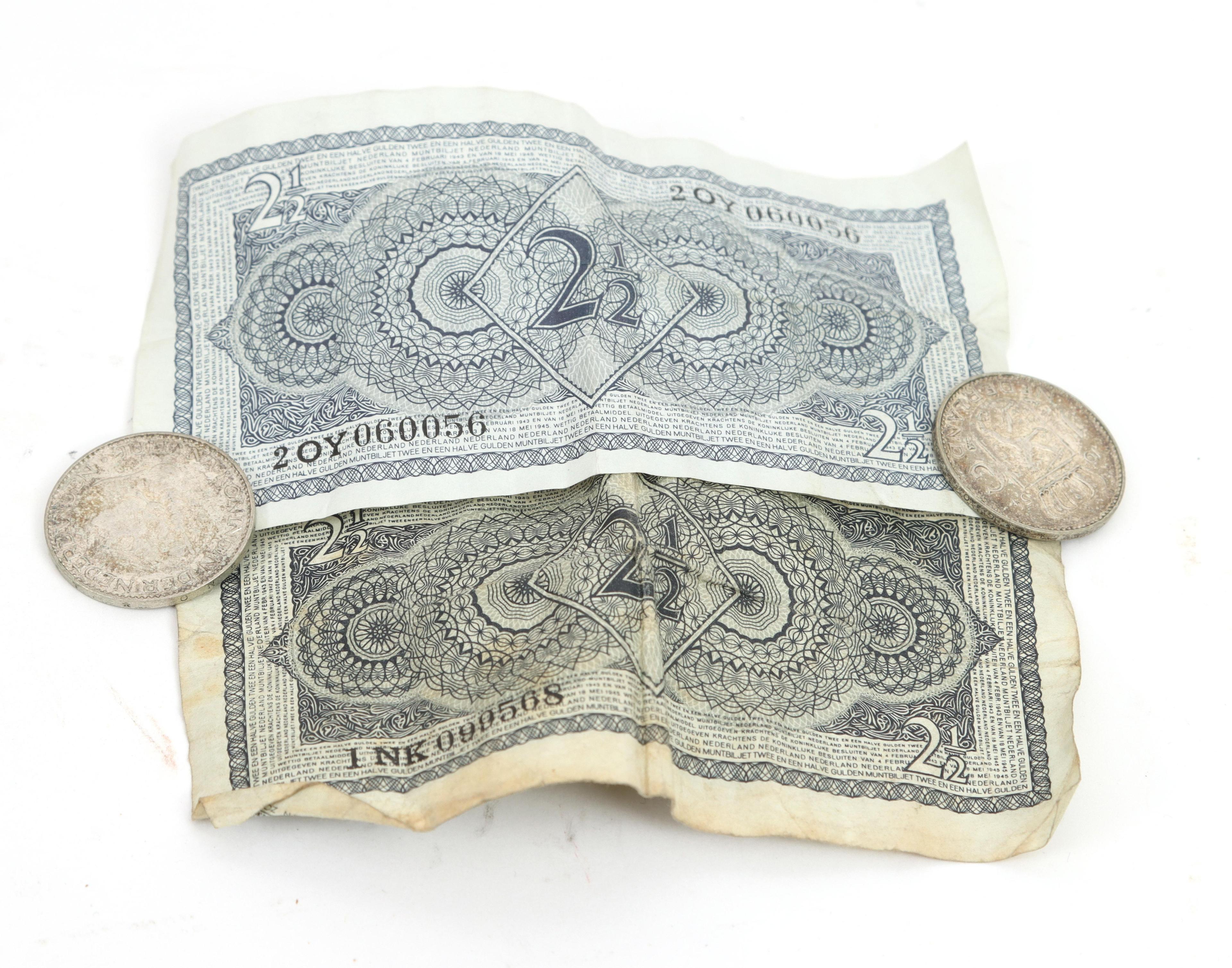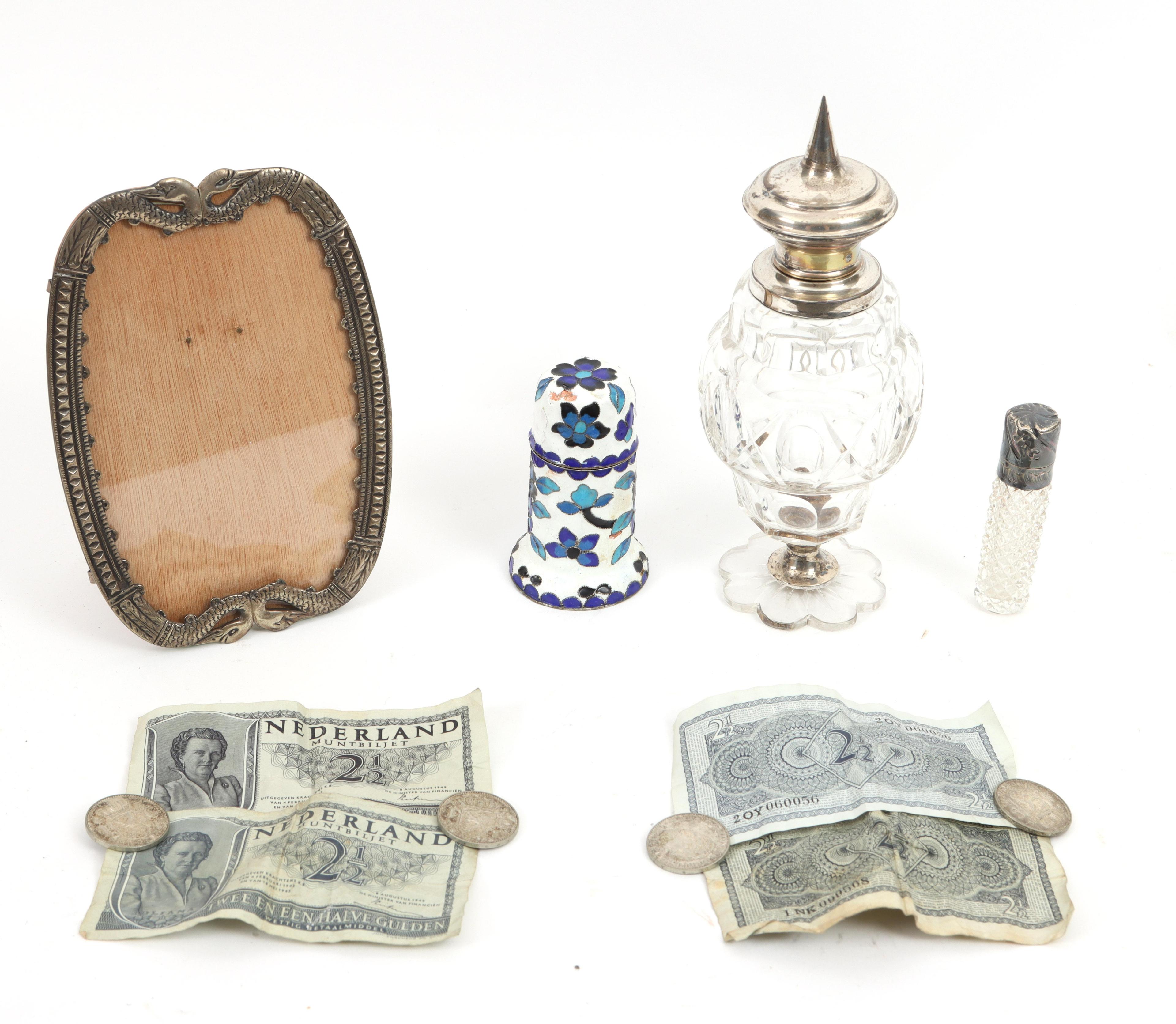 Koopje van : fotolijstje, diverse zilveren munten, papiergeld, theeflacon met zilveren dorp, parfumflacon en cloisonné vaasje