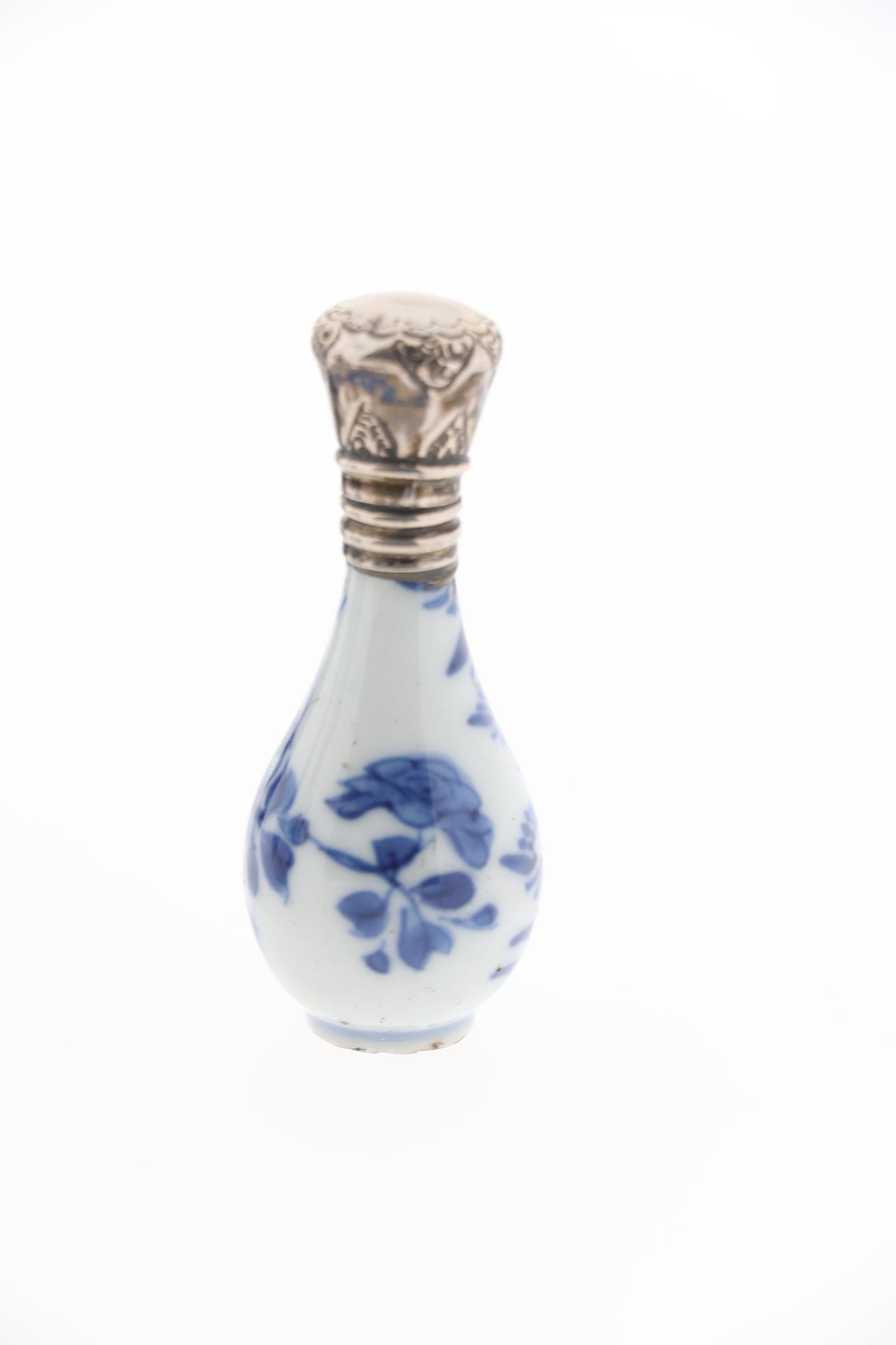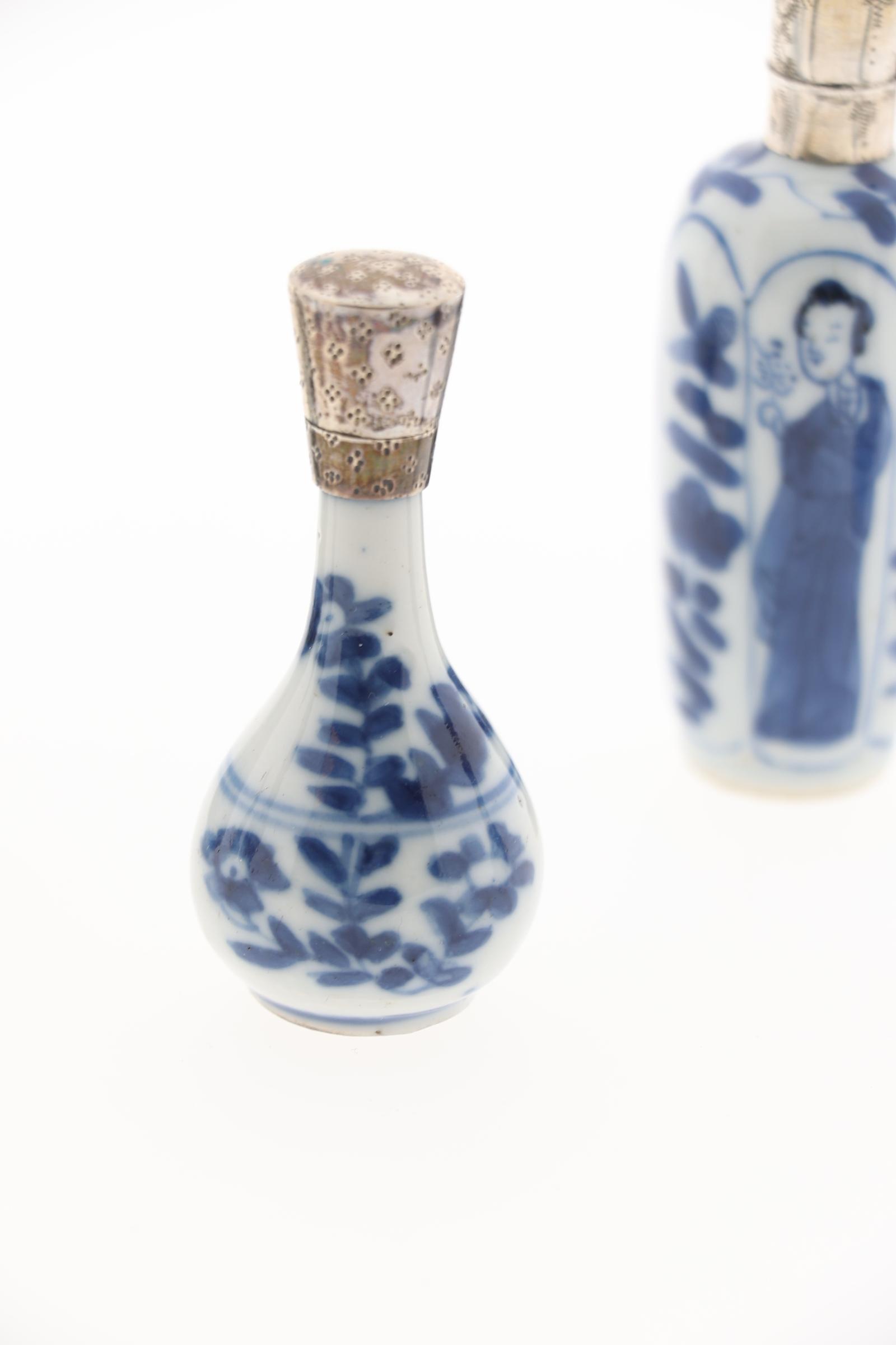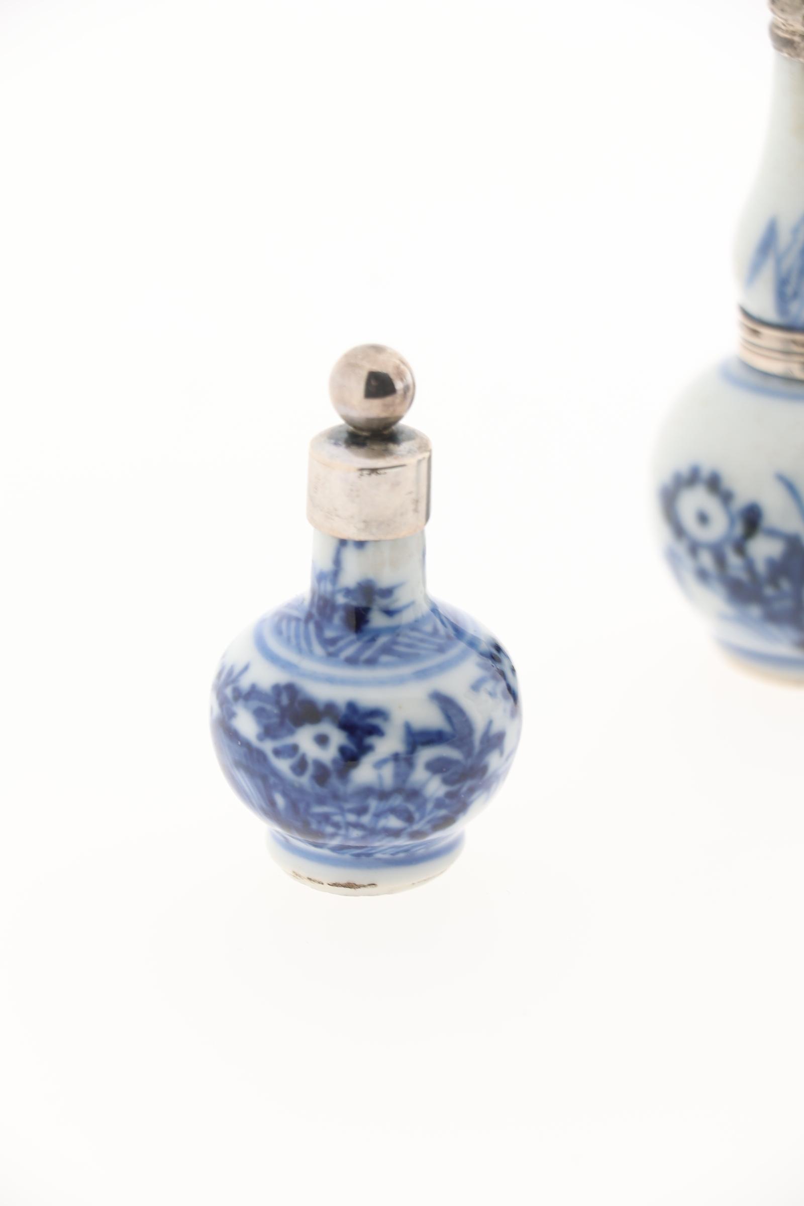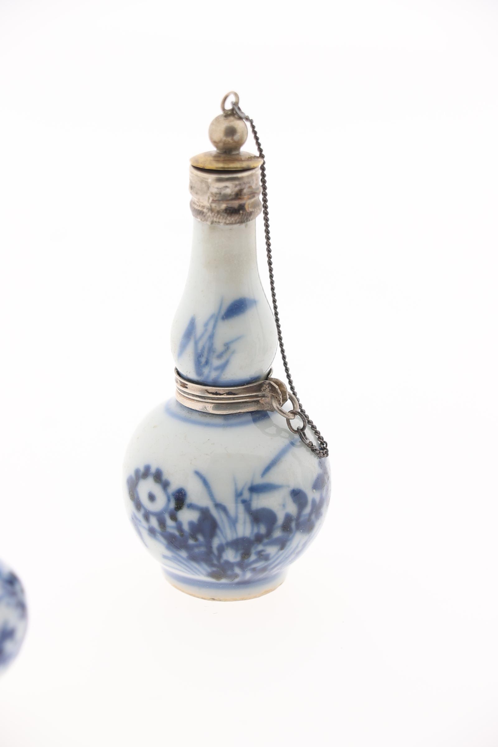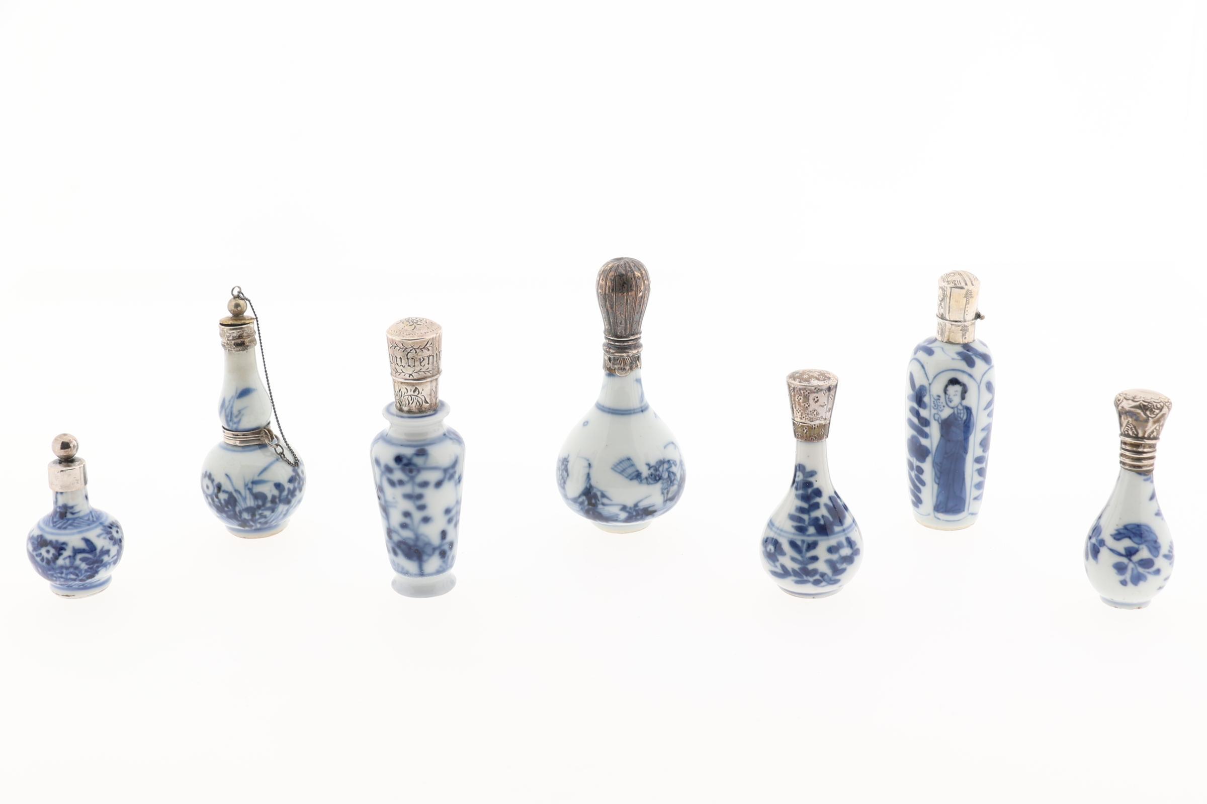 Koop van 7 diverse antieke blauw/wit gedecoreerde Chinees porseleinen odeurflacons w.o. Kangxi-periode in grote variërend van 8,5 t/m 5 cm.