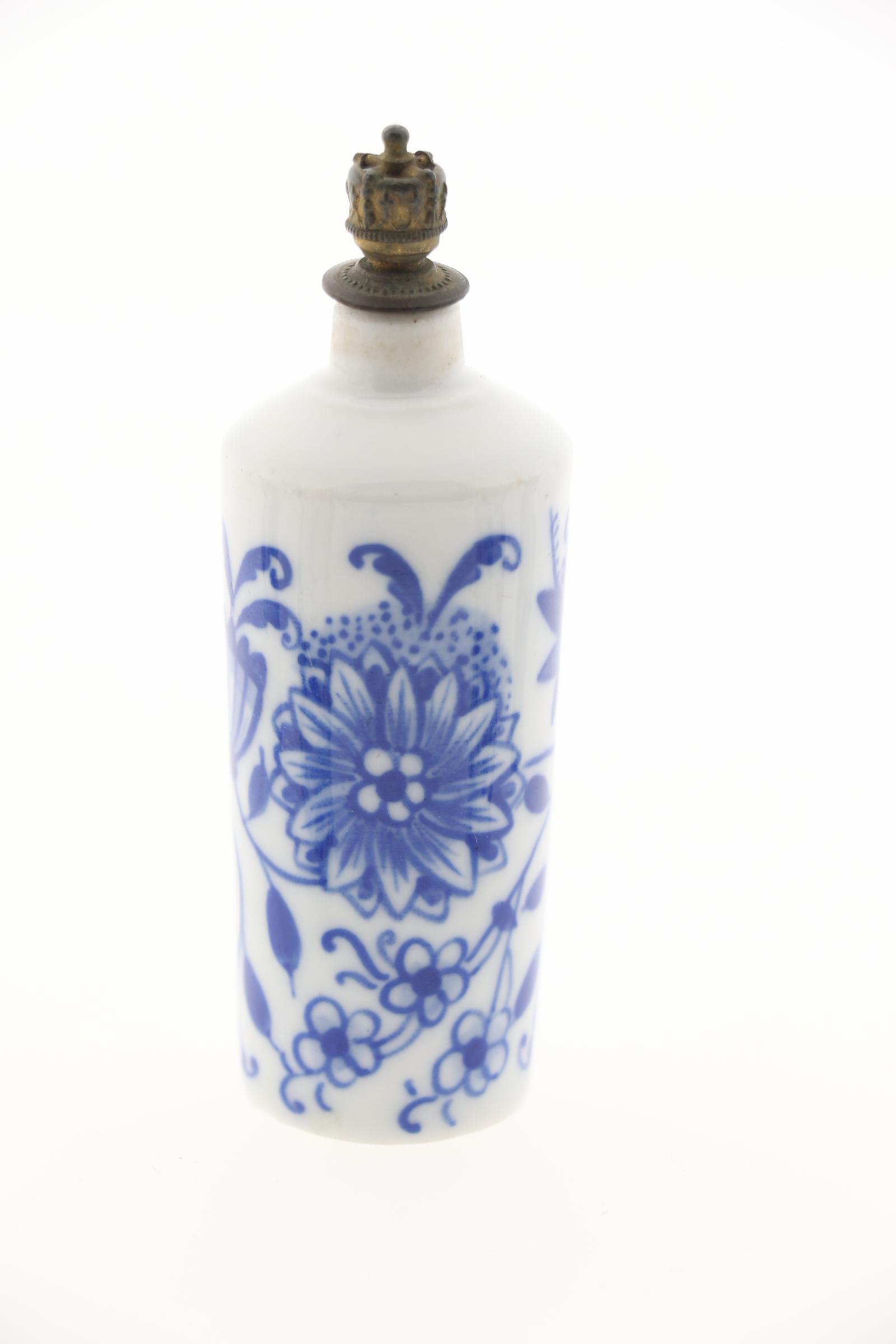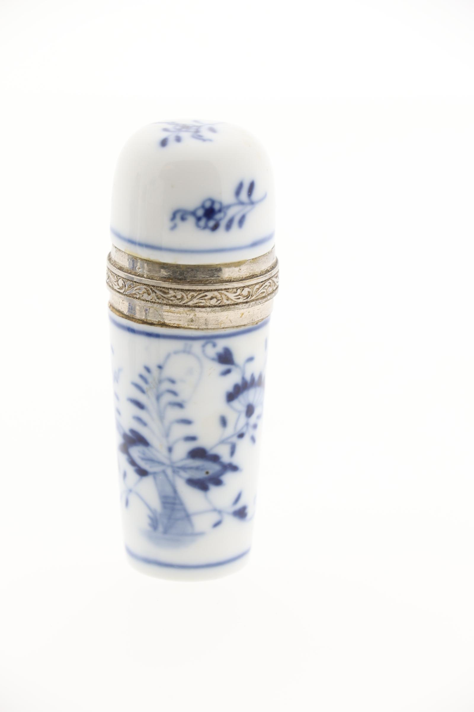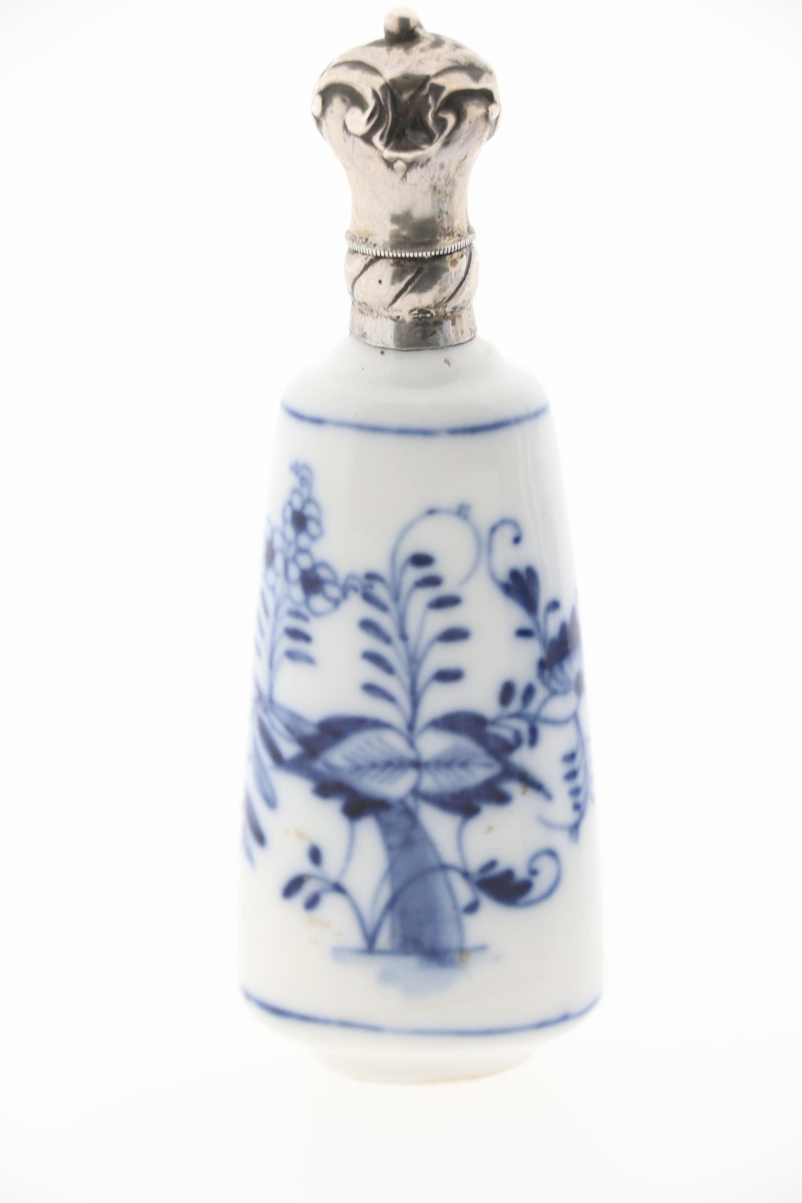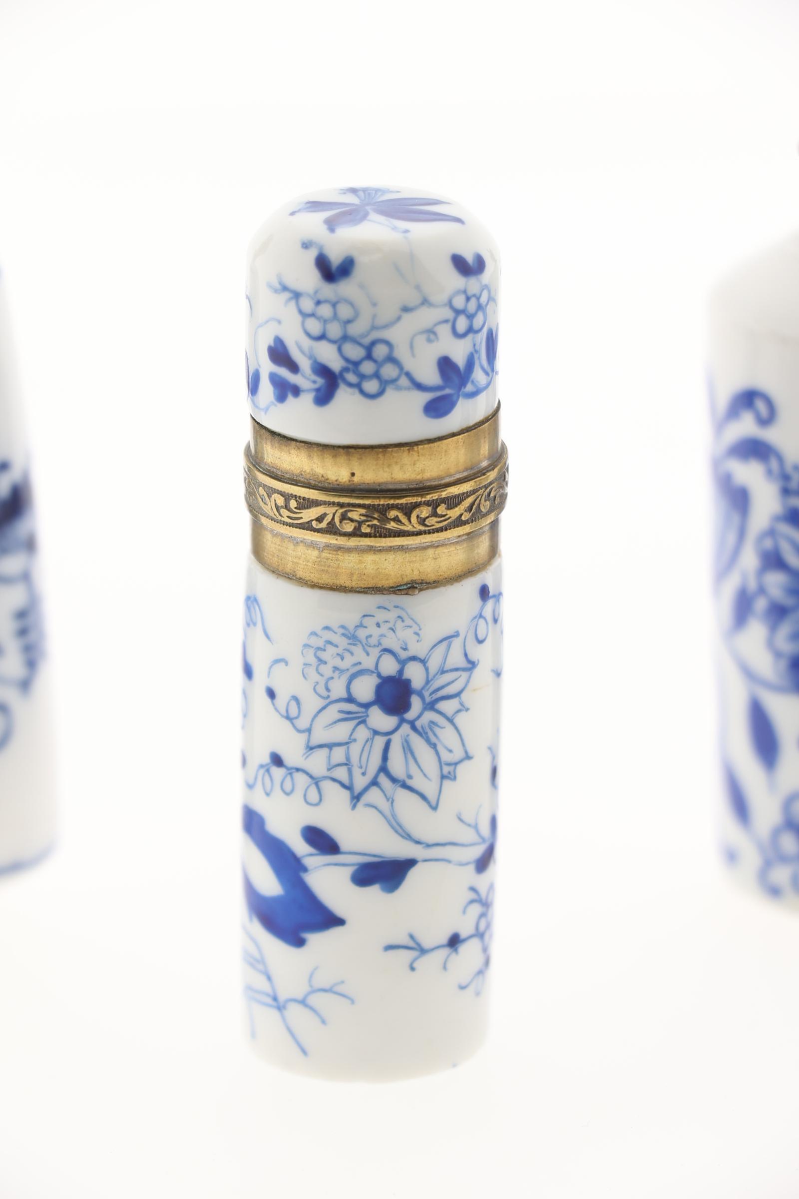 5 Blauw/wit gedecoreerde porseleinen odeurflacons met zilverkleurige beslag en doppen, 19e eeuw, h.10 , 9, en 8 cm.