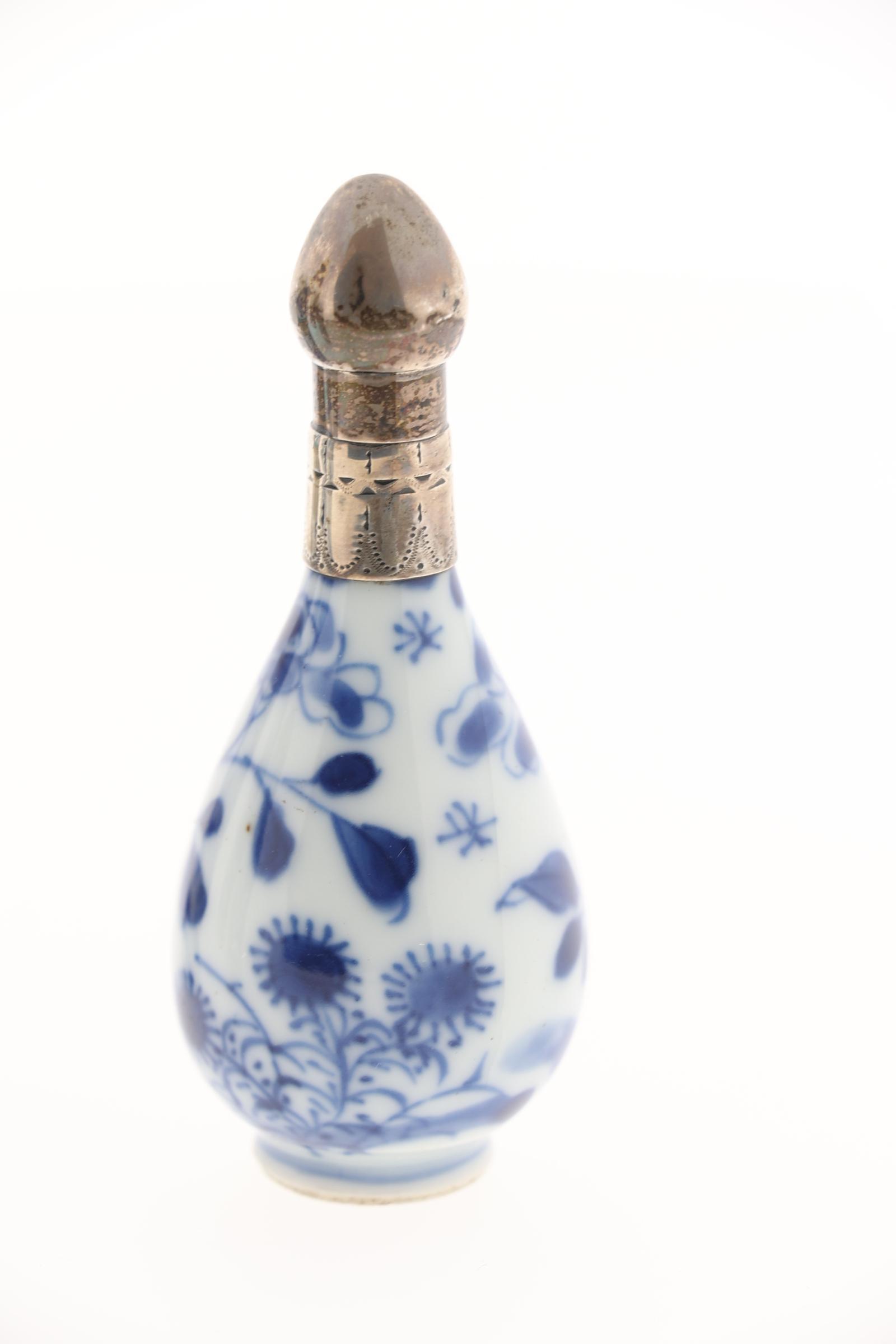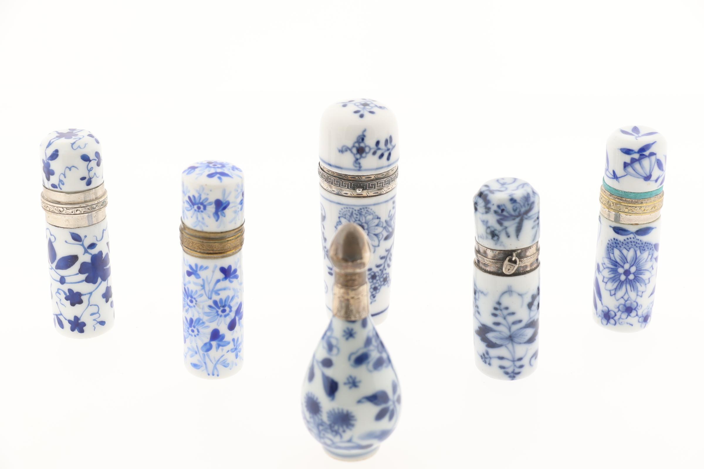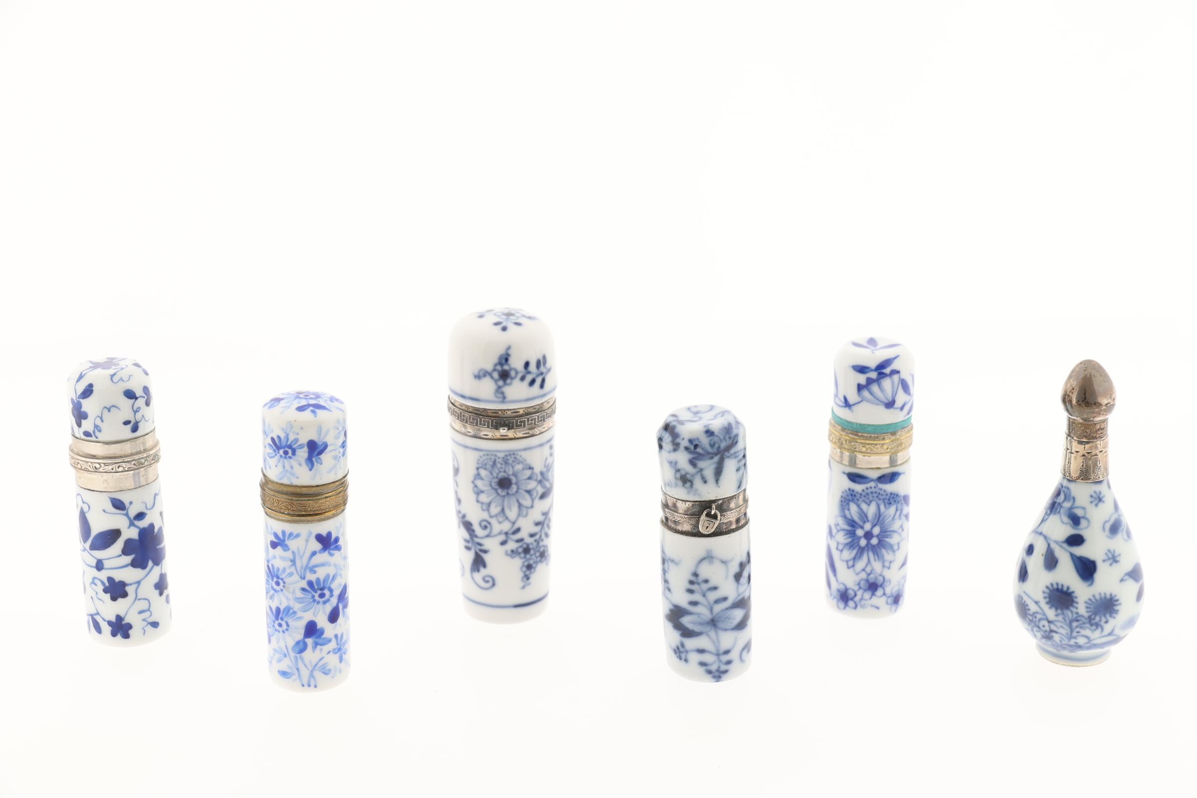 Koop van 6 blauw/wit gedecoreerde Europese en Chinese odeurflacons w.o. met zilver, 19e eeuw, ca.h.8.5 cm.