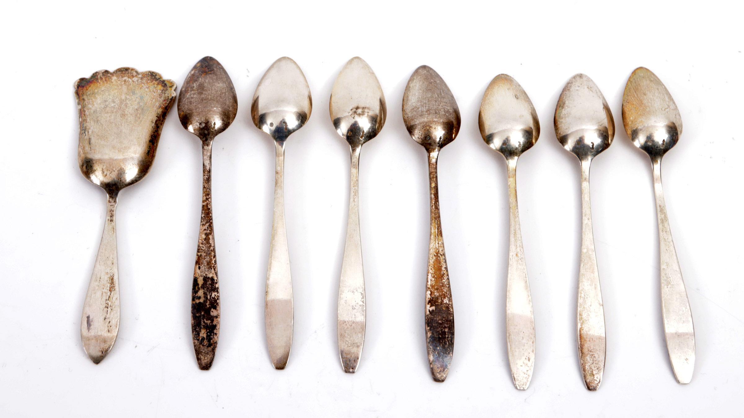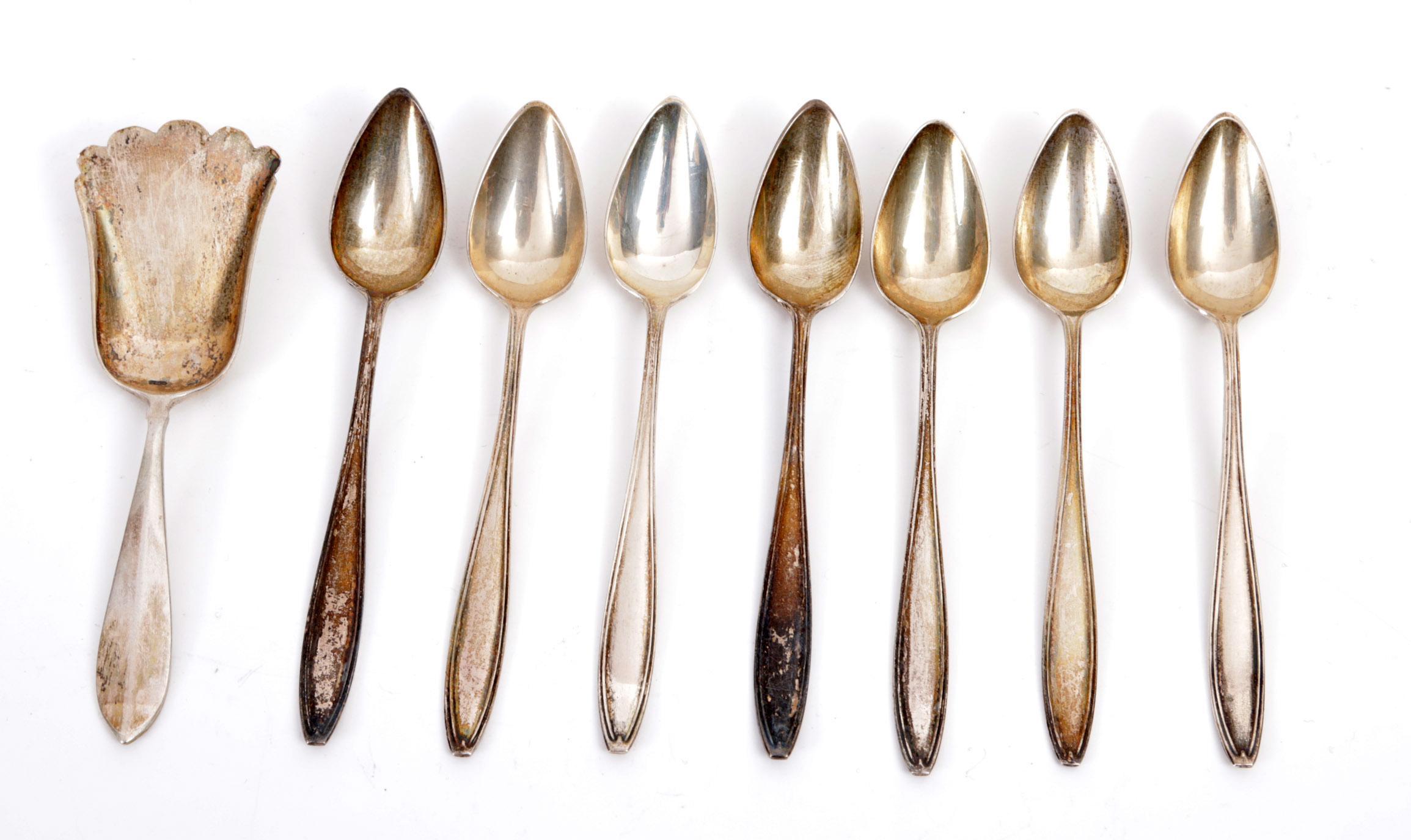Zeven 2e gehalte zilveren koffielepels en een suikerschep, 94 gram