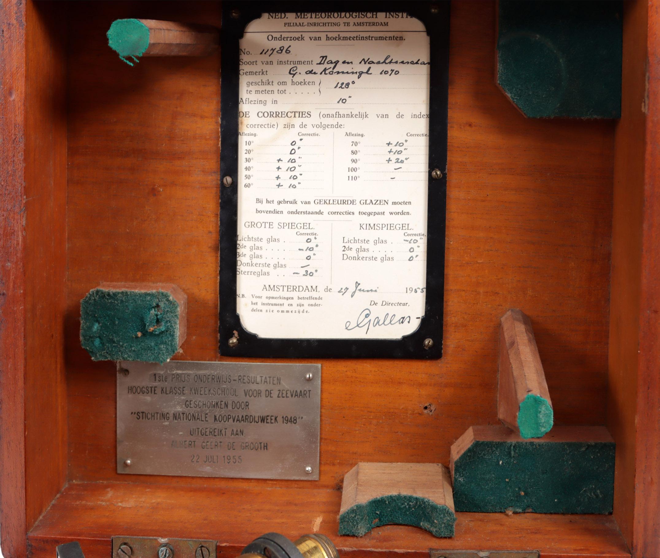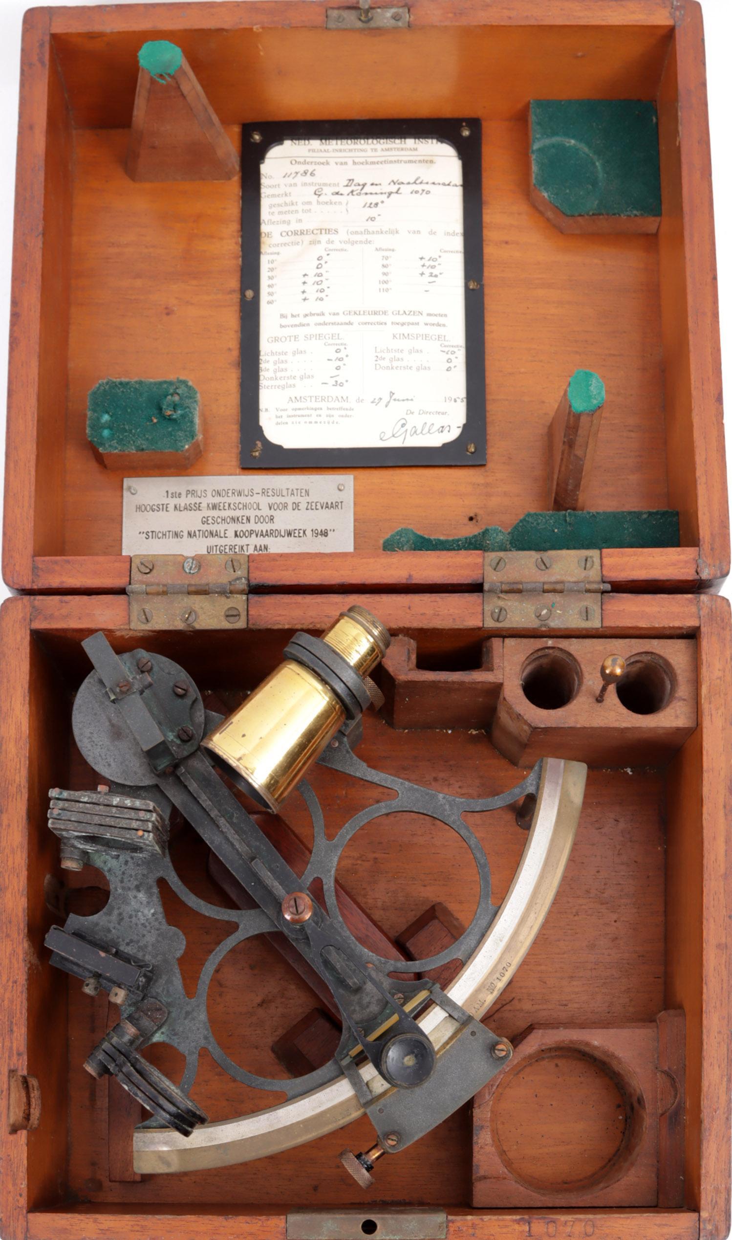 Oude Sextant in kist, 1e prijs Onderwijsresultaten hoogste klasse kweekschool voor de zeevaart, geschonken 1948, uitgereikt 1955