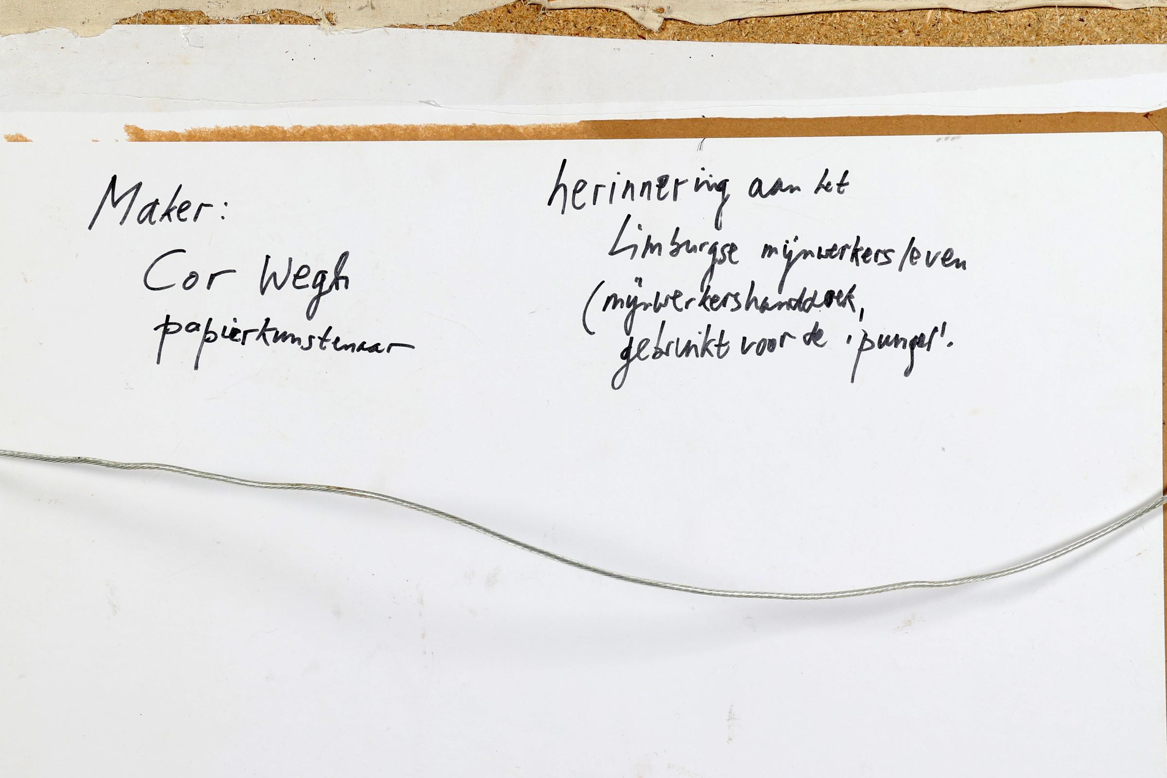 Cor Wegh, Ode aan de Limburgse mijnwerkers, voorstellend de handdoek die de mijnwerkers standaard droegen, papier mache, 77x 72 cm.