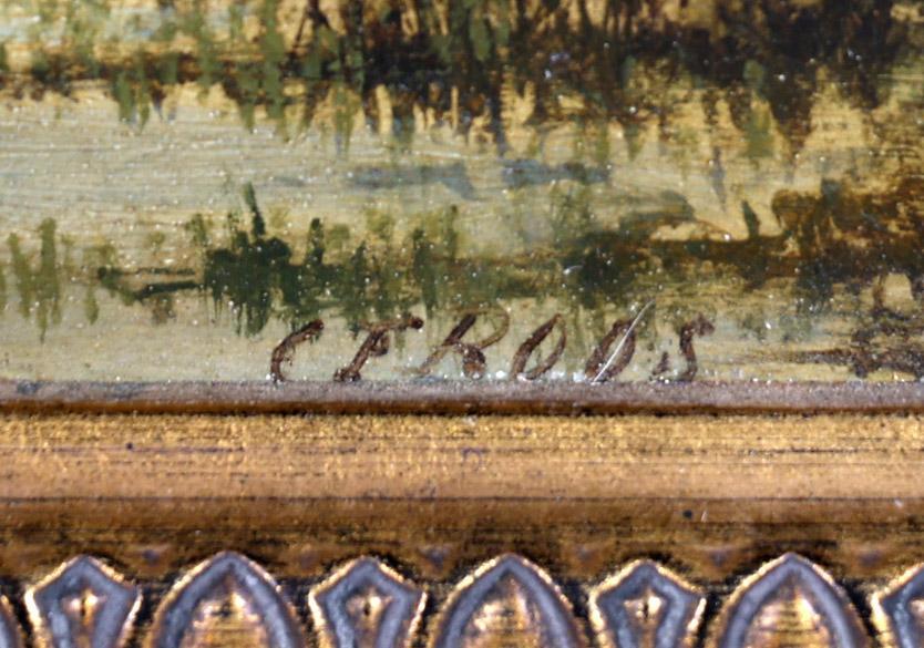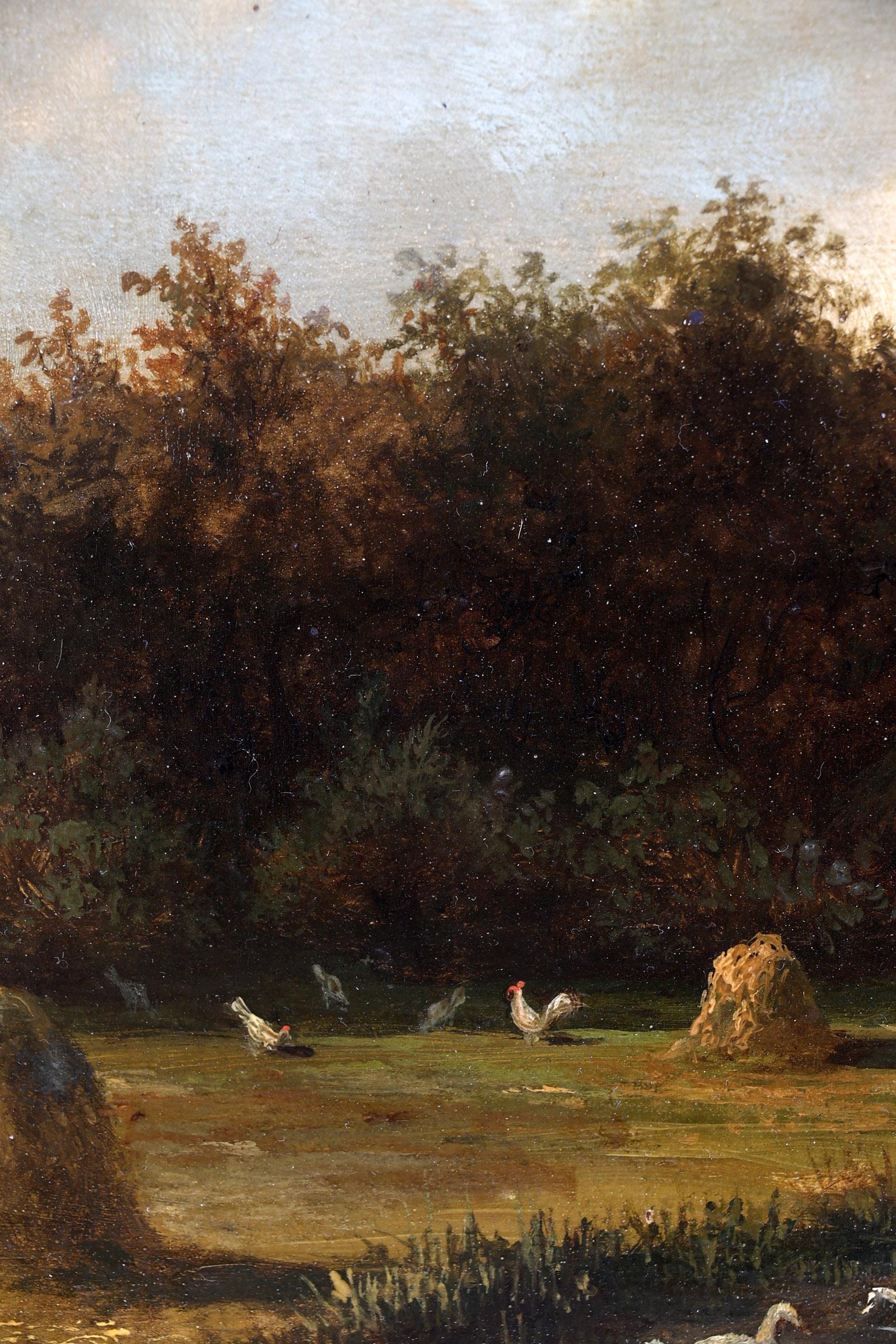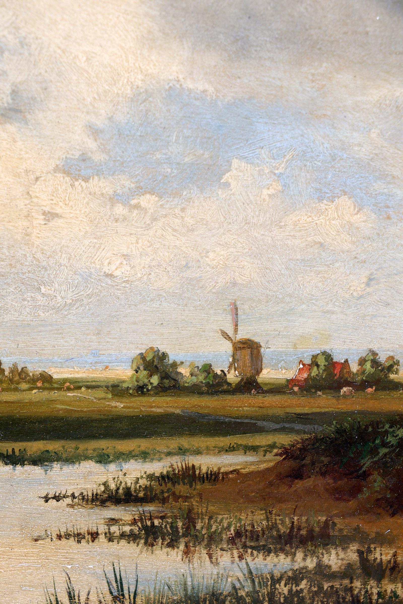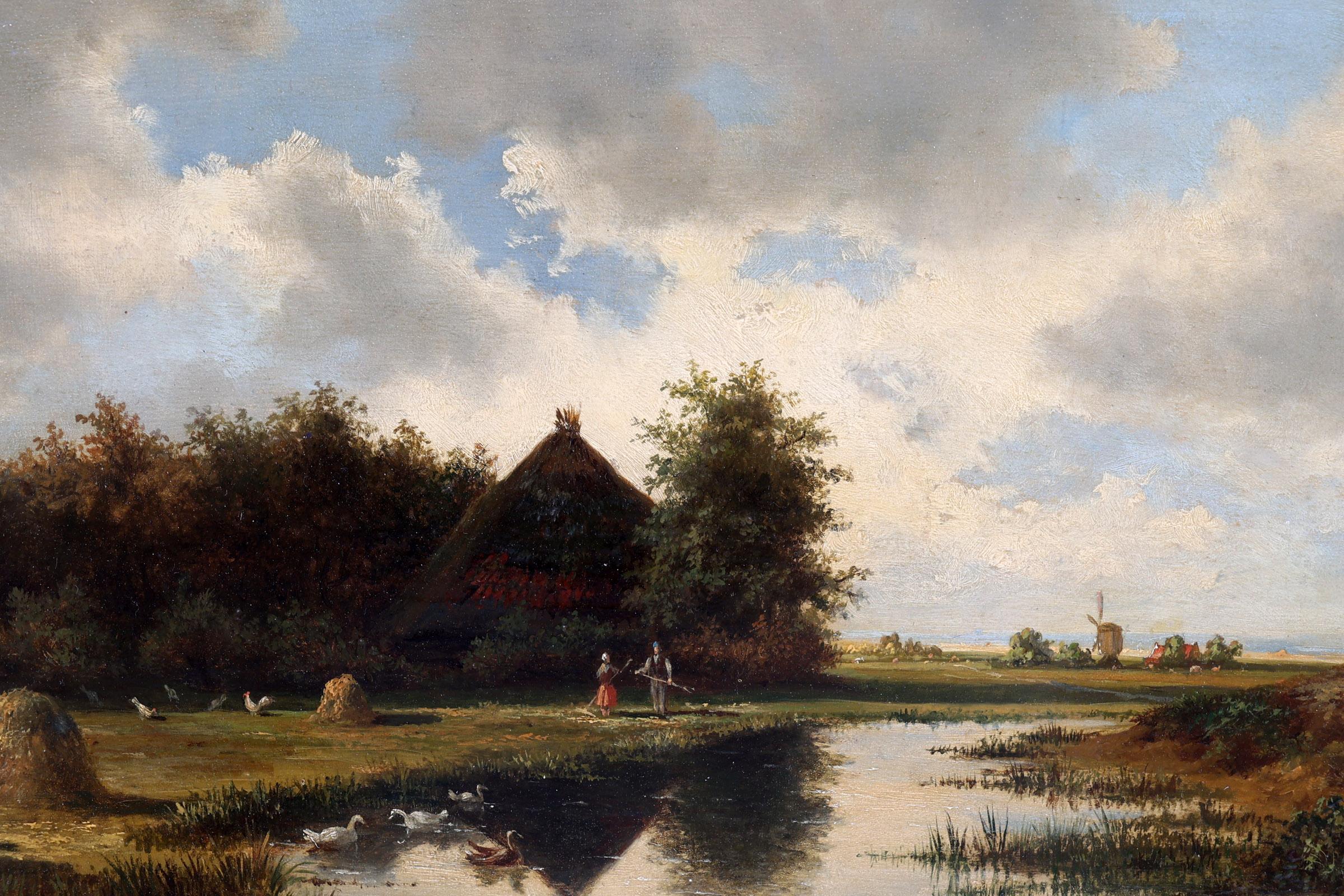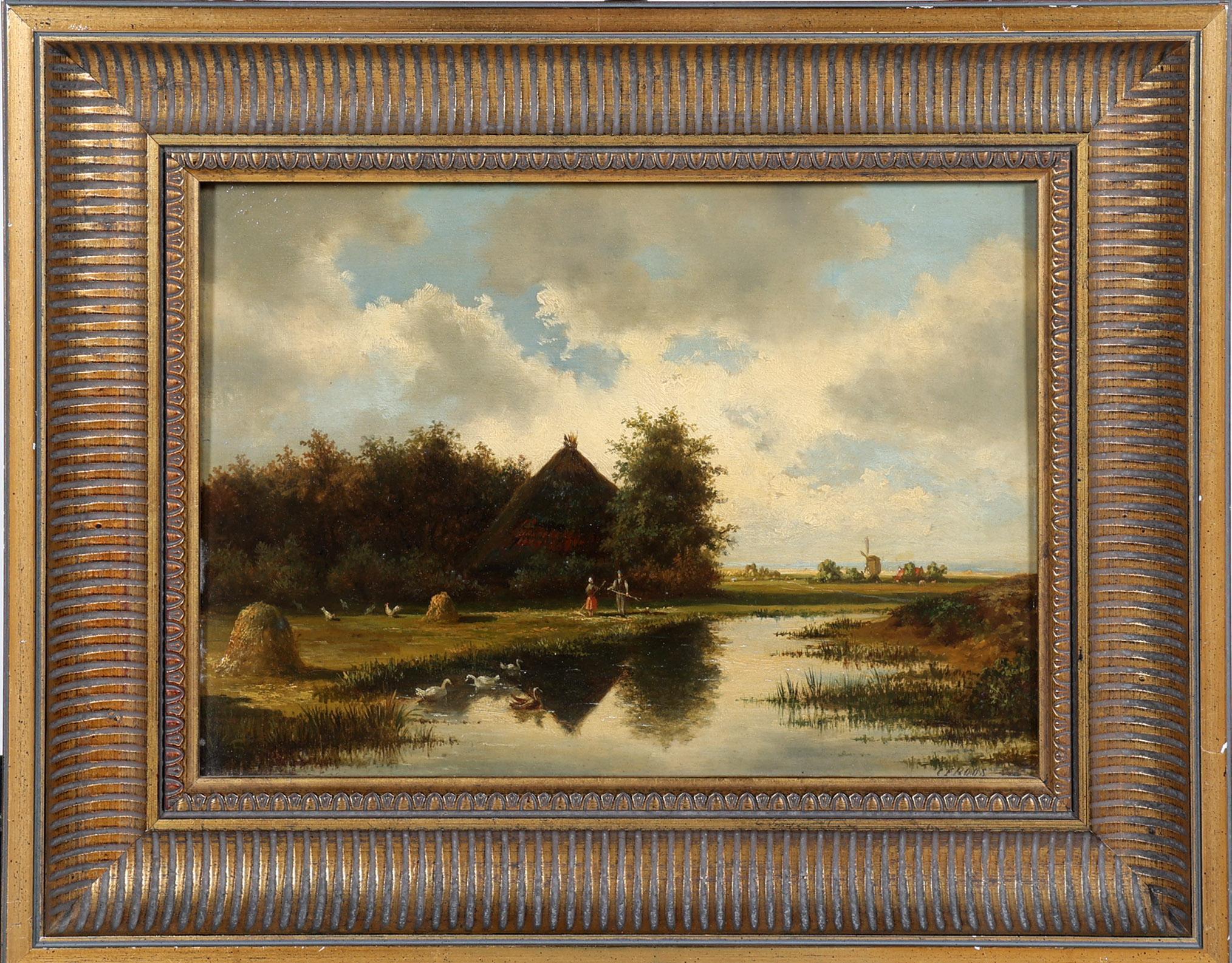 Cornelis Francois Roos (1802-1884), Waterrijk landschap met boer en boerin voor boerderij, olieverf op paneel, 36,5 x 26,5 cm.