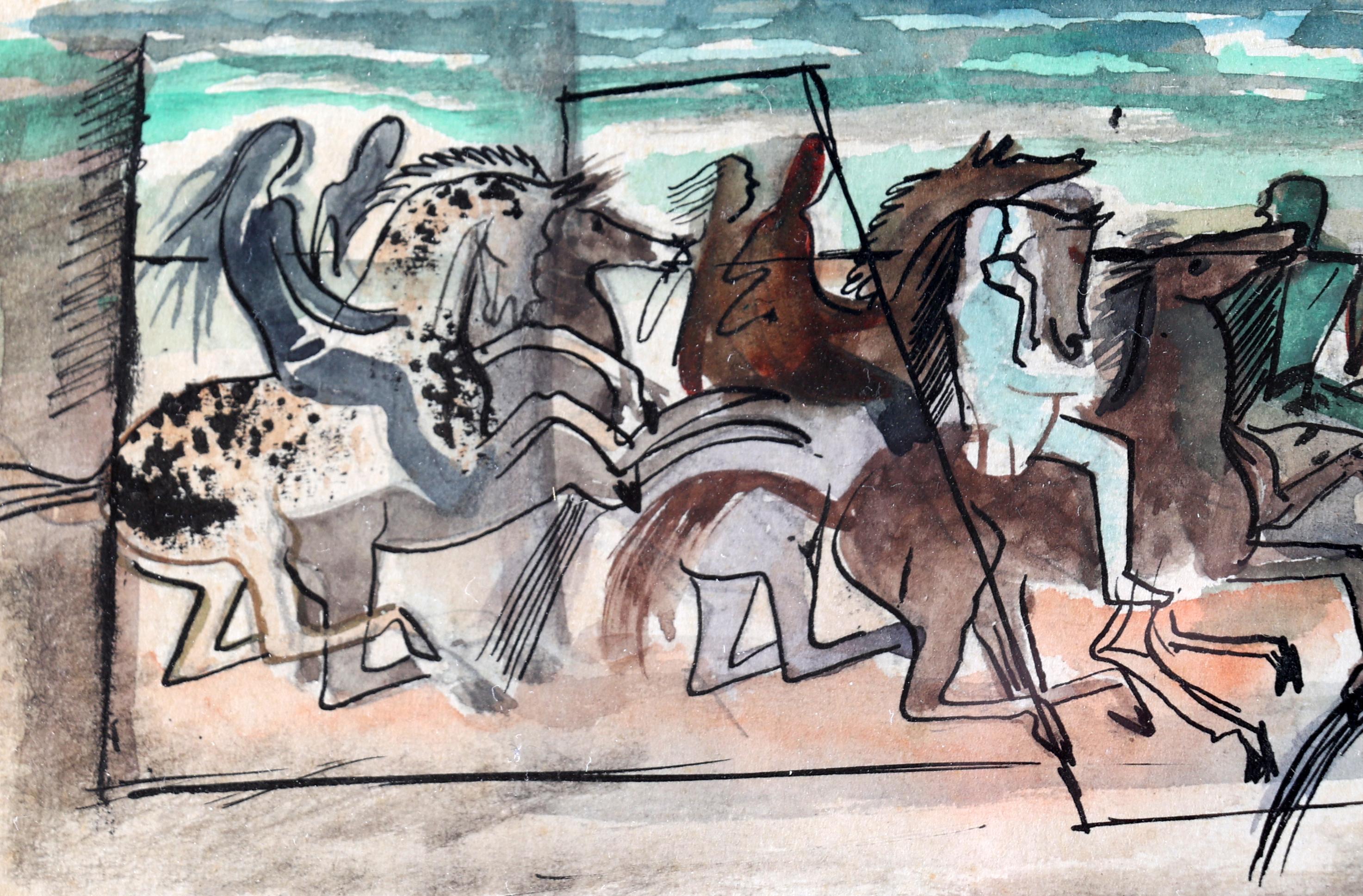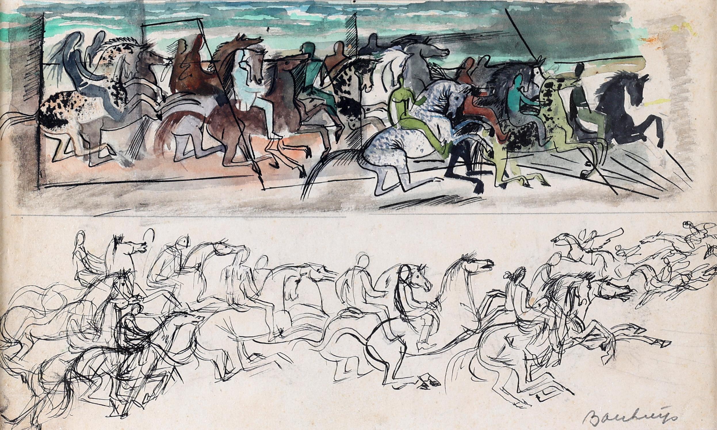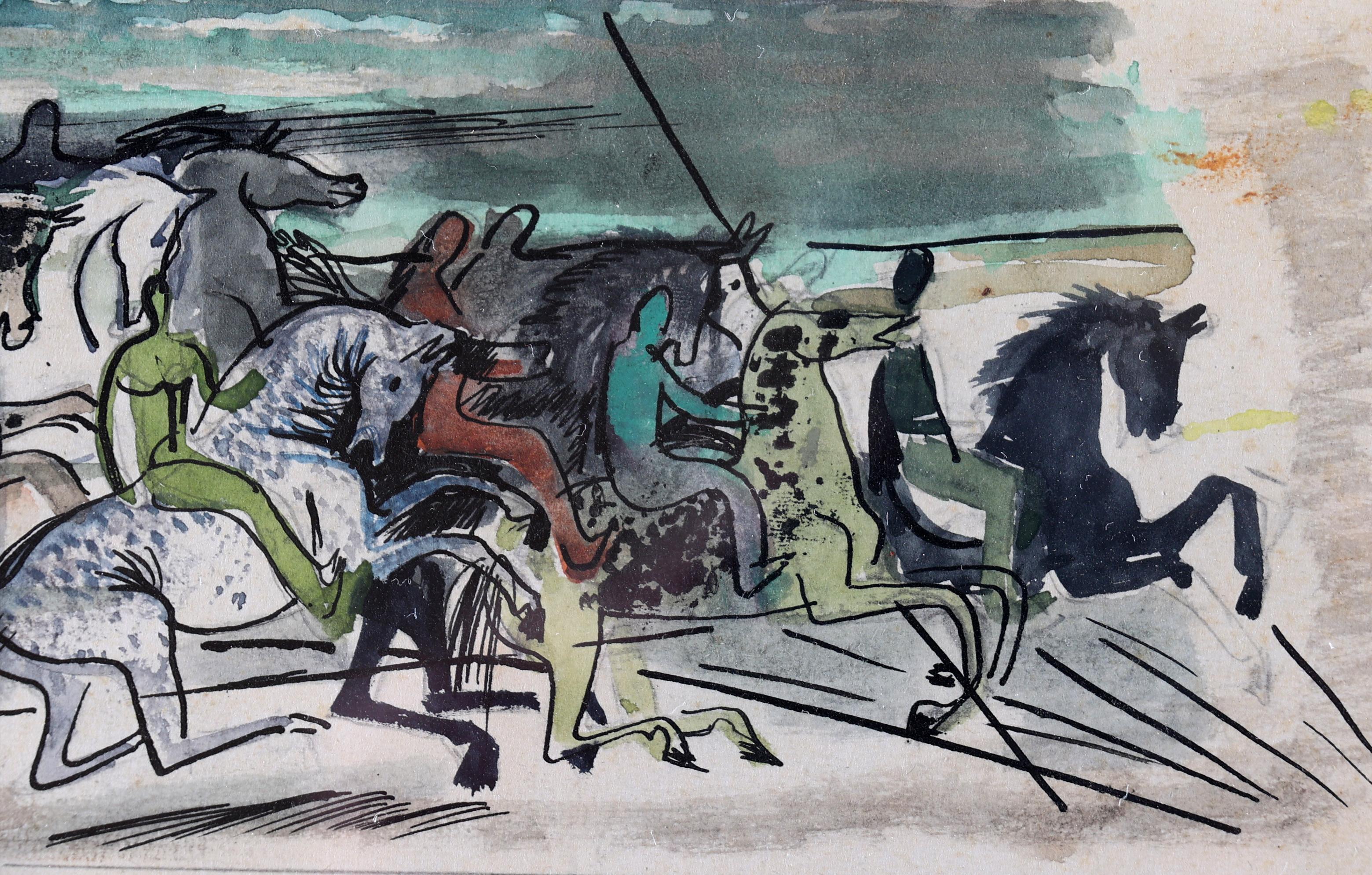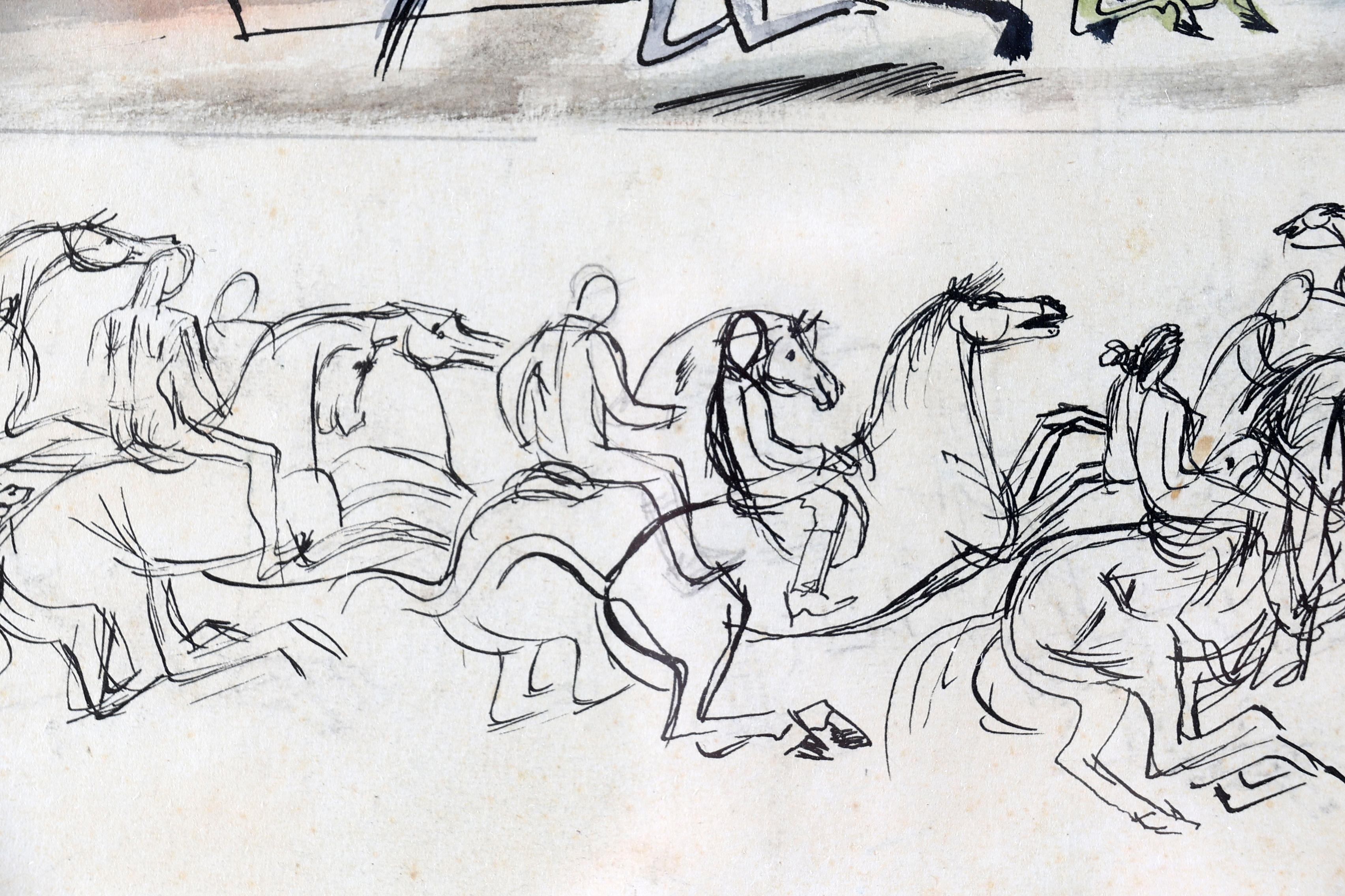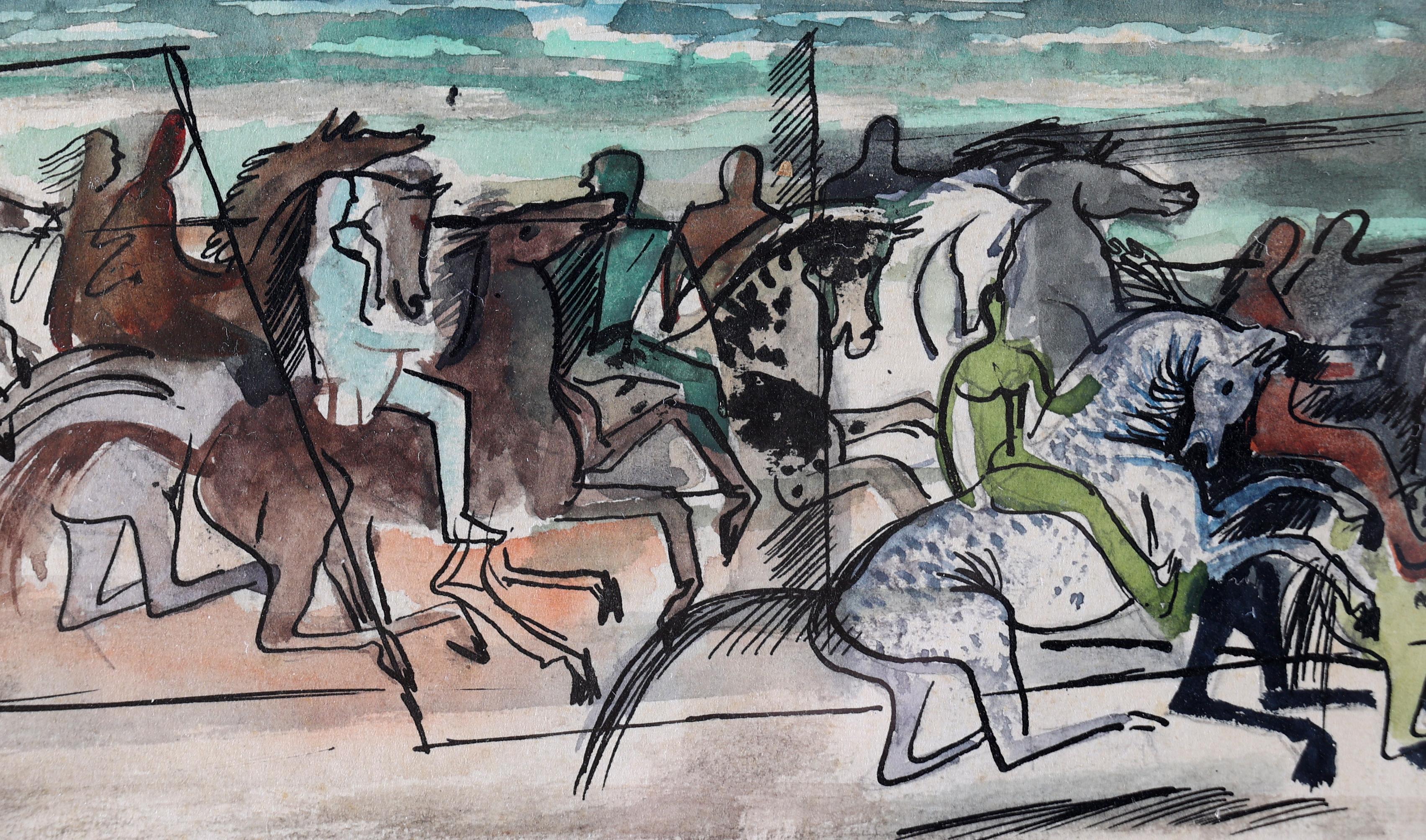 Jacob 'Jaap' Bouhuys (1902-1983), Personen te paard, pentekening/gouache 26 x 146 cm.
