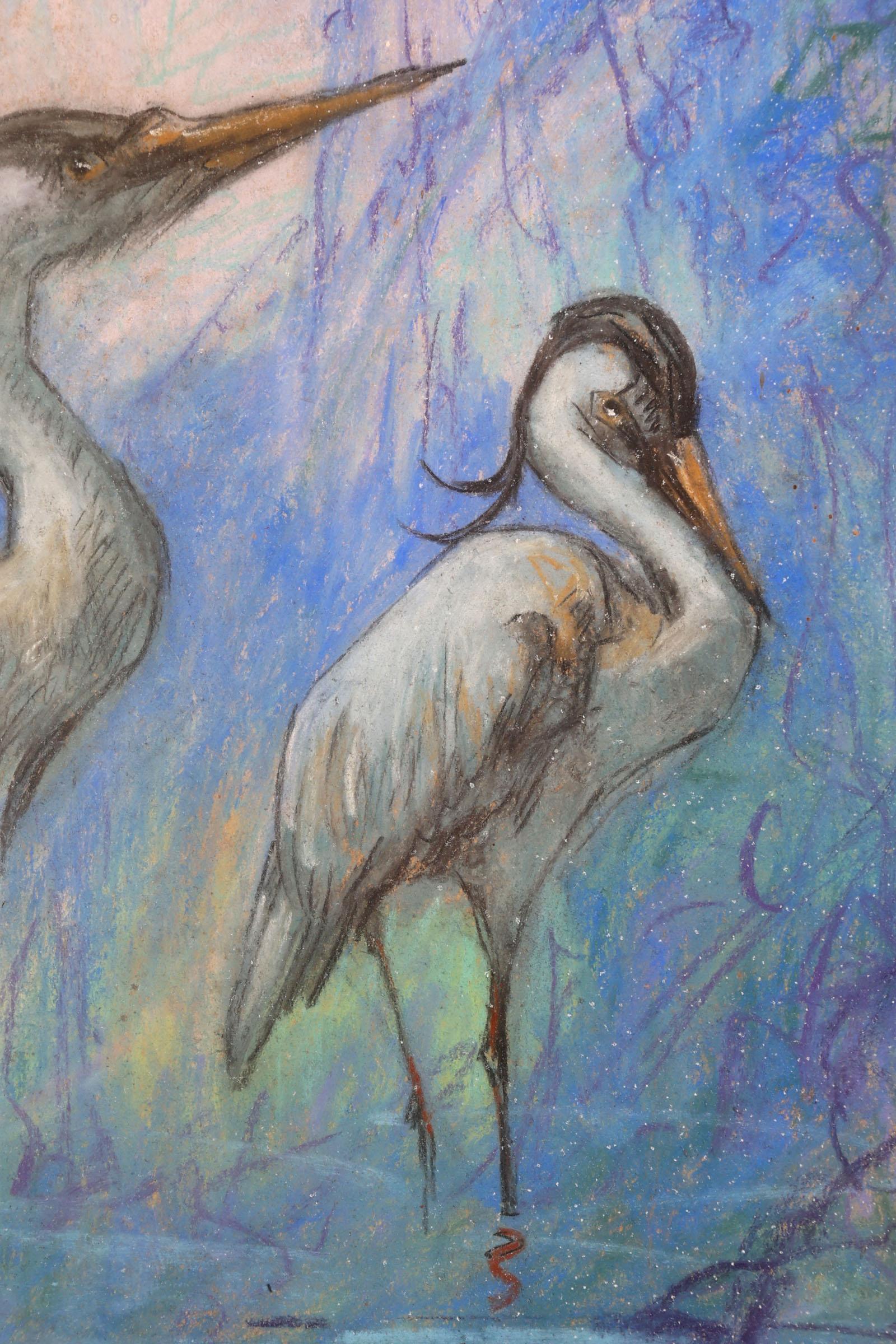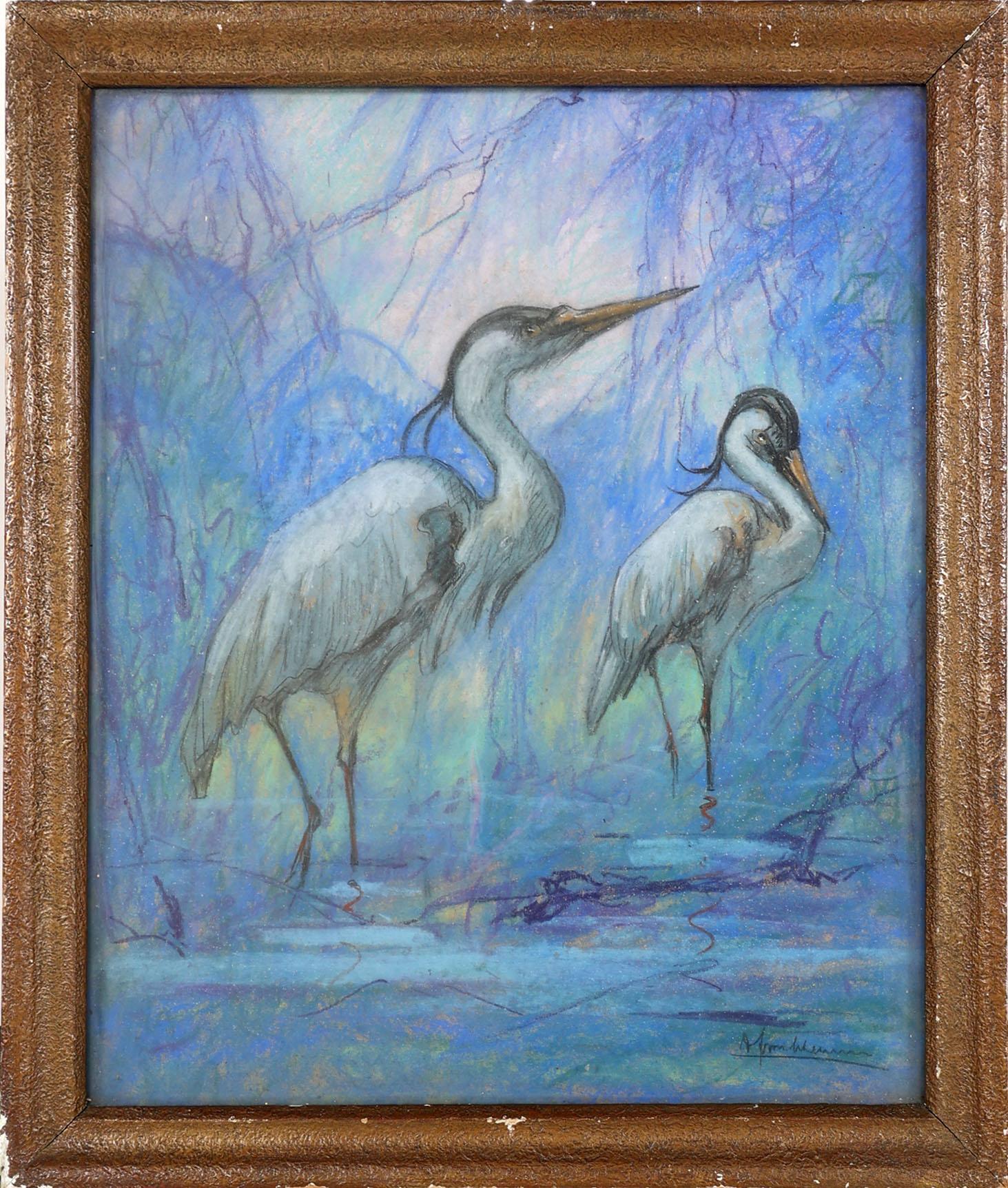 Abert Klein Sprokkelhorst (1887-1968), Reigers aan het water, pasteltekening, 51,5 x 42 cm.