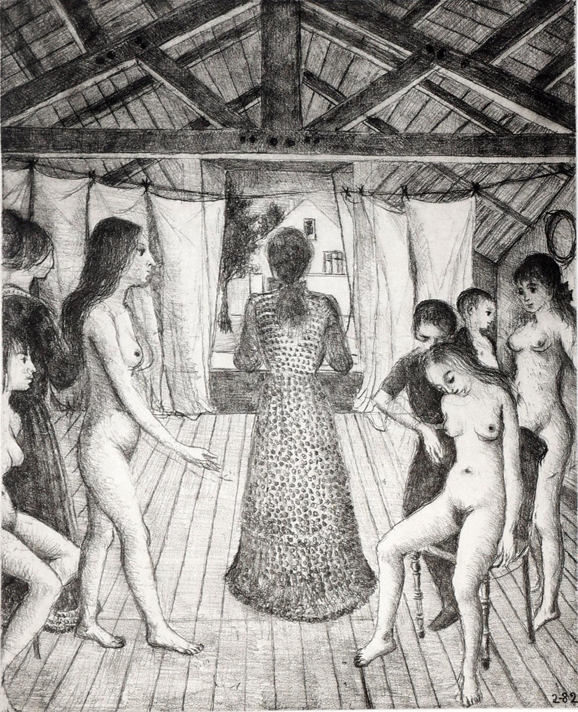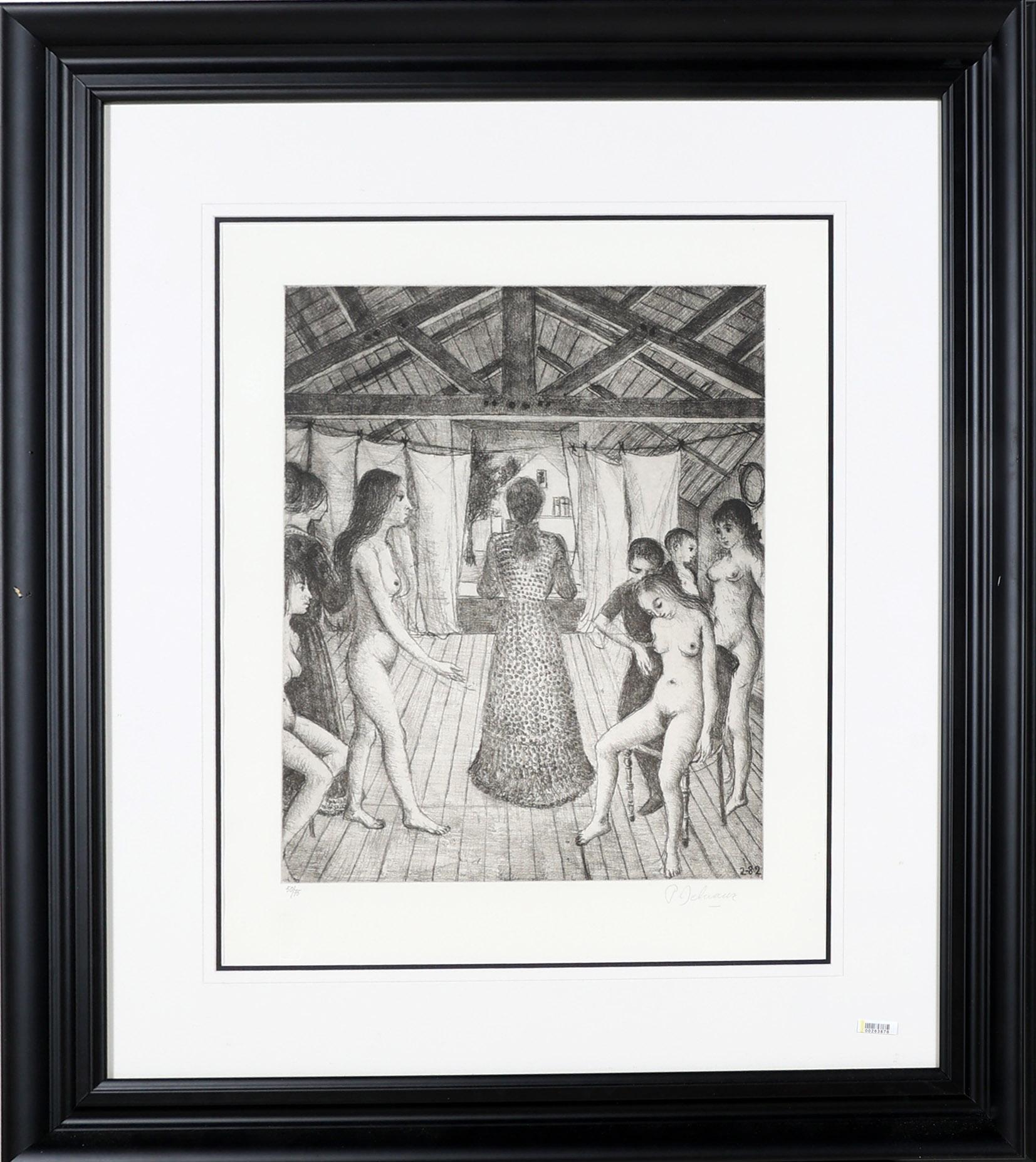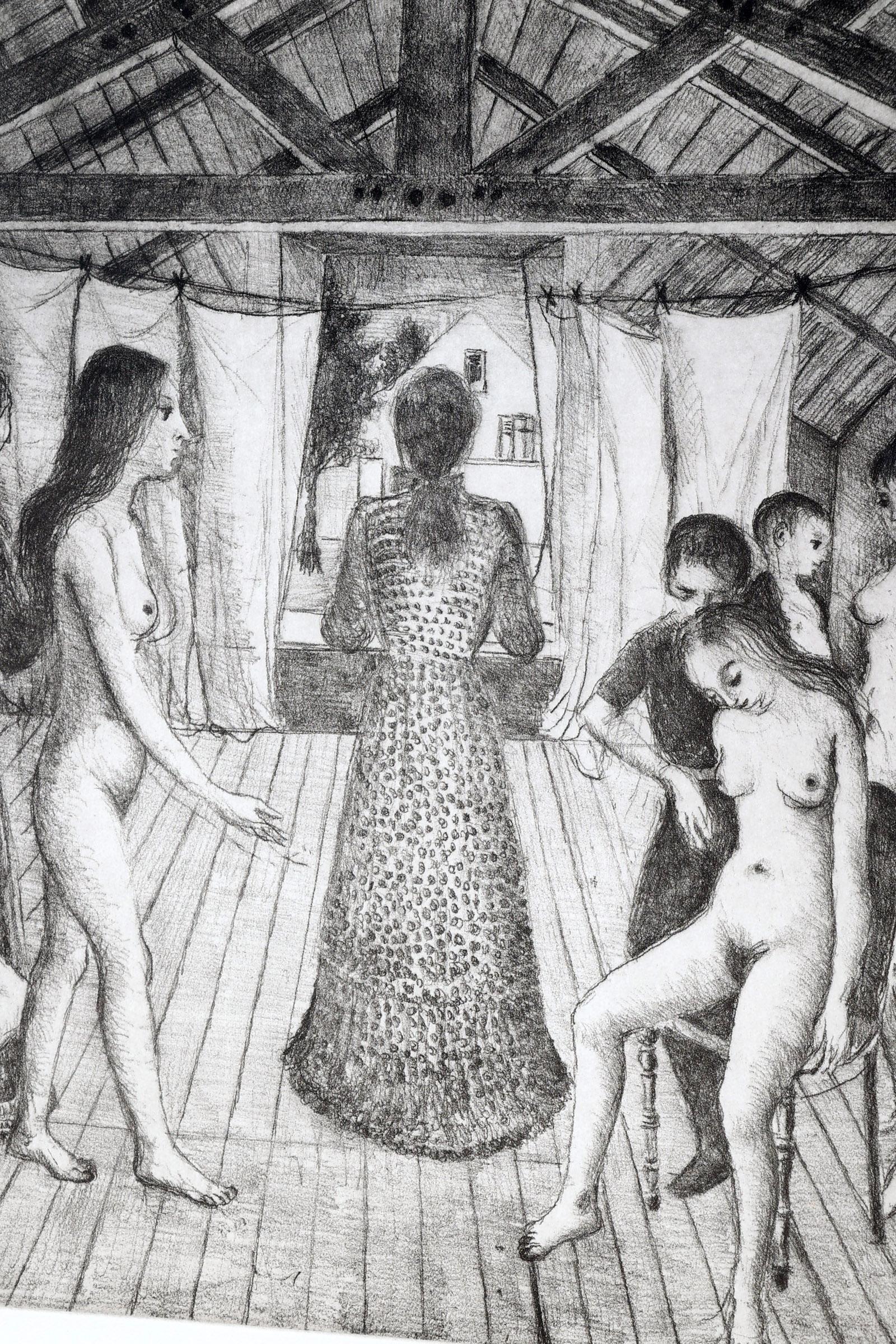 Paul Delvaux (1897-1994), Le grenier, handgesigneerde en genummerde ets, oplage 50/75, gedateerd '82, met droogstempel miroir d'encre, 60 x 49 cm.
