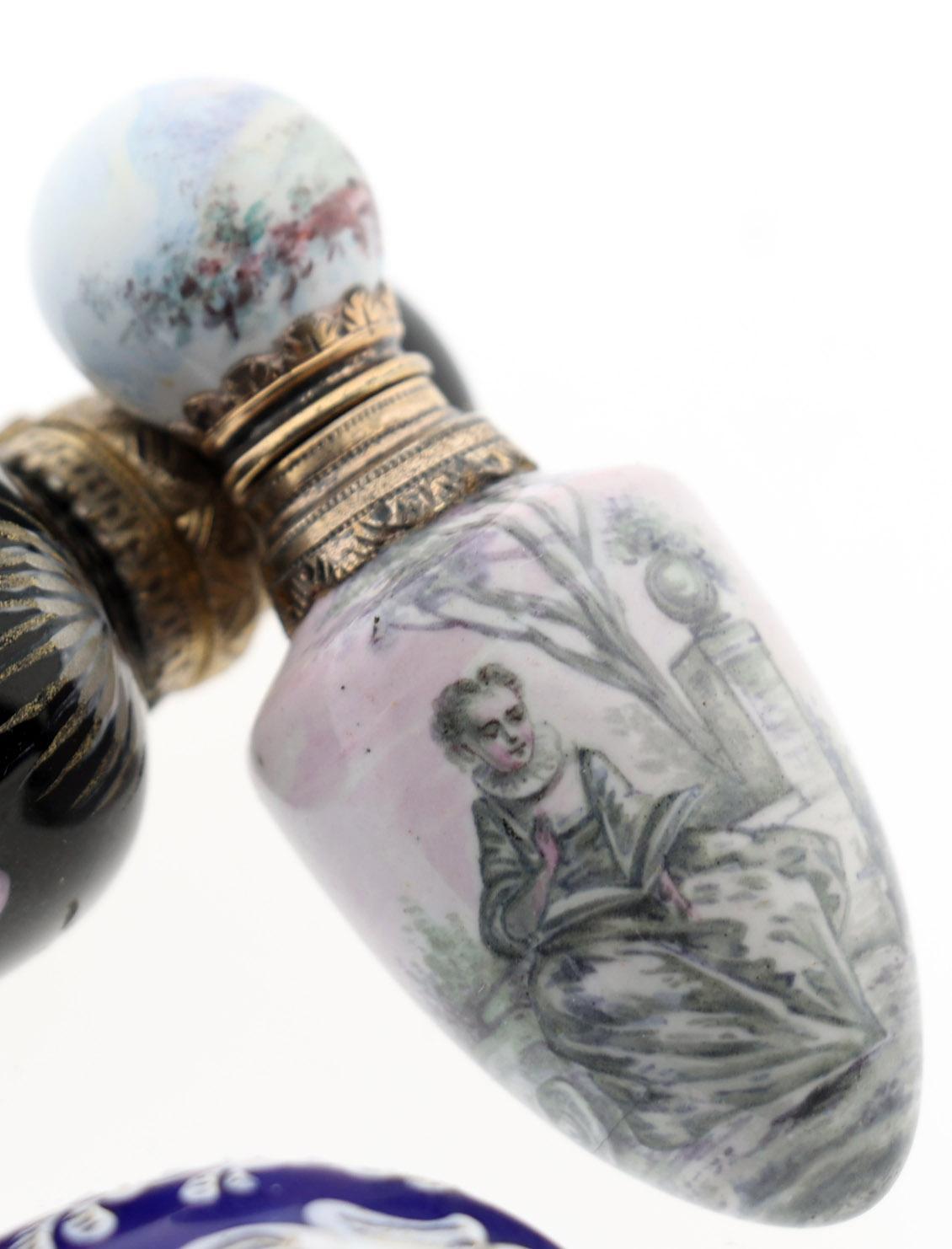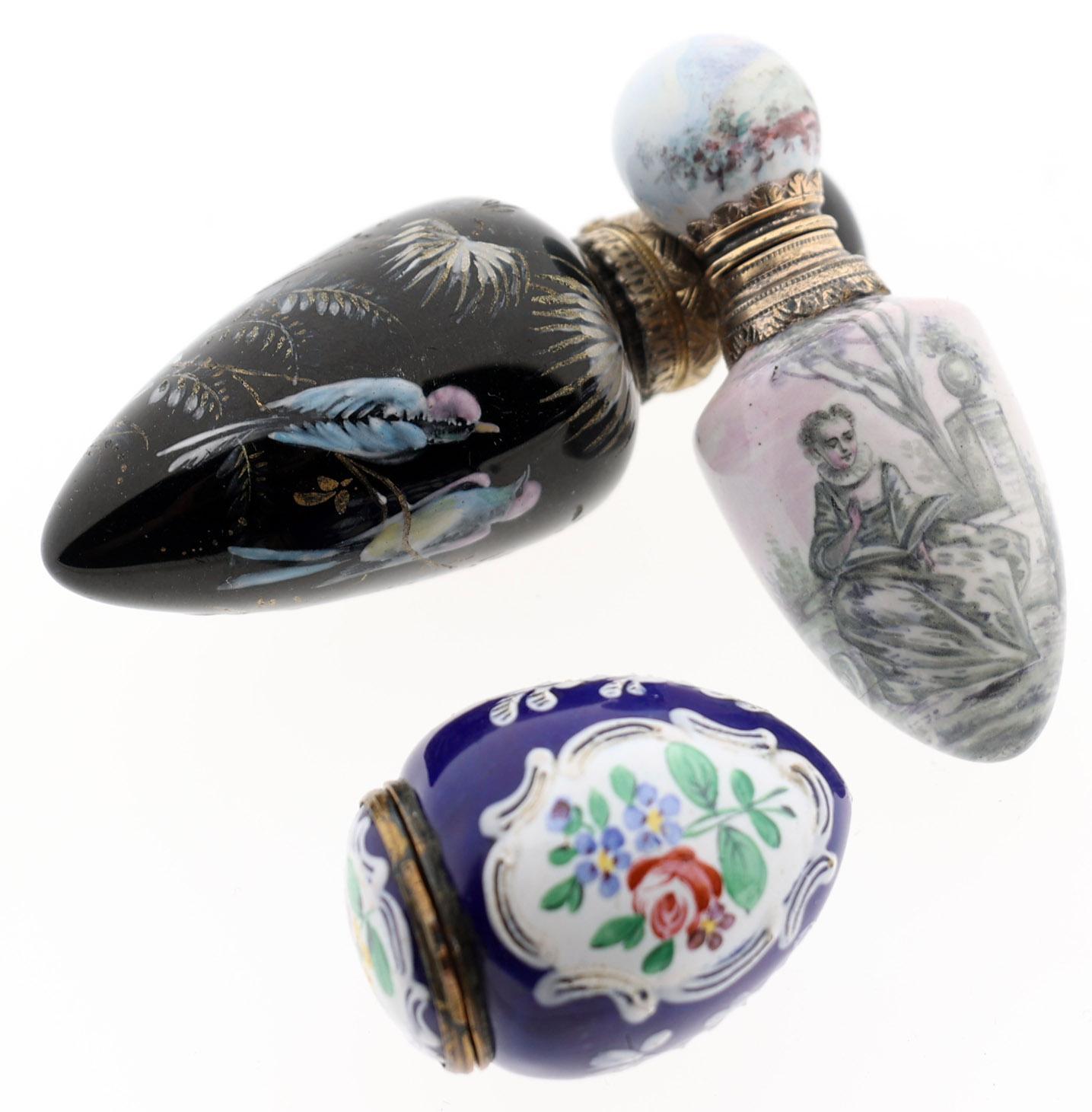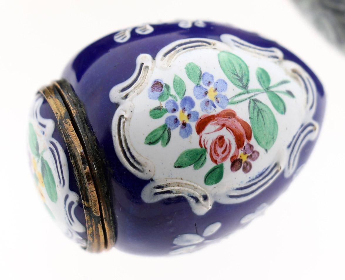 Koop van emaille eivormig dekseldoosje, ca.1780, roze emaille fles met zilveren garnituur en zwart emaille Limoge odeurflacon