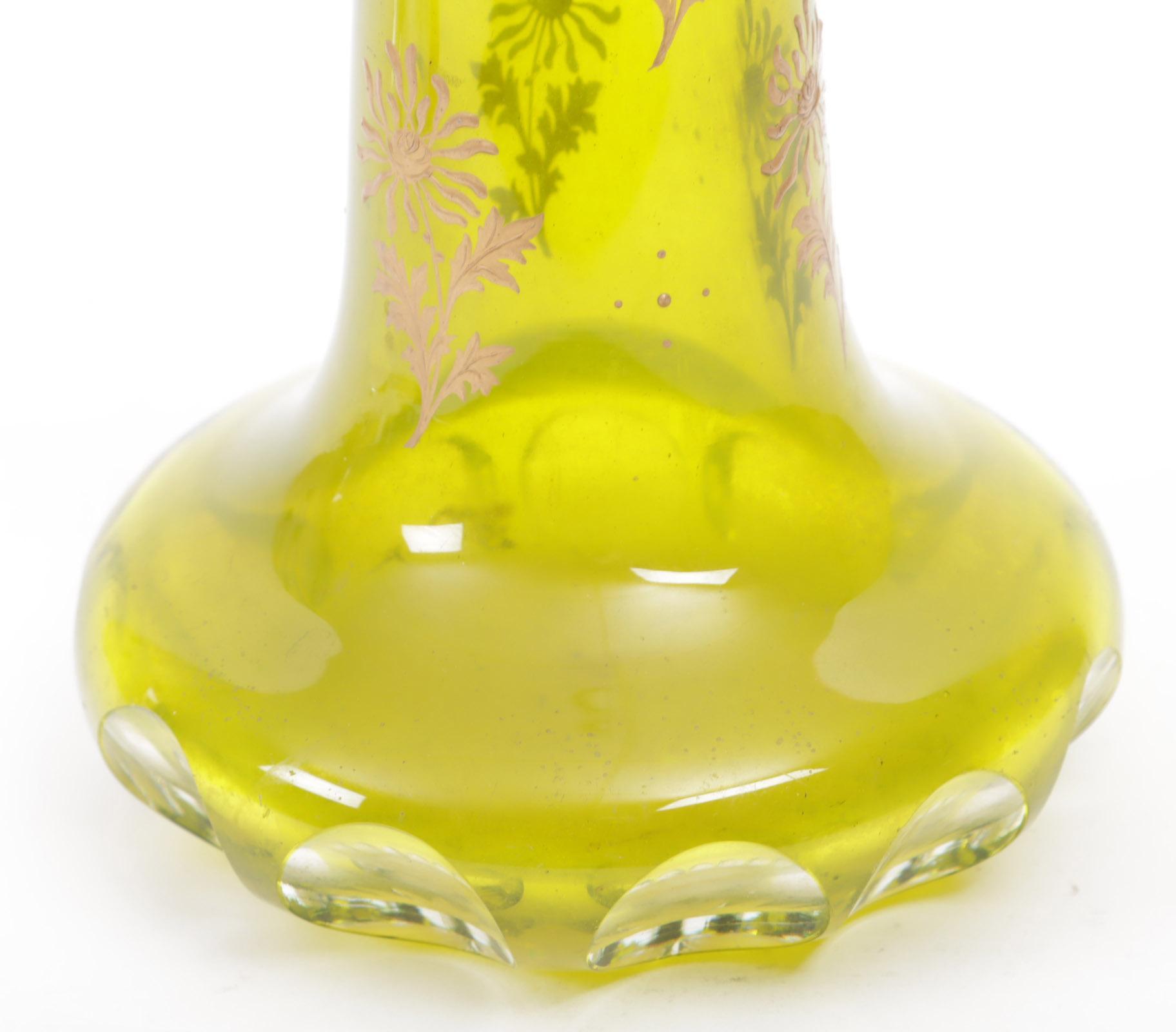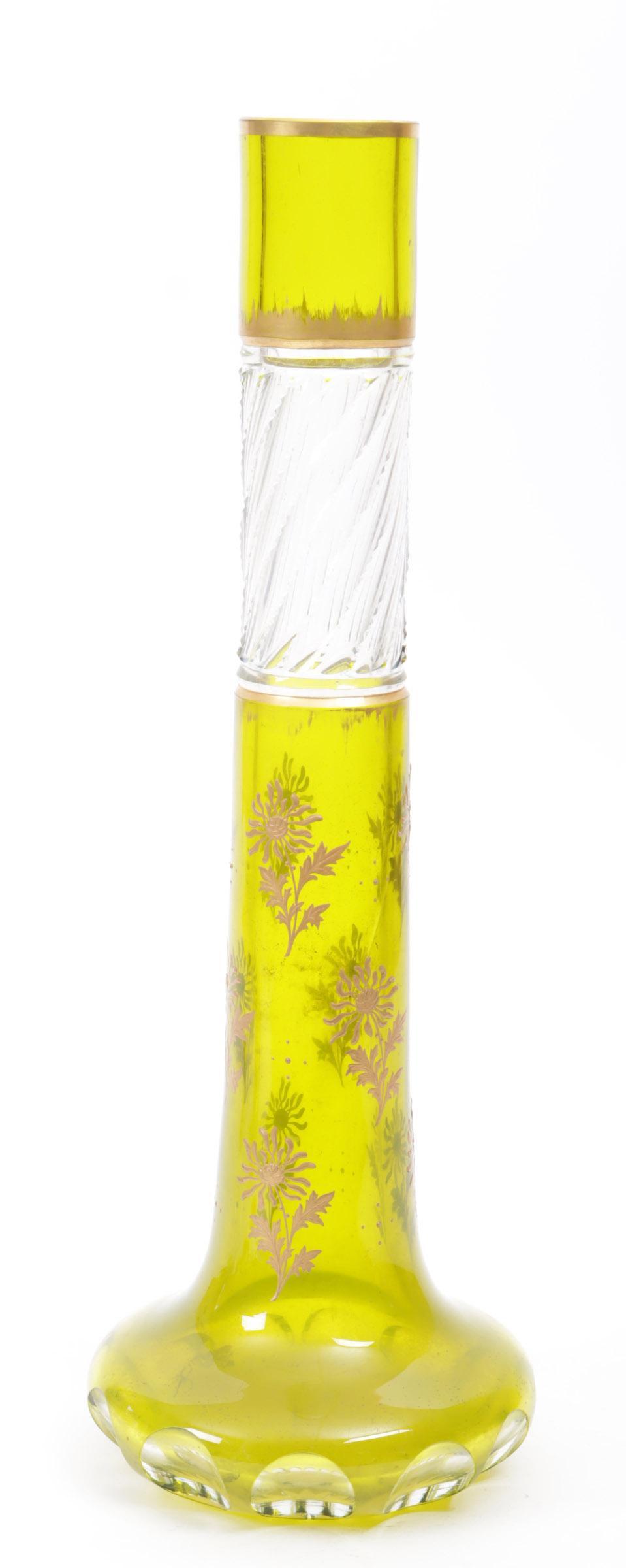 Groene Boheems kristallen vaas opgehoogd met gouden bloemen, h.41 cm.
