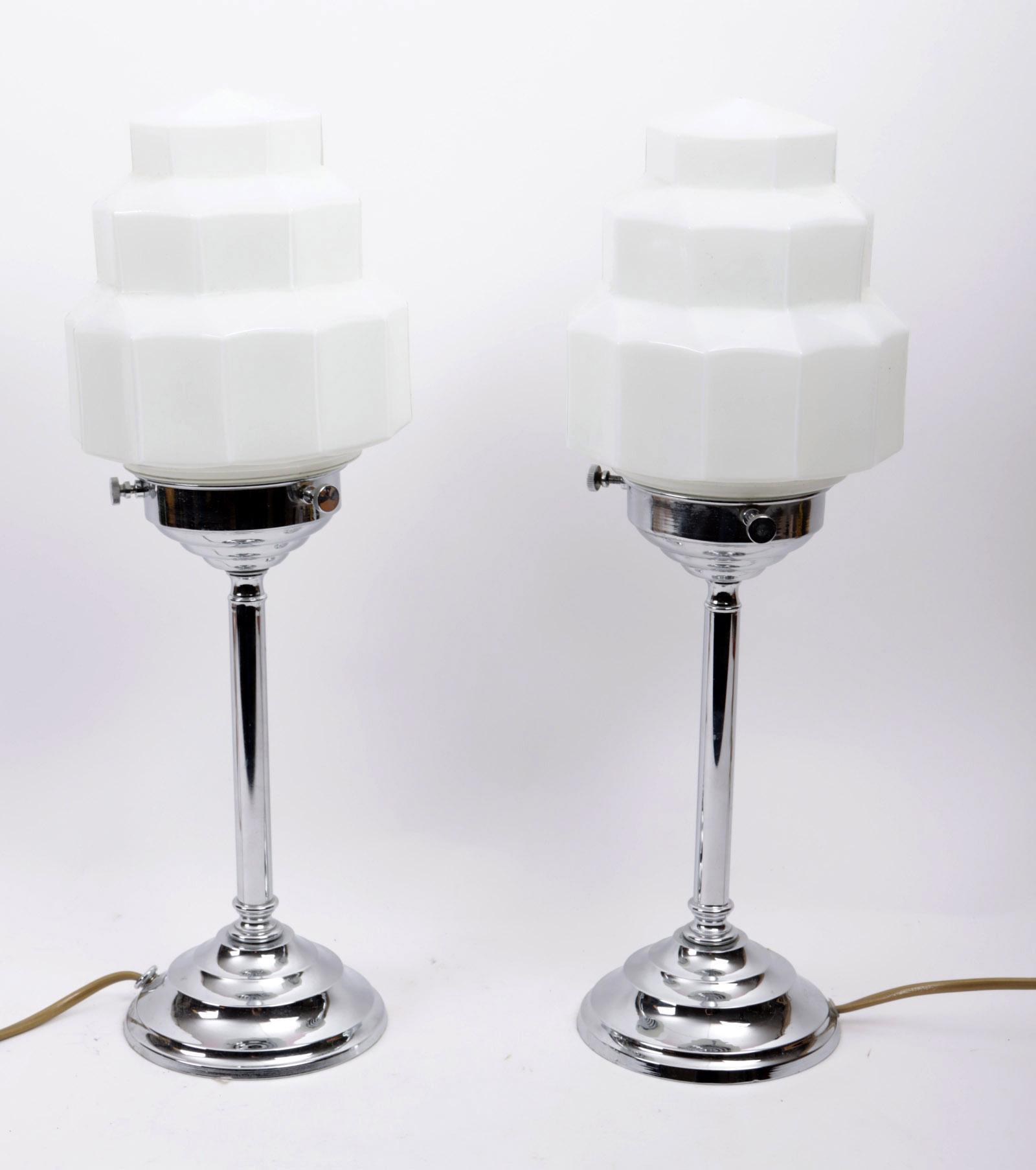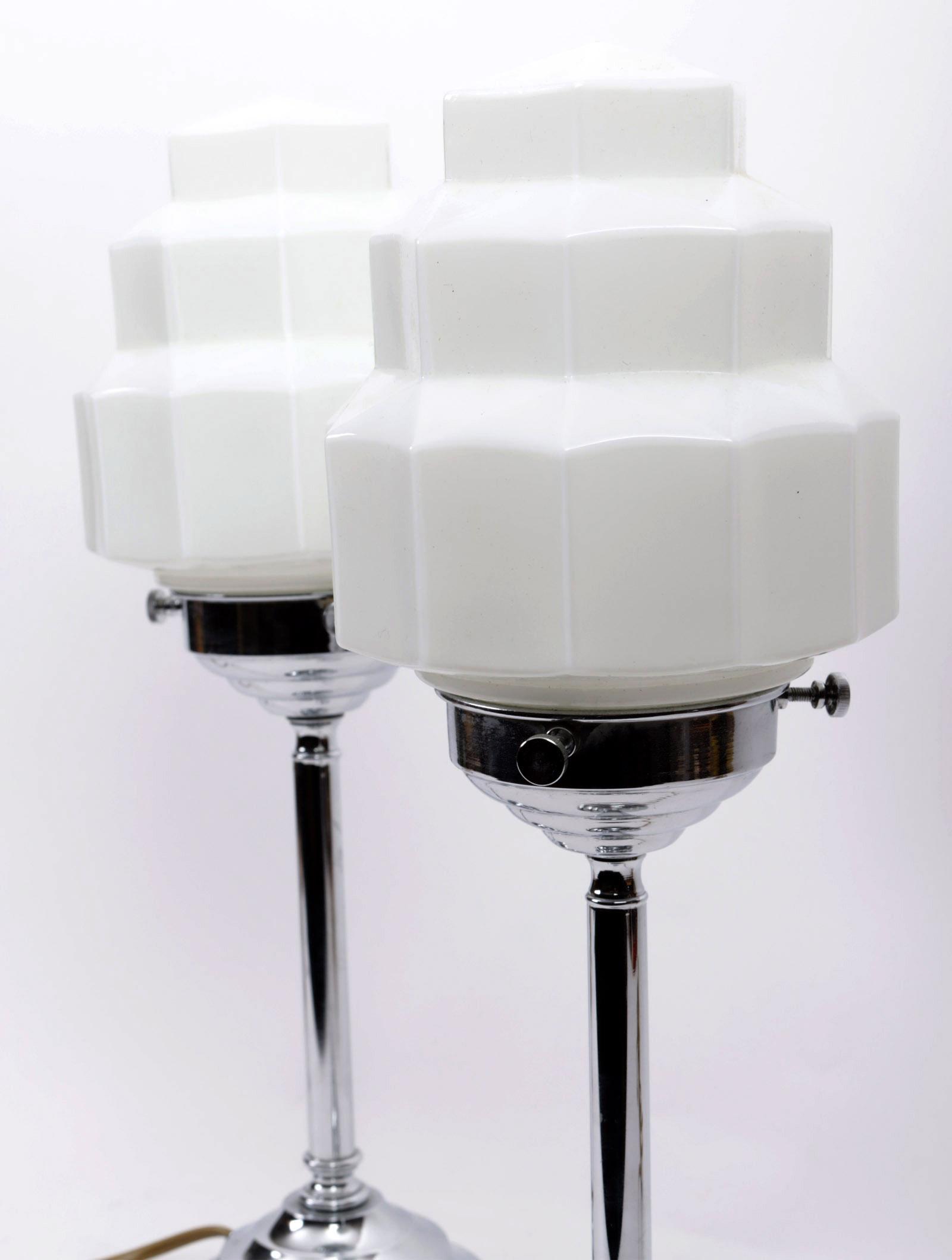 Twee chroom Art Deco-stijl schemerlampen met melkglazen kappen, h.40 cm.