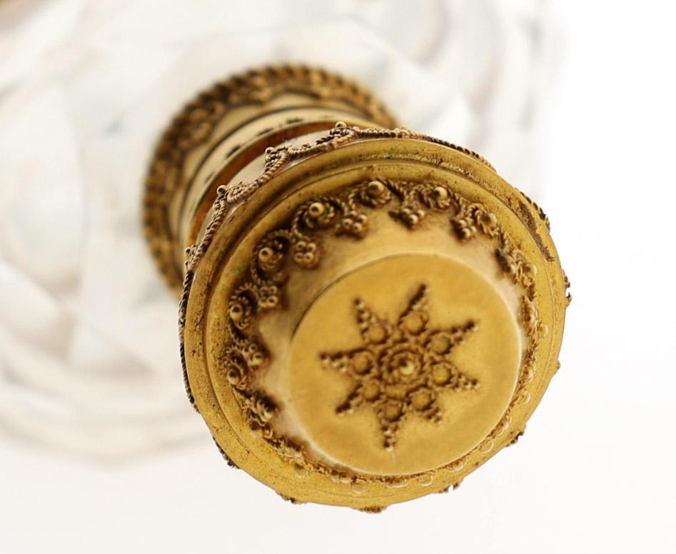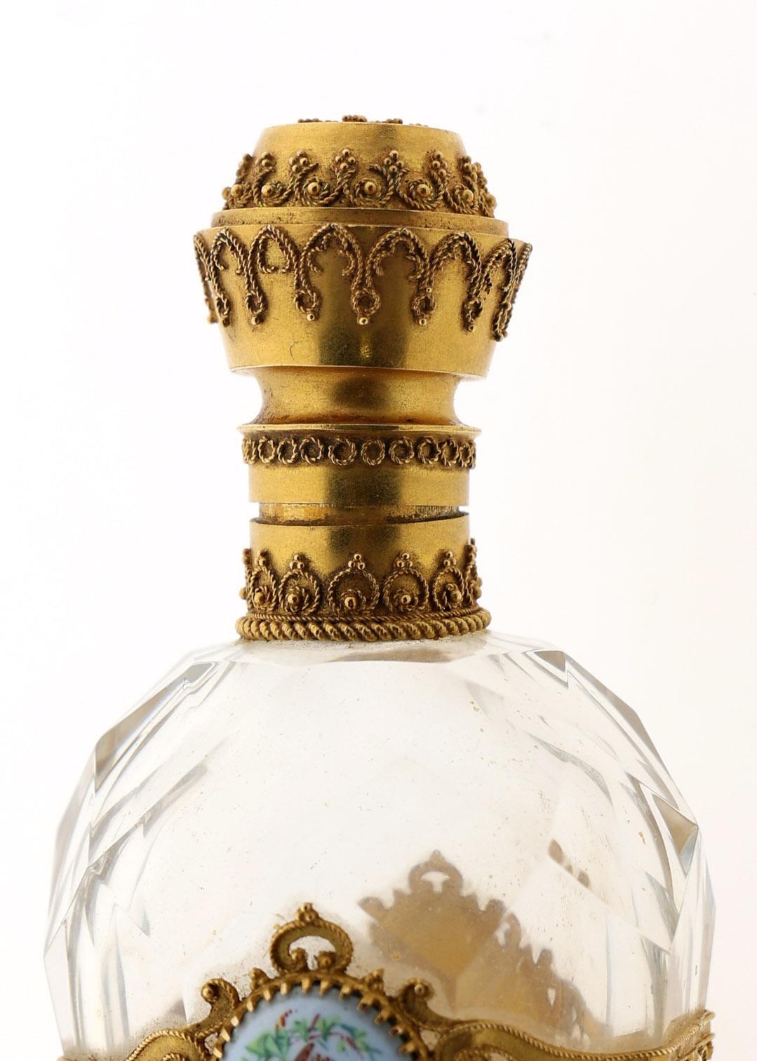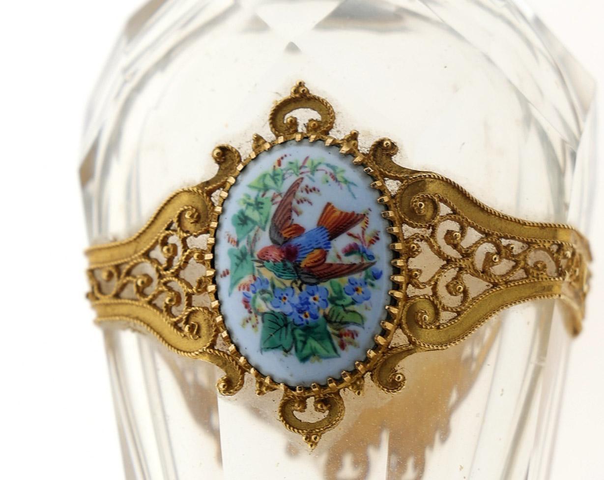 Antieke kristallen odeurflacon met opengewerkt gouden band met 2 porseleinen ovale plaquettes met decoratie van vogels en goudkleurige dop, h.10 cm.