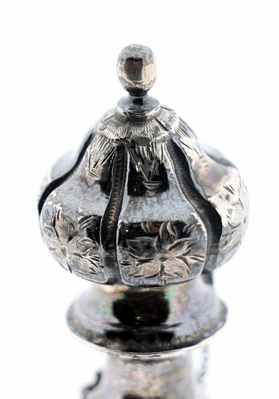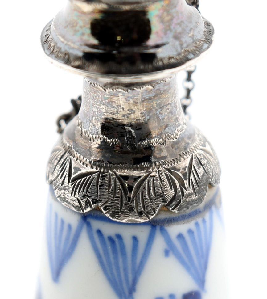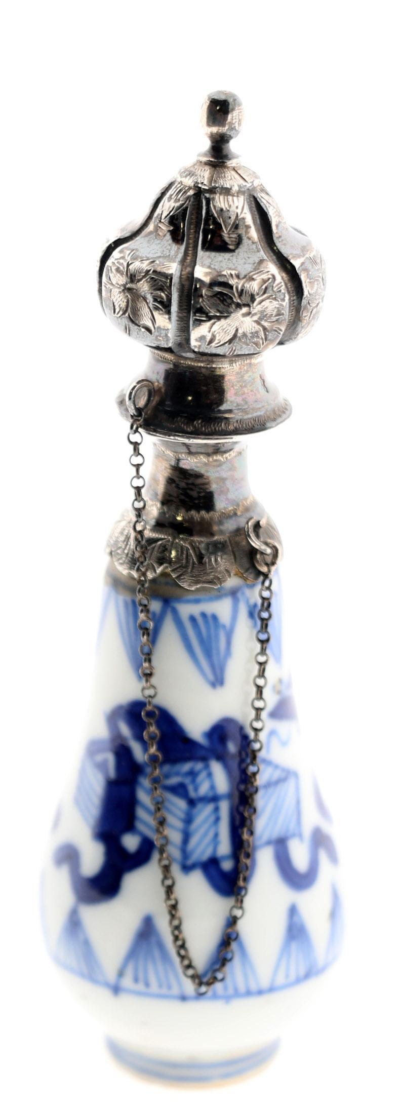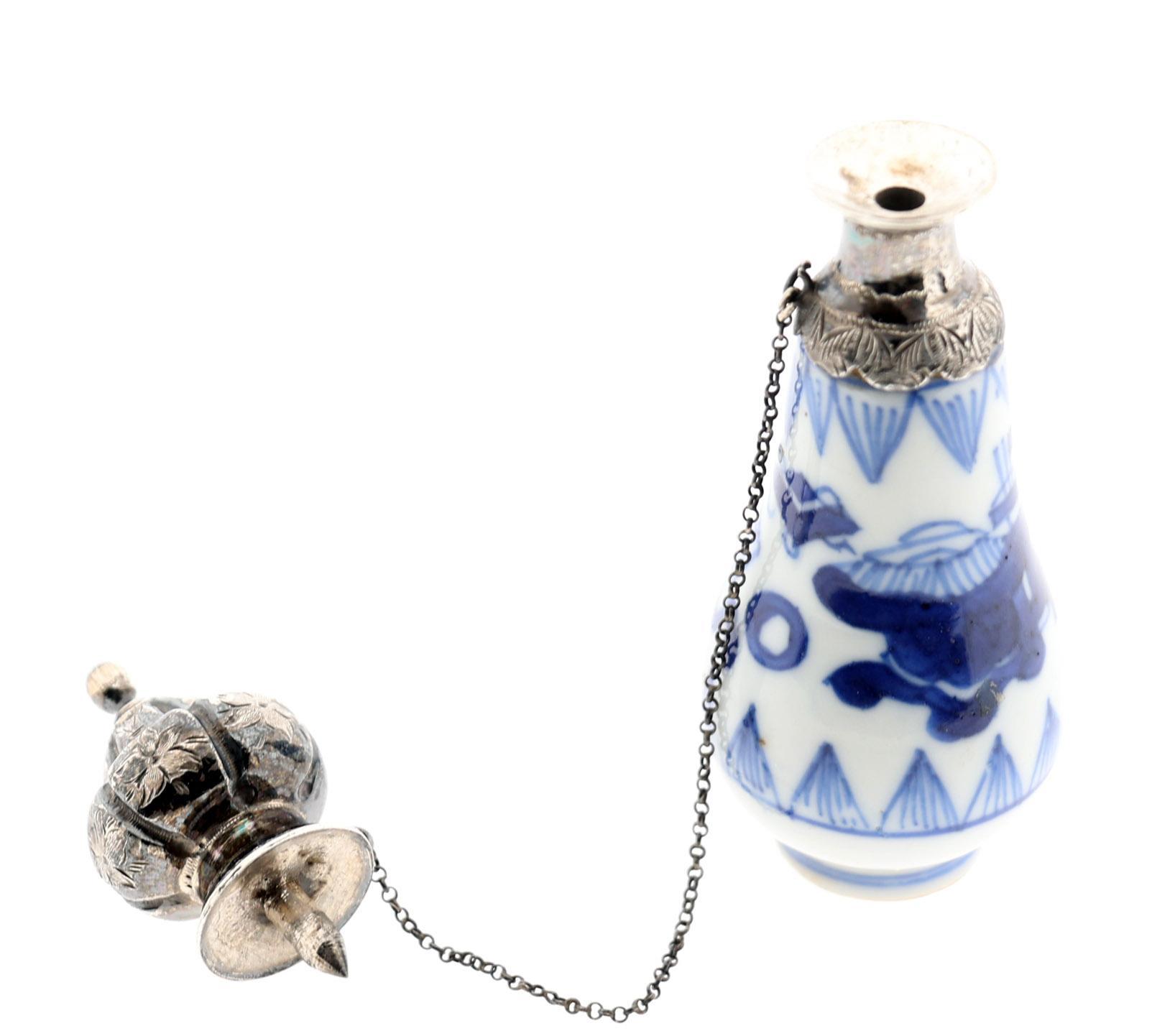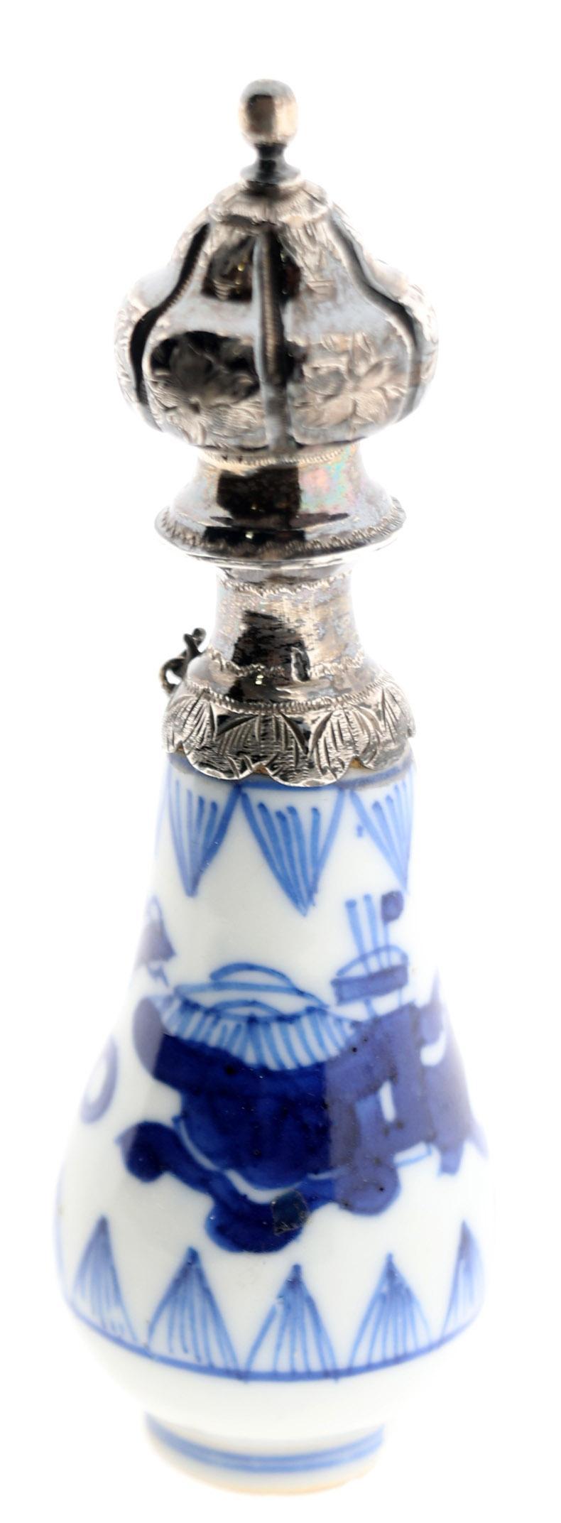 Blauw/wit gedecoreerde Chinees porseleinen snuifflacon met zilveren montuur, Ming/Qing Dynastie, h.11 cm.