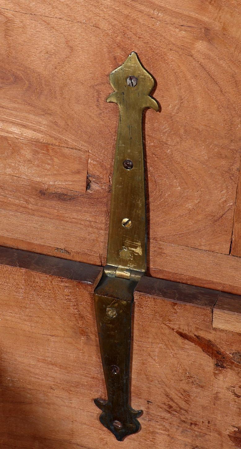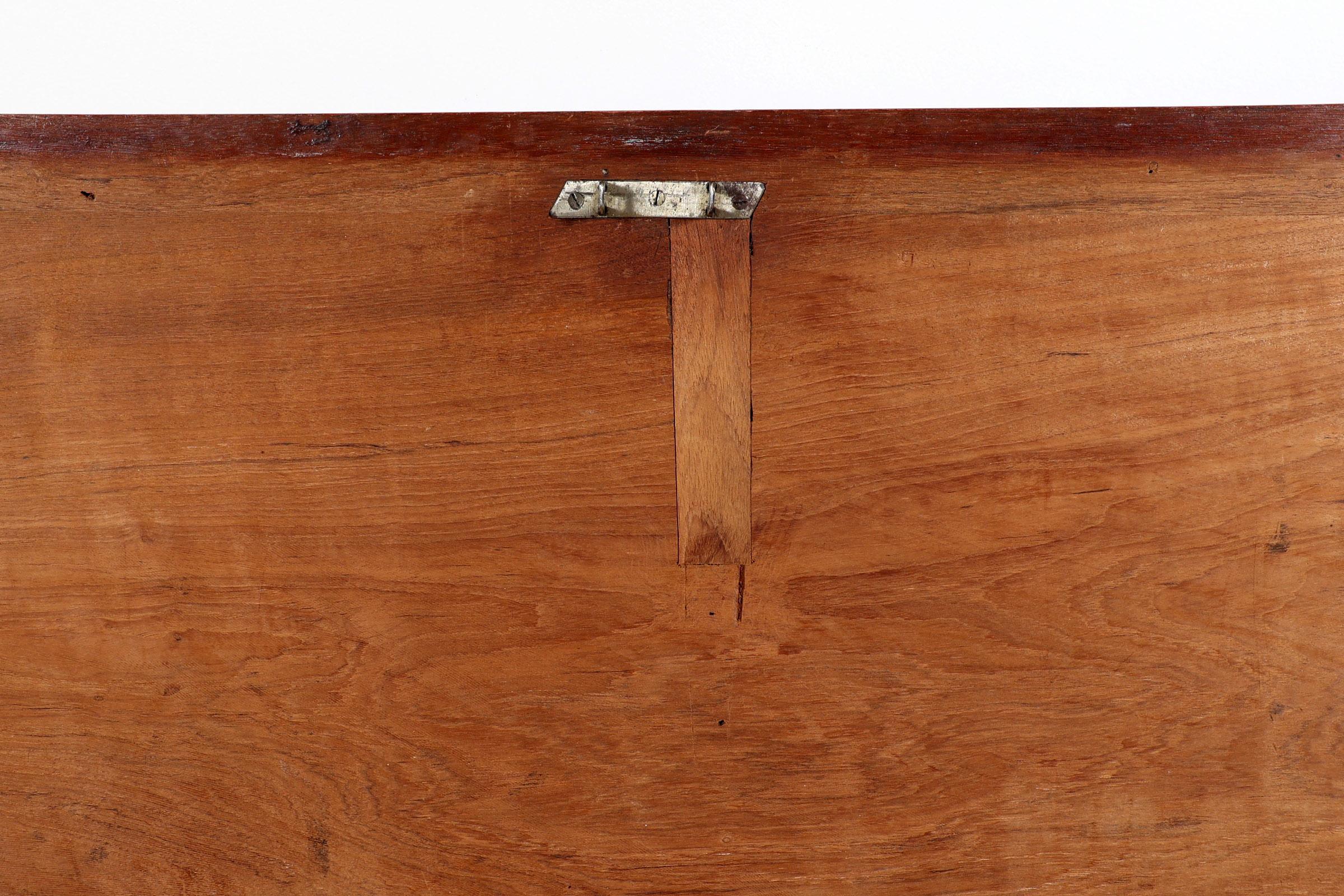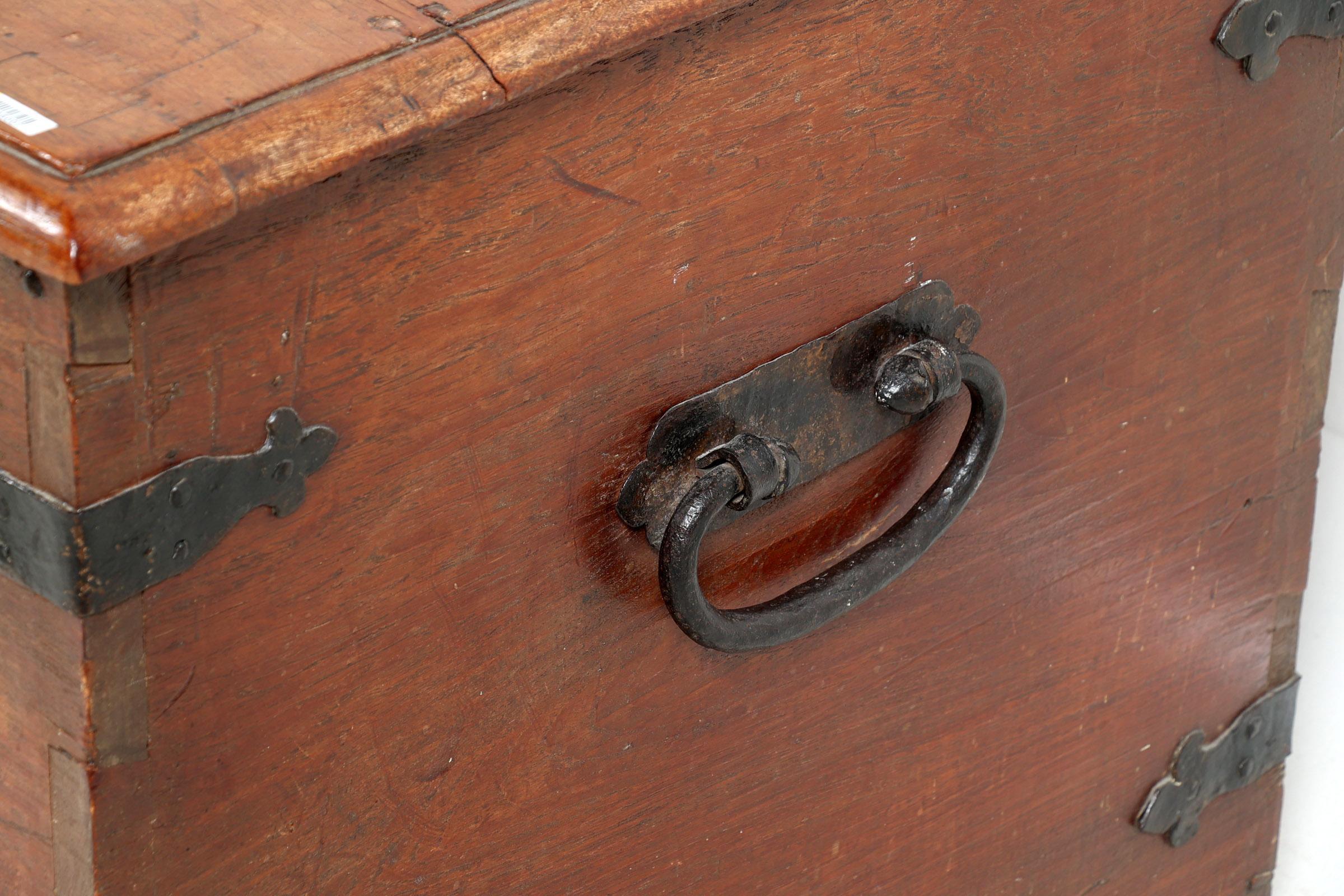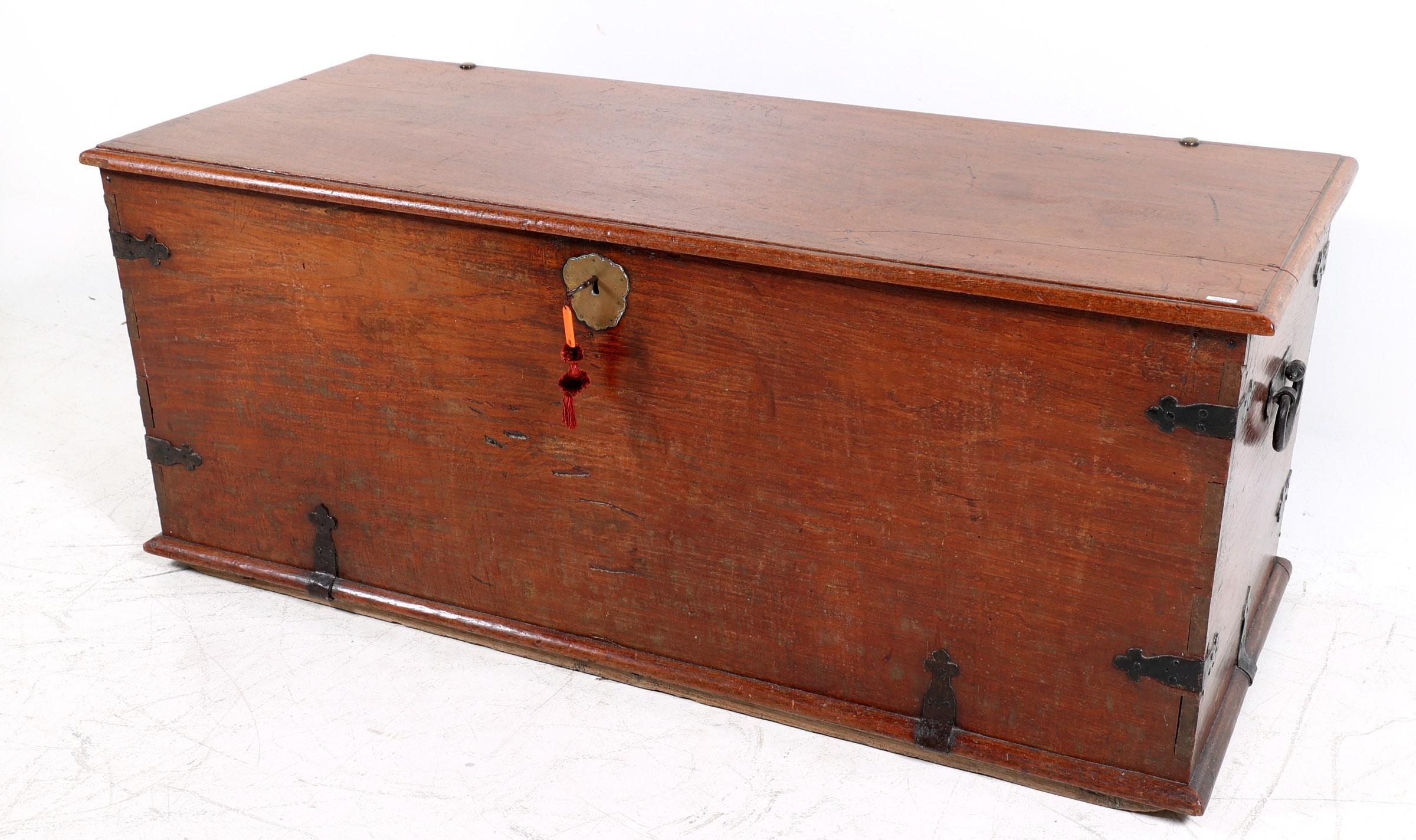 Antieke koloniale teakhouten kist met ijzer afgezet, h.69 x b.166 x d.71 cm.
