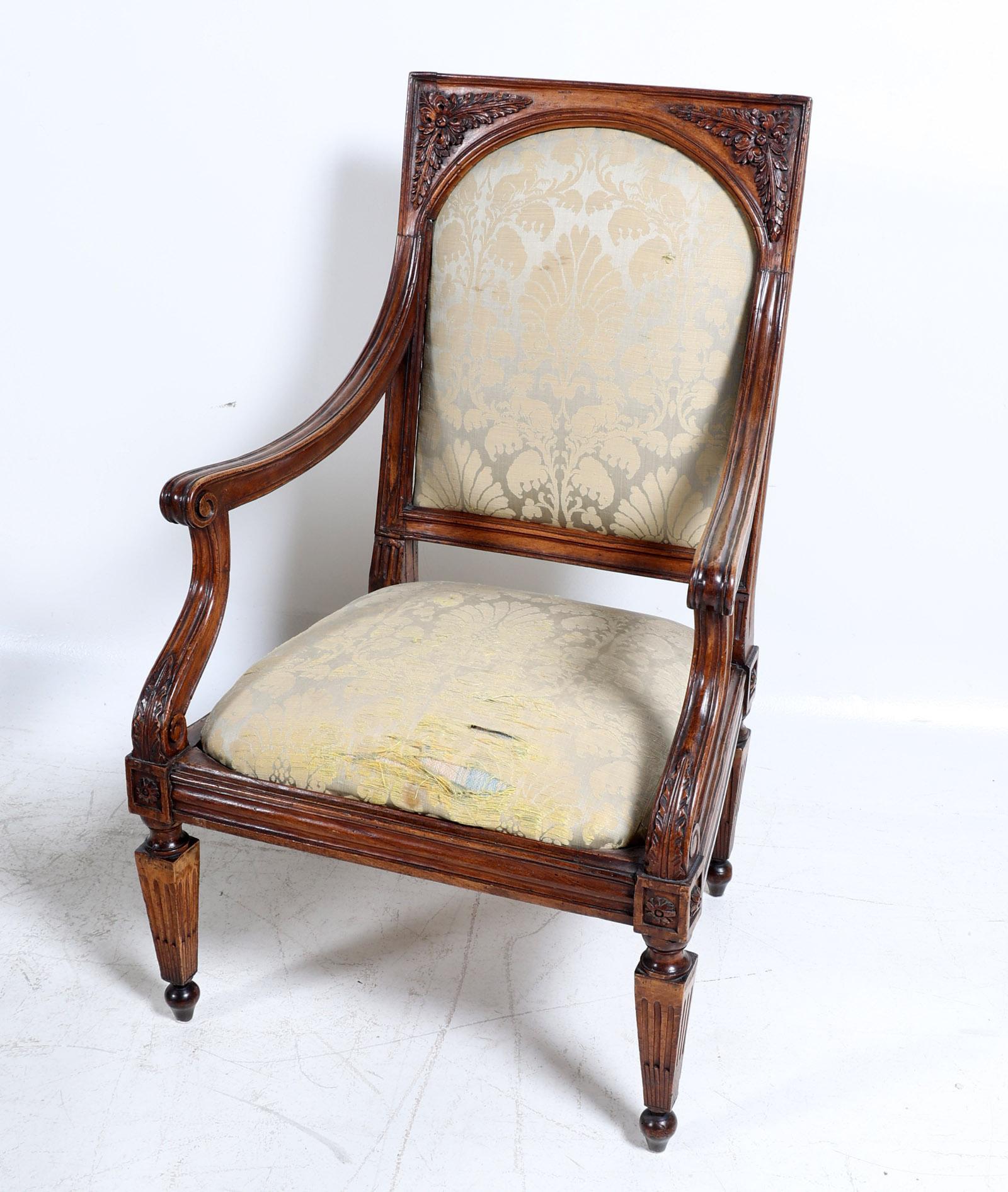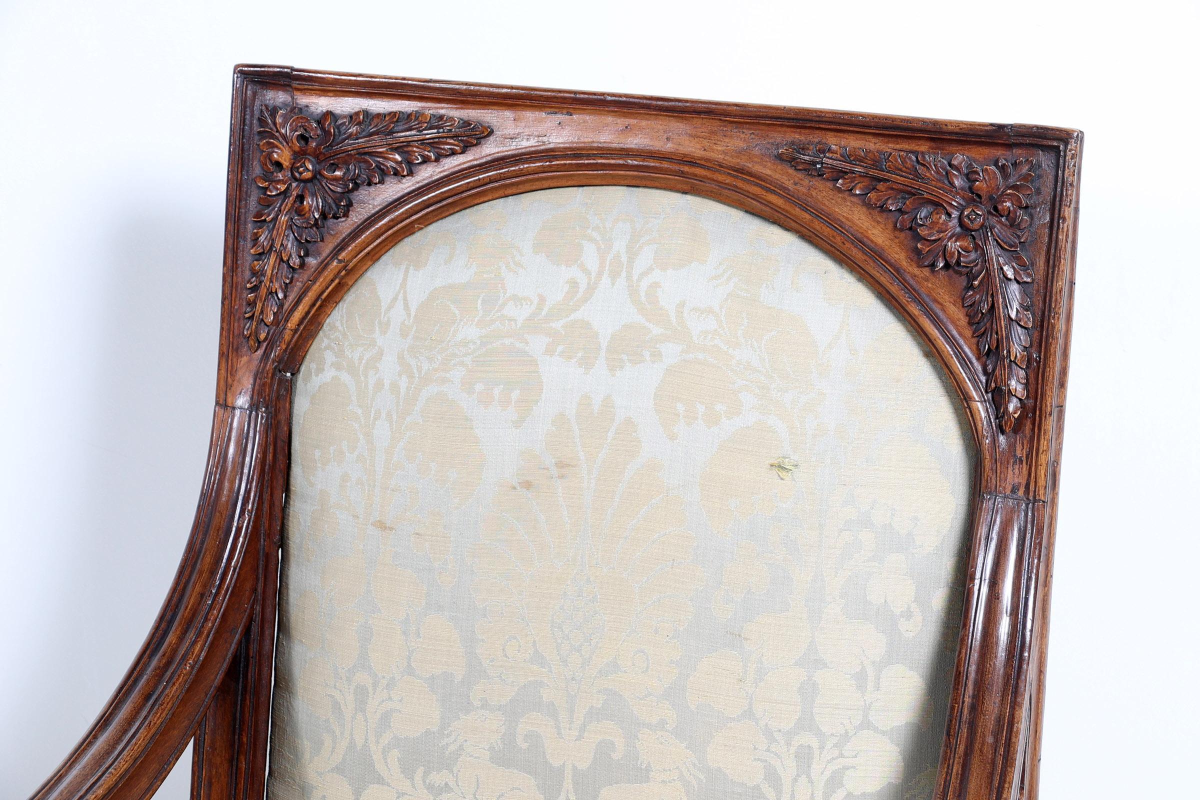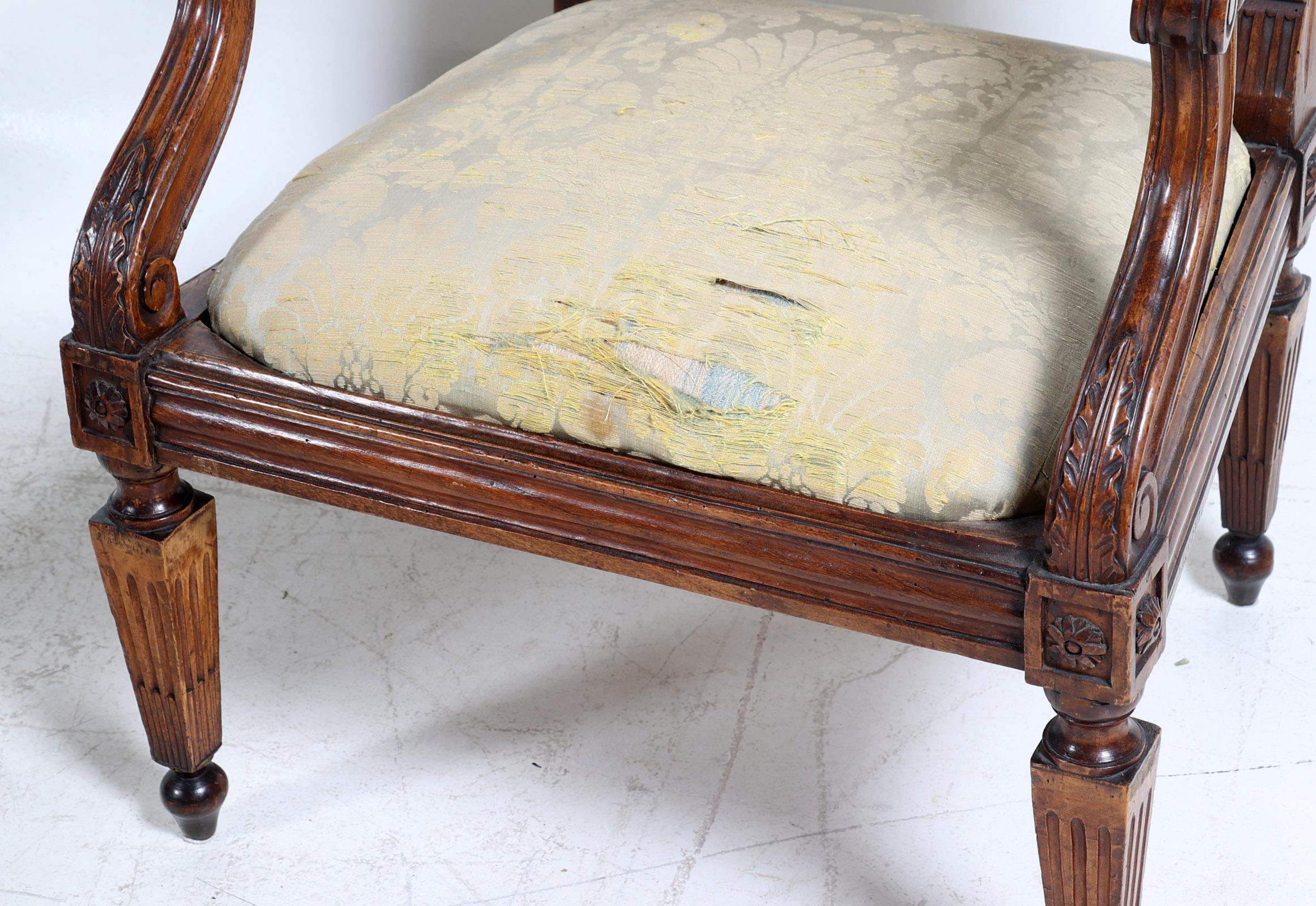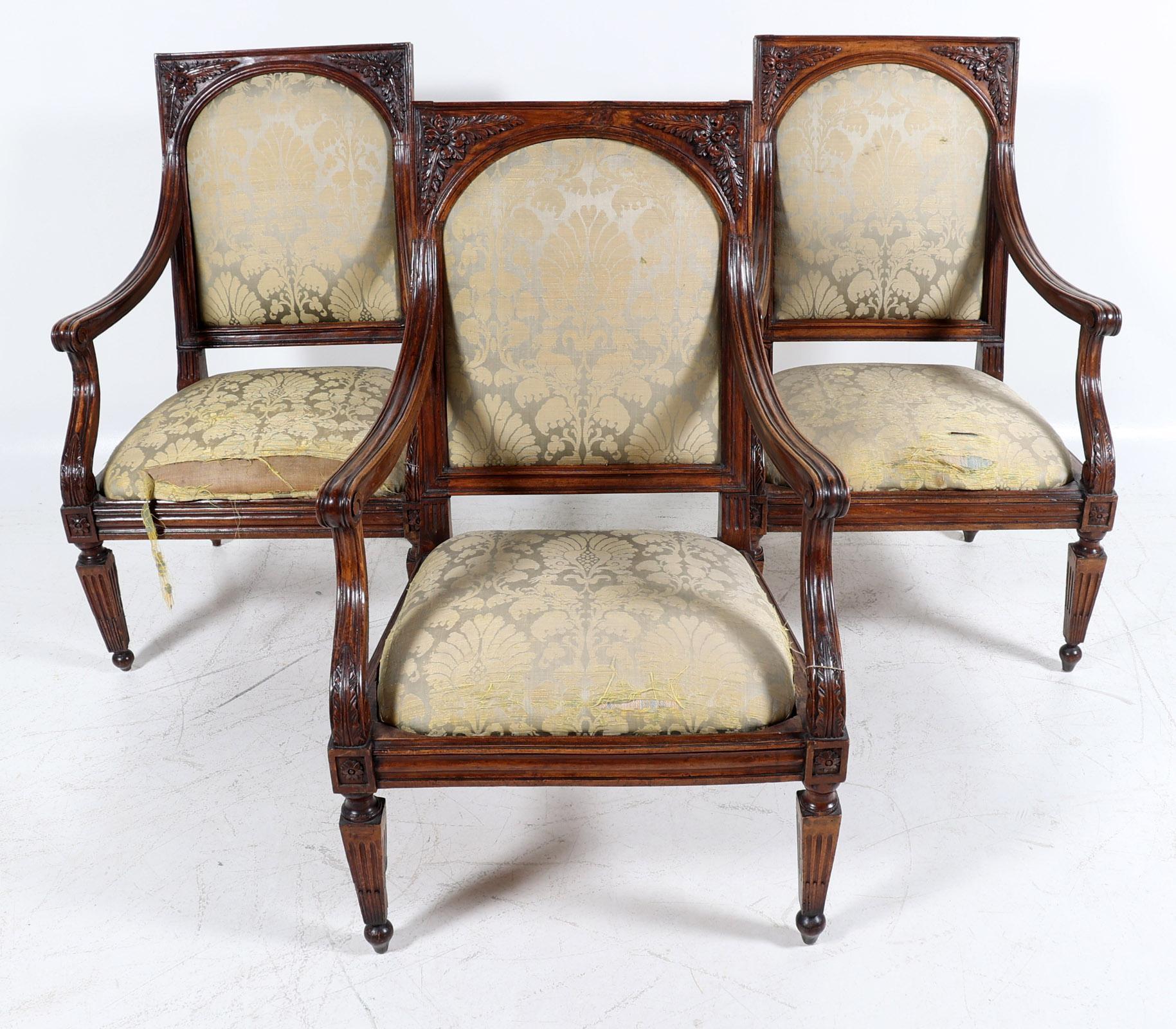 3 Antieke rijkbewerkte notenhouten Louis XVI Bergère fauteuils met gele zijden stof bekleed (slijtage aan stof)