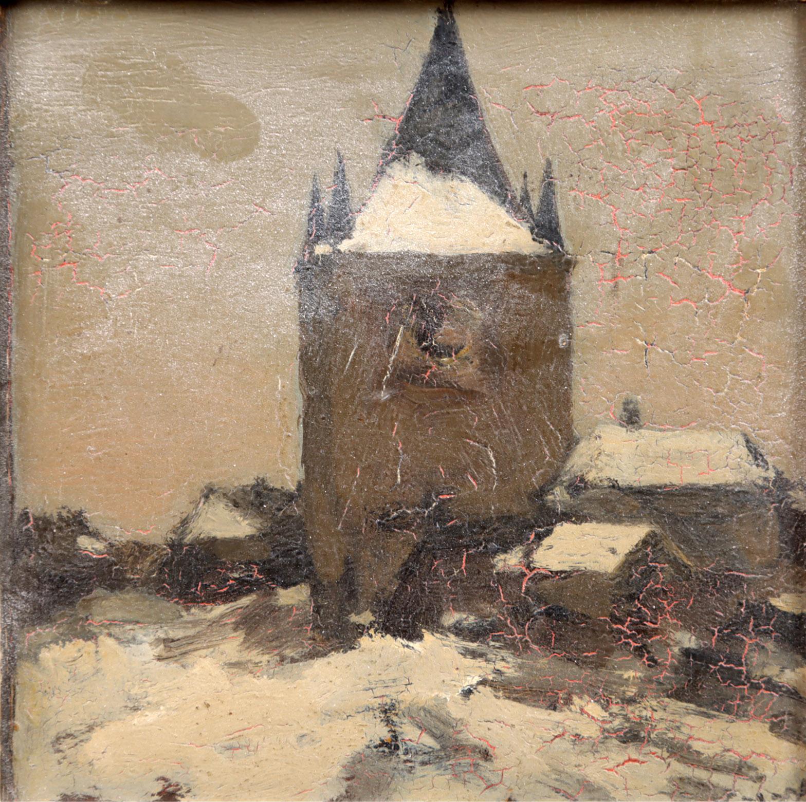 Toegeschreven aan Ype Heerke Wenning (1879-1959), Winterlandschap met toren, olieverf op board, 12 x 12 cm.