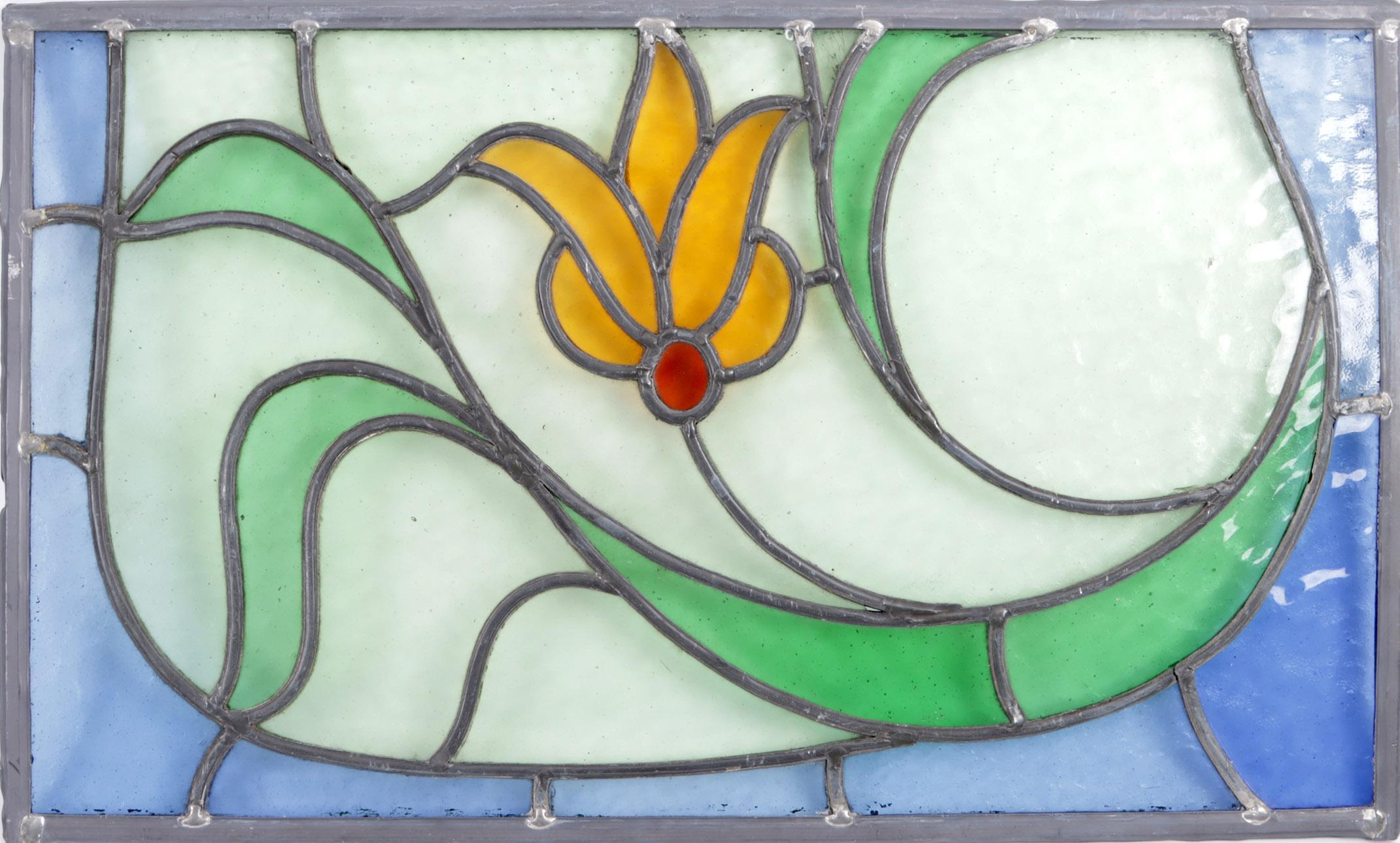 Oud glas-in-lood raam met bloem, 31,5 x 52,5 cm.