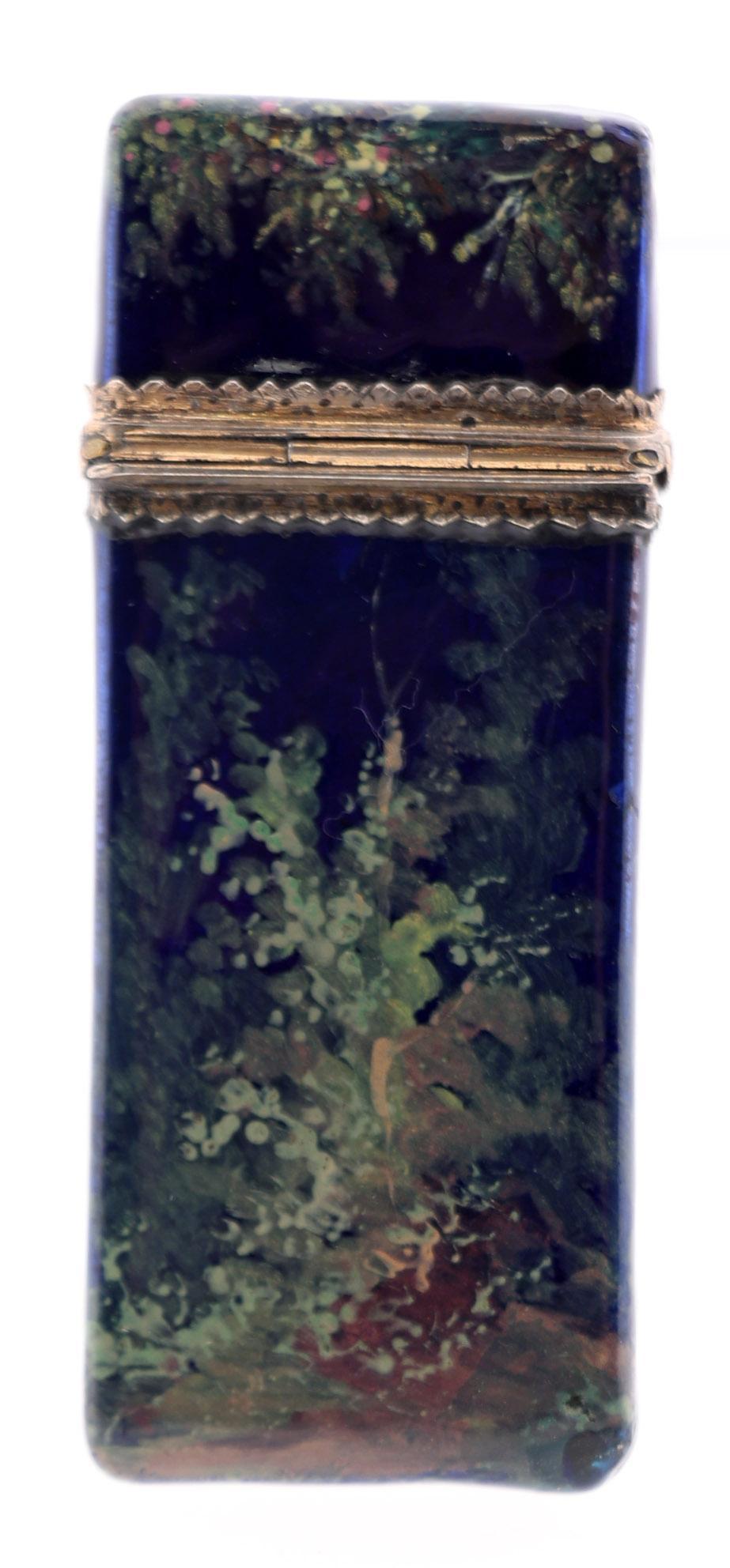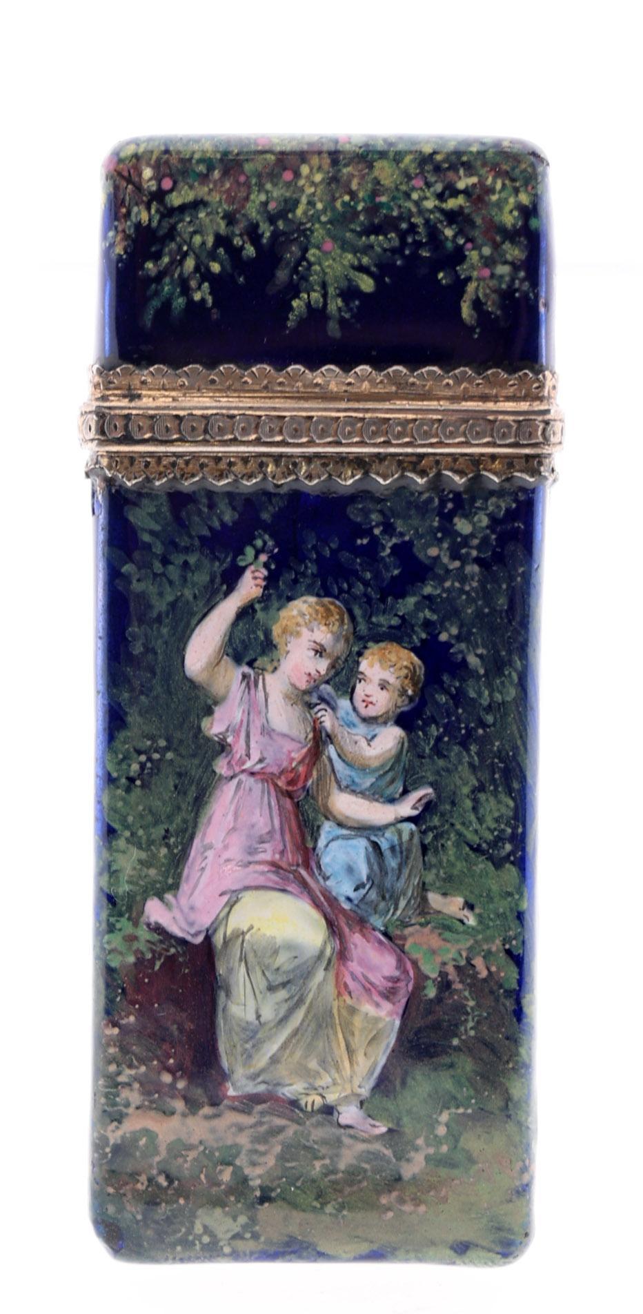 Met kindjes in tuin gedecoreerde Weense emaille platte odeurflacon met vergulde monturen, h.8 cm.