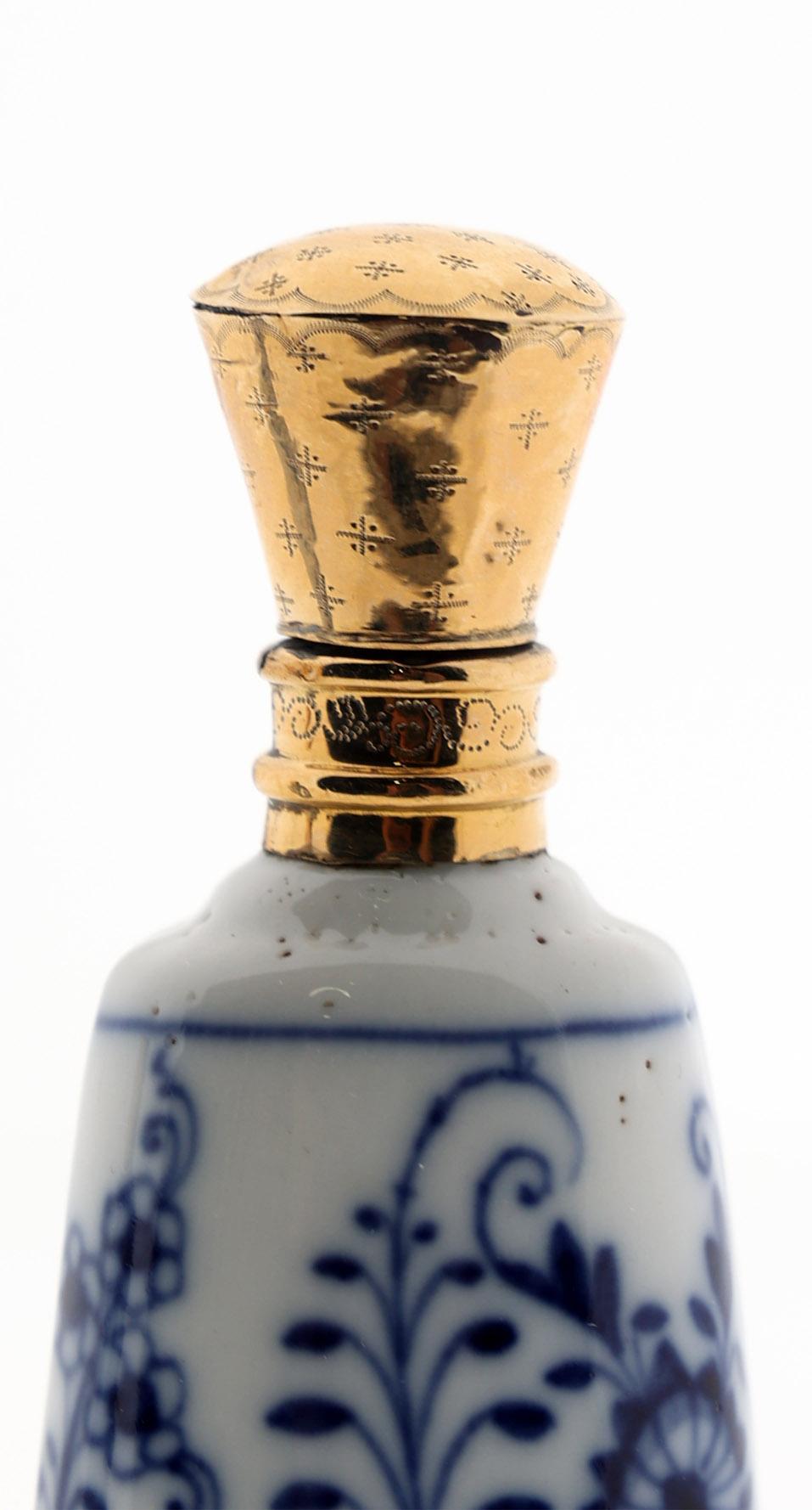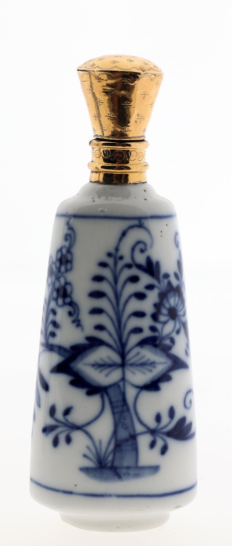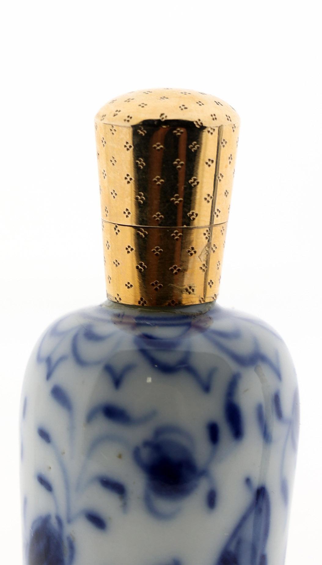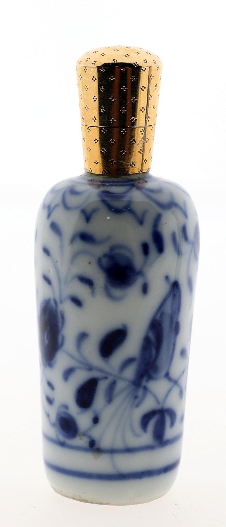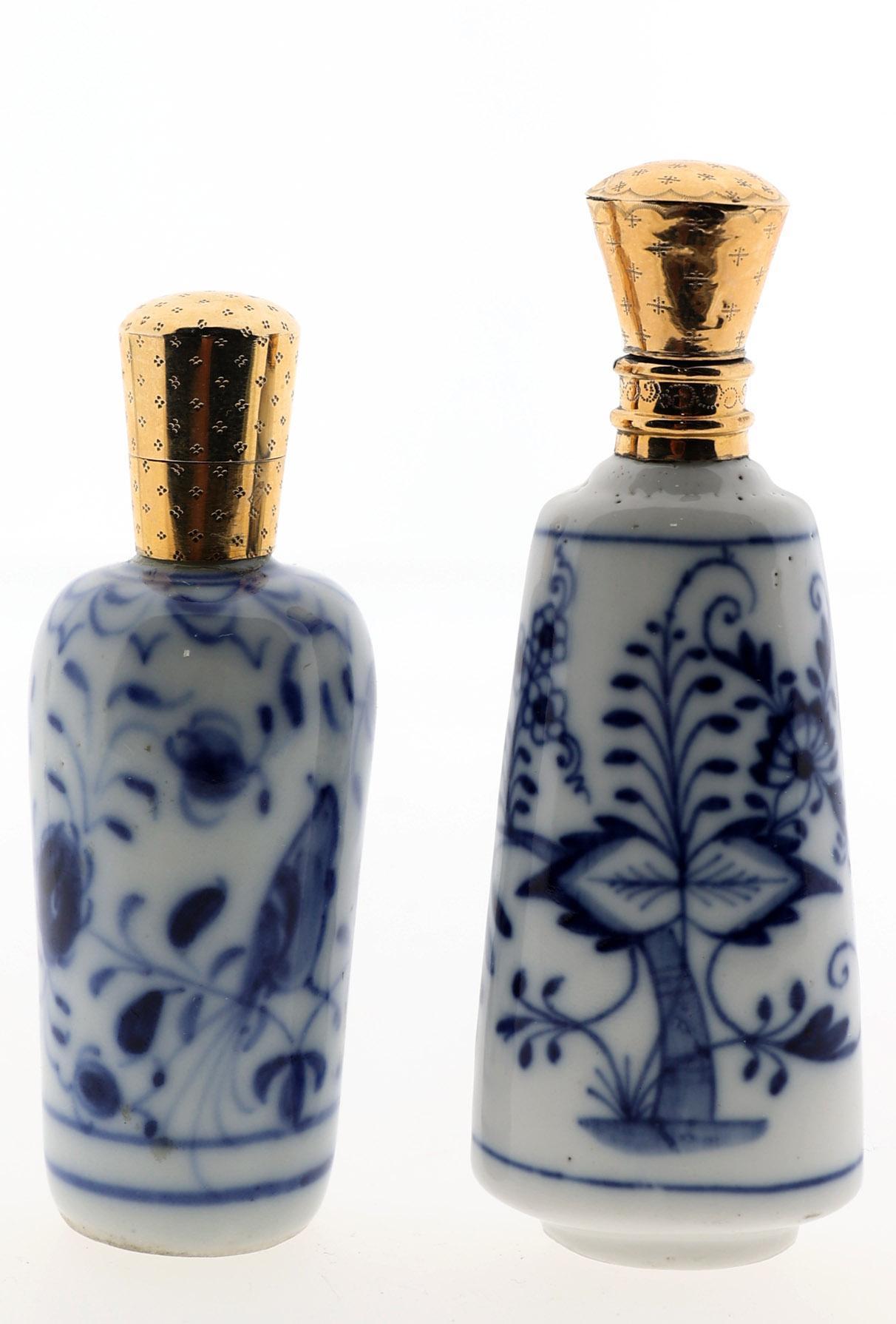 2 Blauw/wit gedecoreerde Europees porseleinen odeurflacons met gouden doppen w.o. een met vlinder en een met bloemendecoraties, h.8,5 en 9,5 cm., 2e helft 19e eeuw