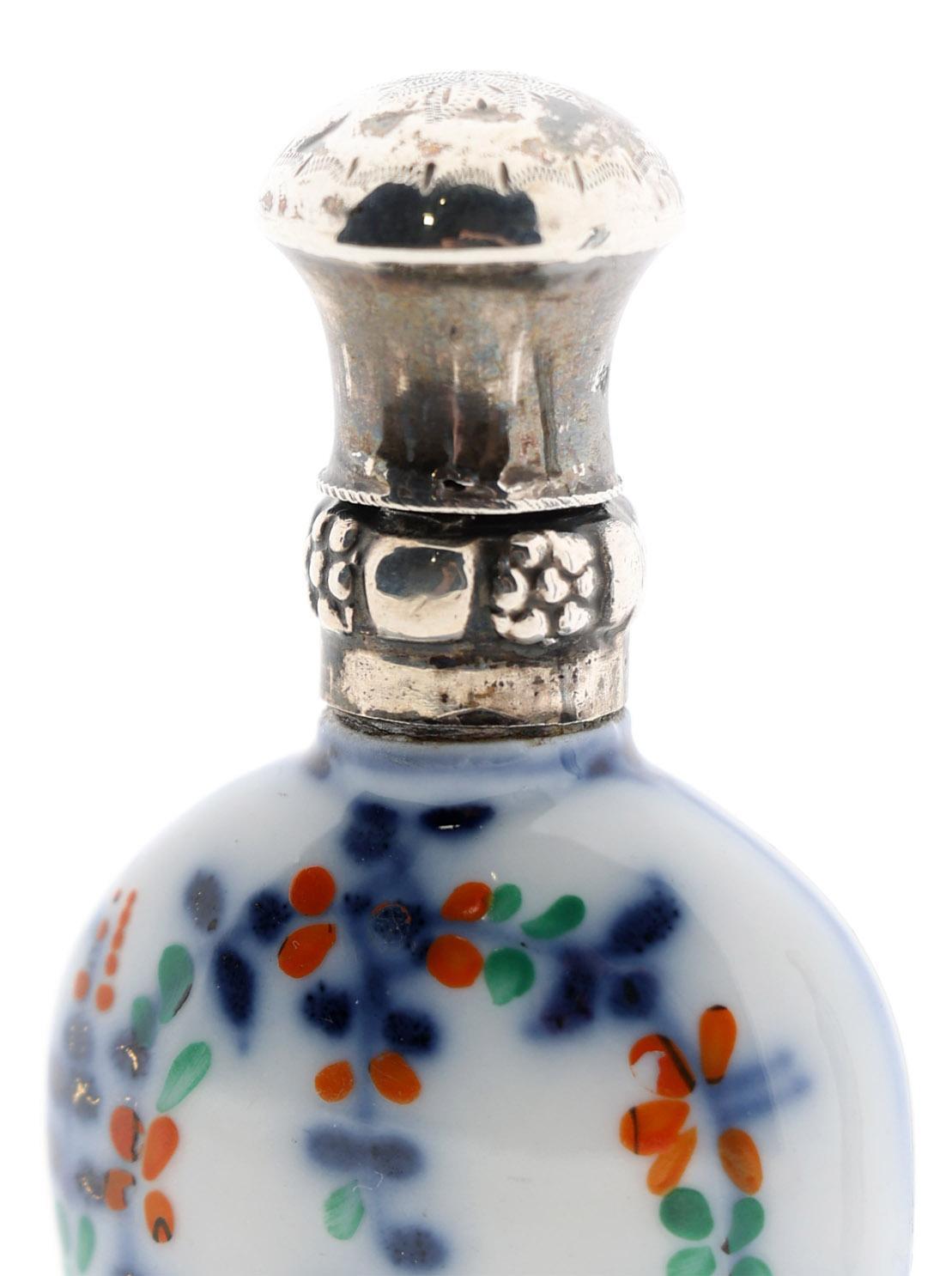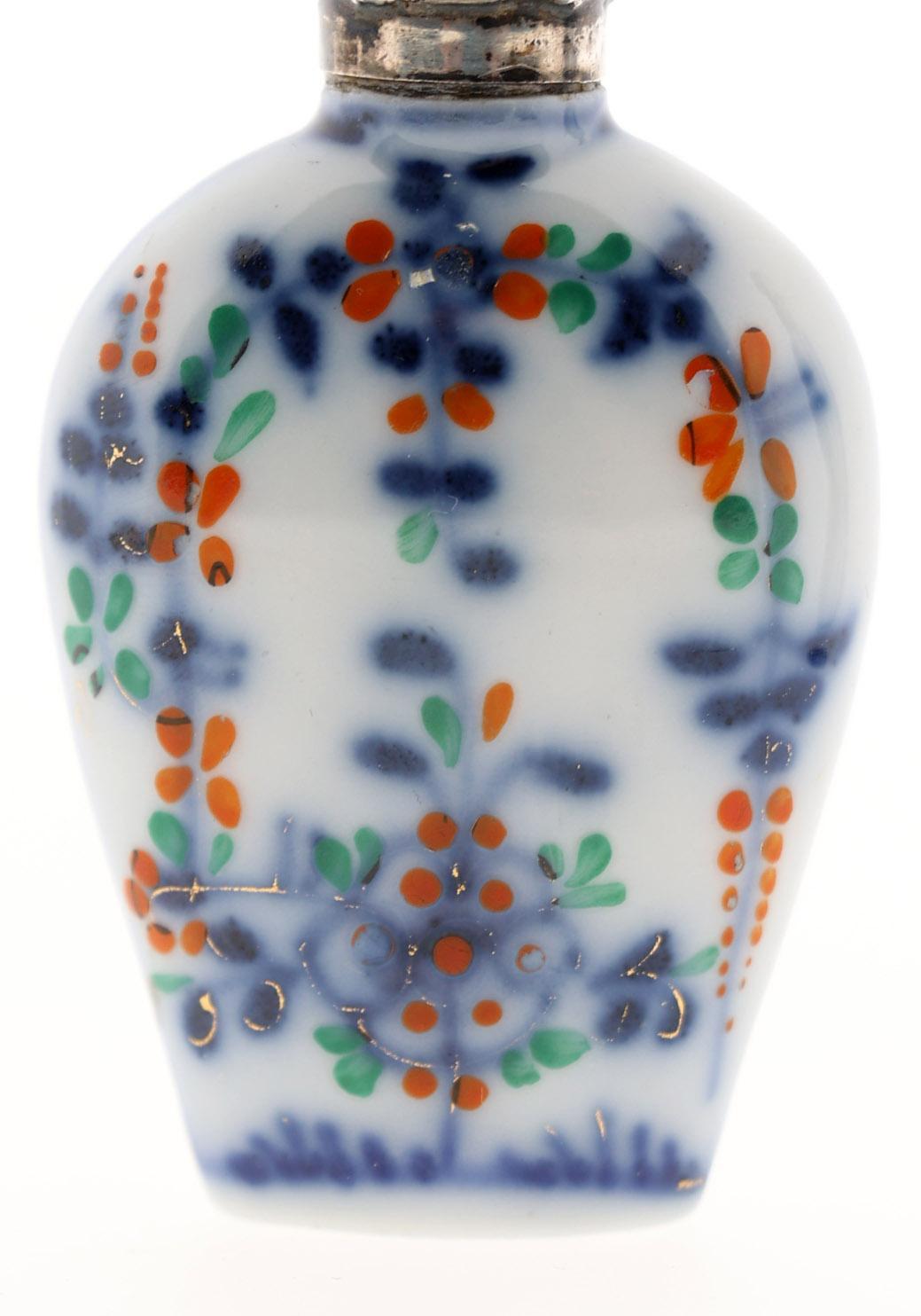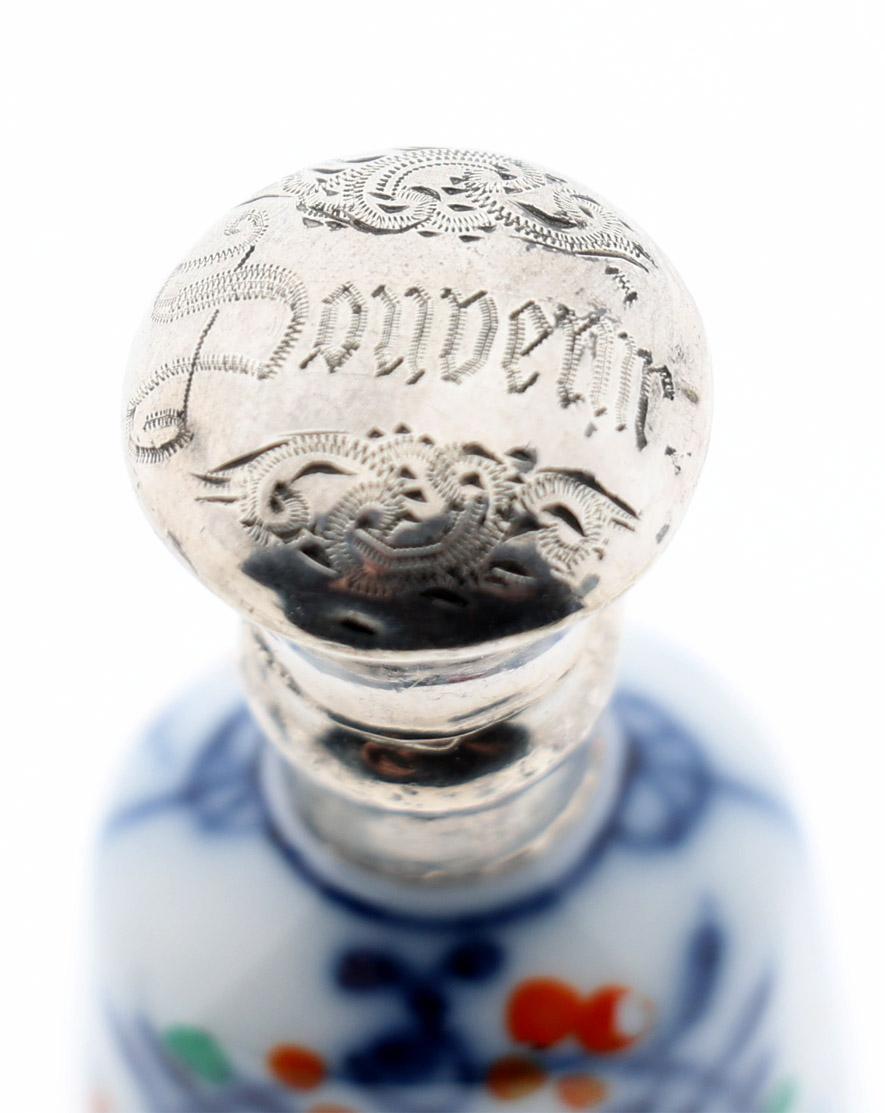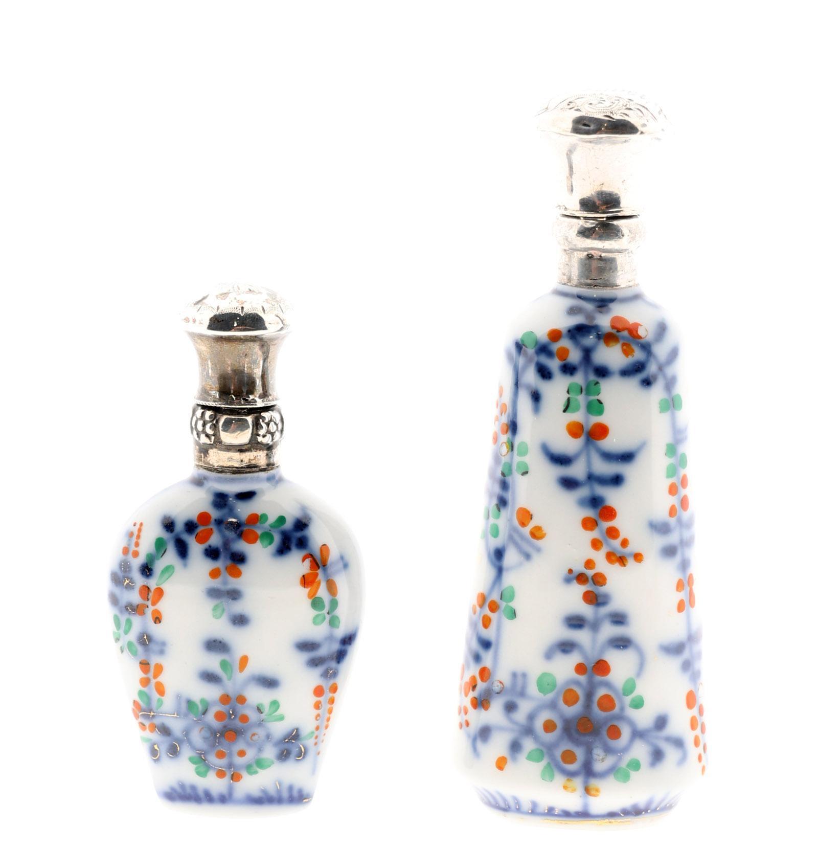 2 Porseleinen Amsterdams Bont odeurflacons met zilveren doppen, h.10,5 en 7,5 cm.