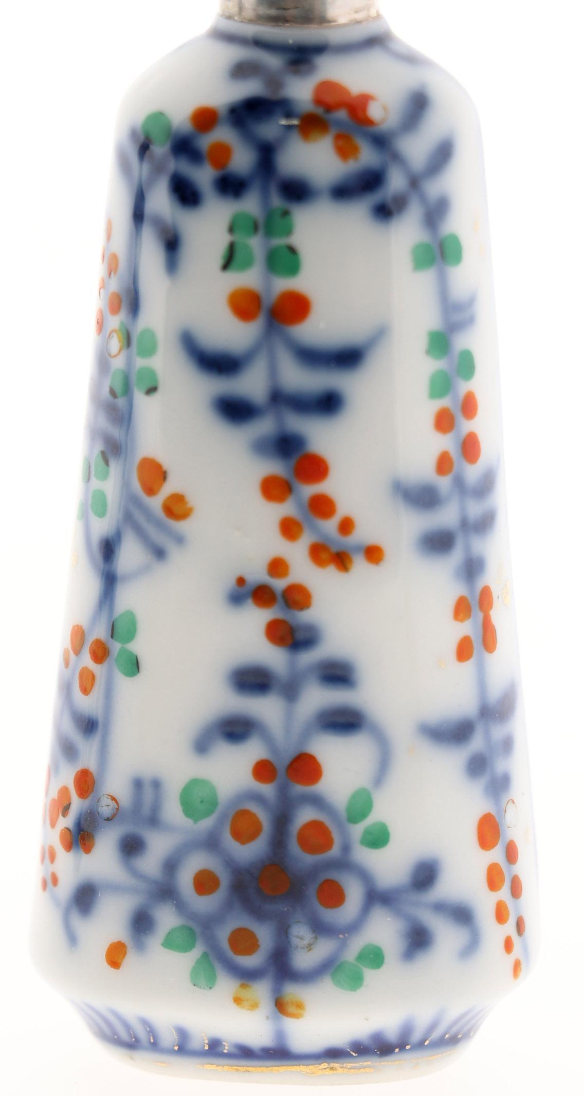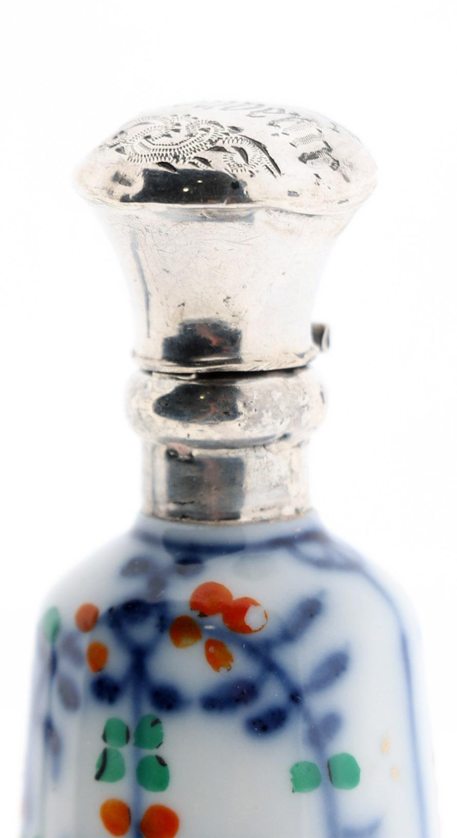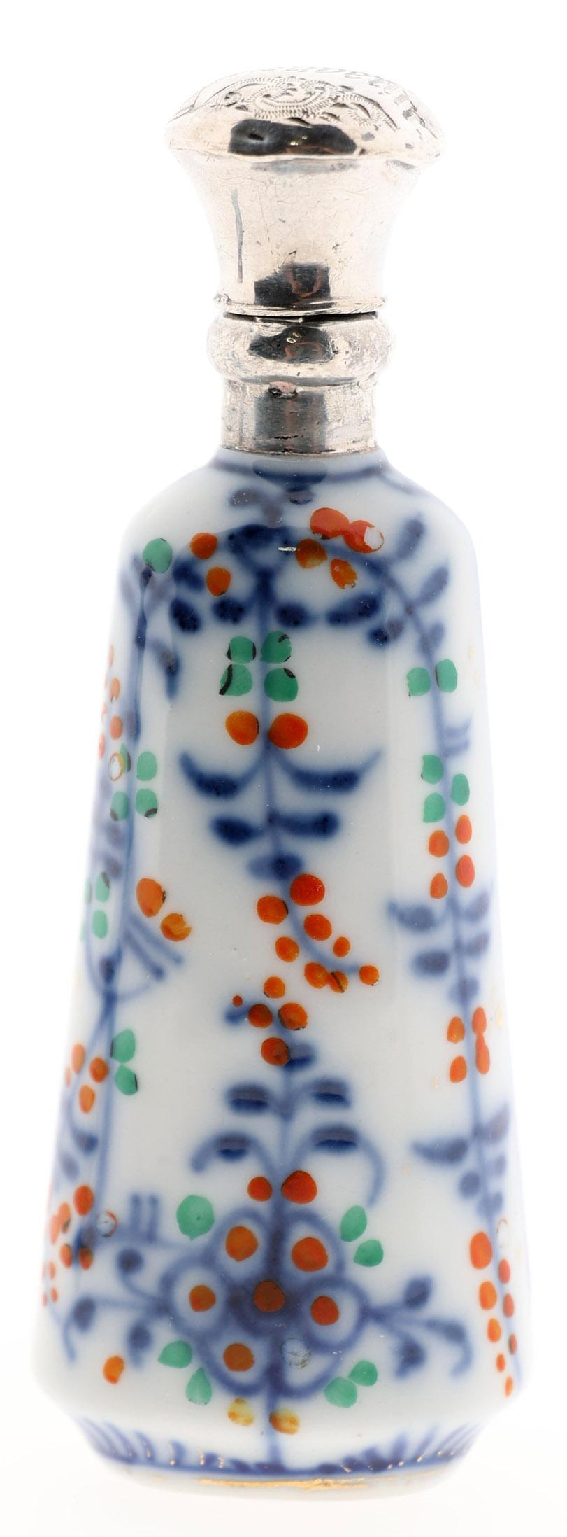 2 Porseleinen Amsterdams Bont odeurflacons met zilveren doppen, h.10,5 en 7,5 cm.