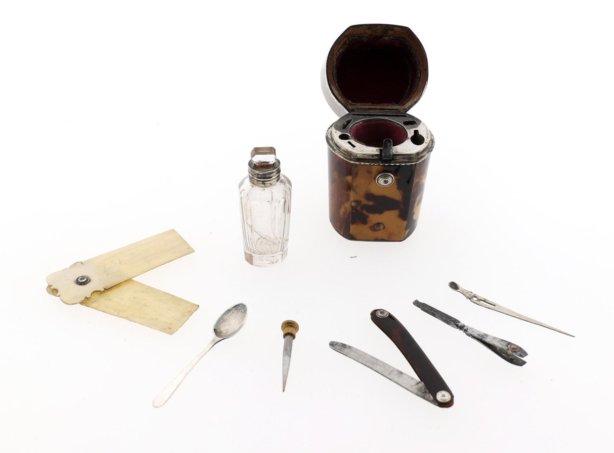 Antiek schildpad reisnécessaire met complete zilveren inhoud w.o. kristallen flesje afgewerkt met zilveren rand, Frankrijk ca.1820, h.6,7 cm.