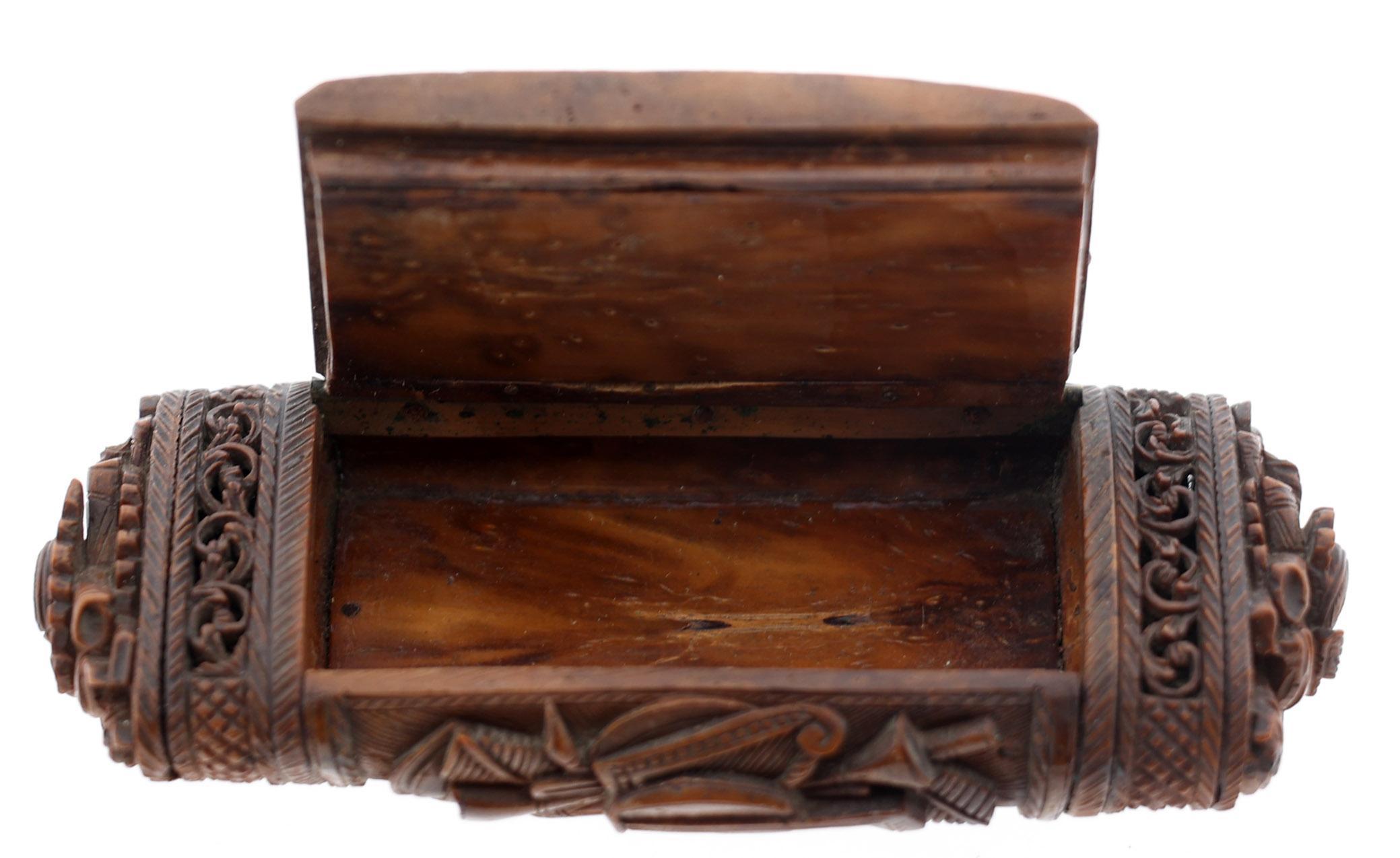 Antieke rijkbewerkte taxushouten coquille snuifdoos met Indiase liggende man en vrouwfiguren, bloemmand, muziekinstrumenten en wapens, Frankrijk ca.1800, L.10 x d.4 x h.2 cm.