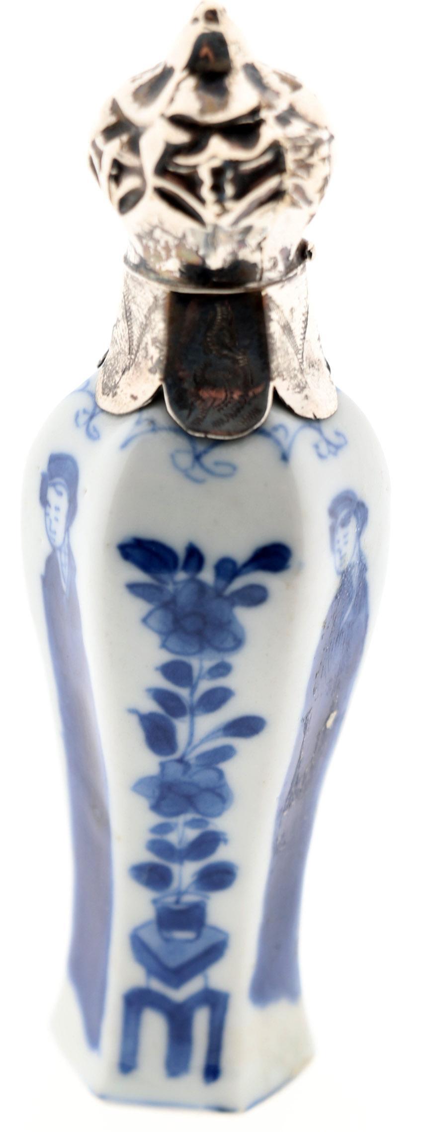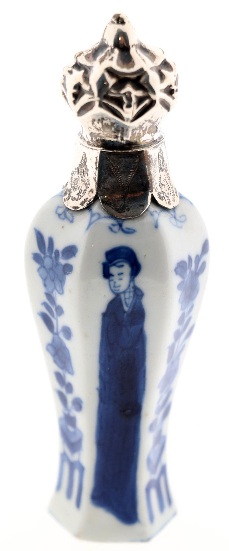 Antieke blauw/wit met Lang Lijs figuren en bloemen gedecoreerde Chinees porseleinen odeurflacon met zilveren dop, China ca.17e eeuw (flacon), Holland 19e eeuw (dop), h.12 cm.
