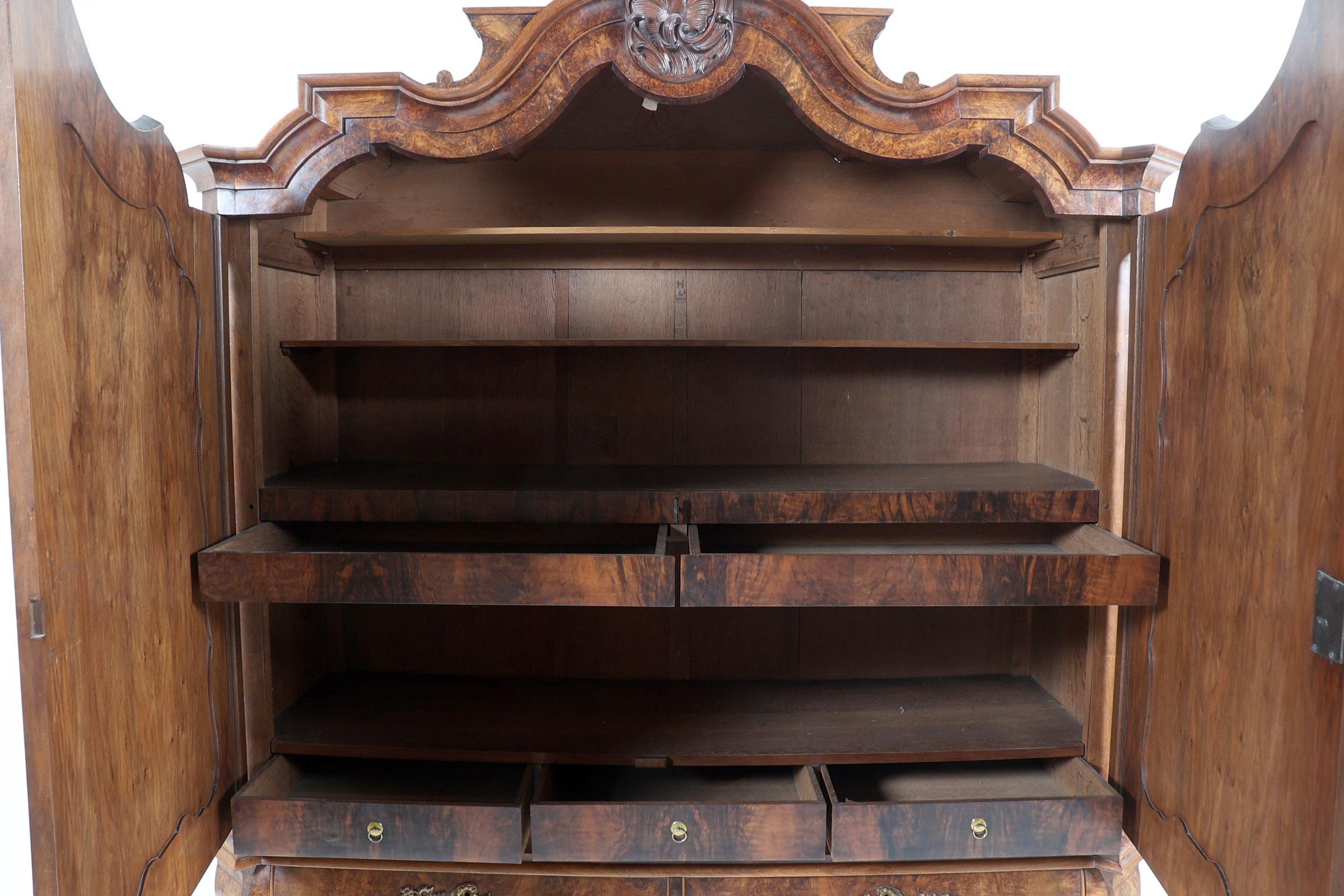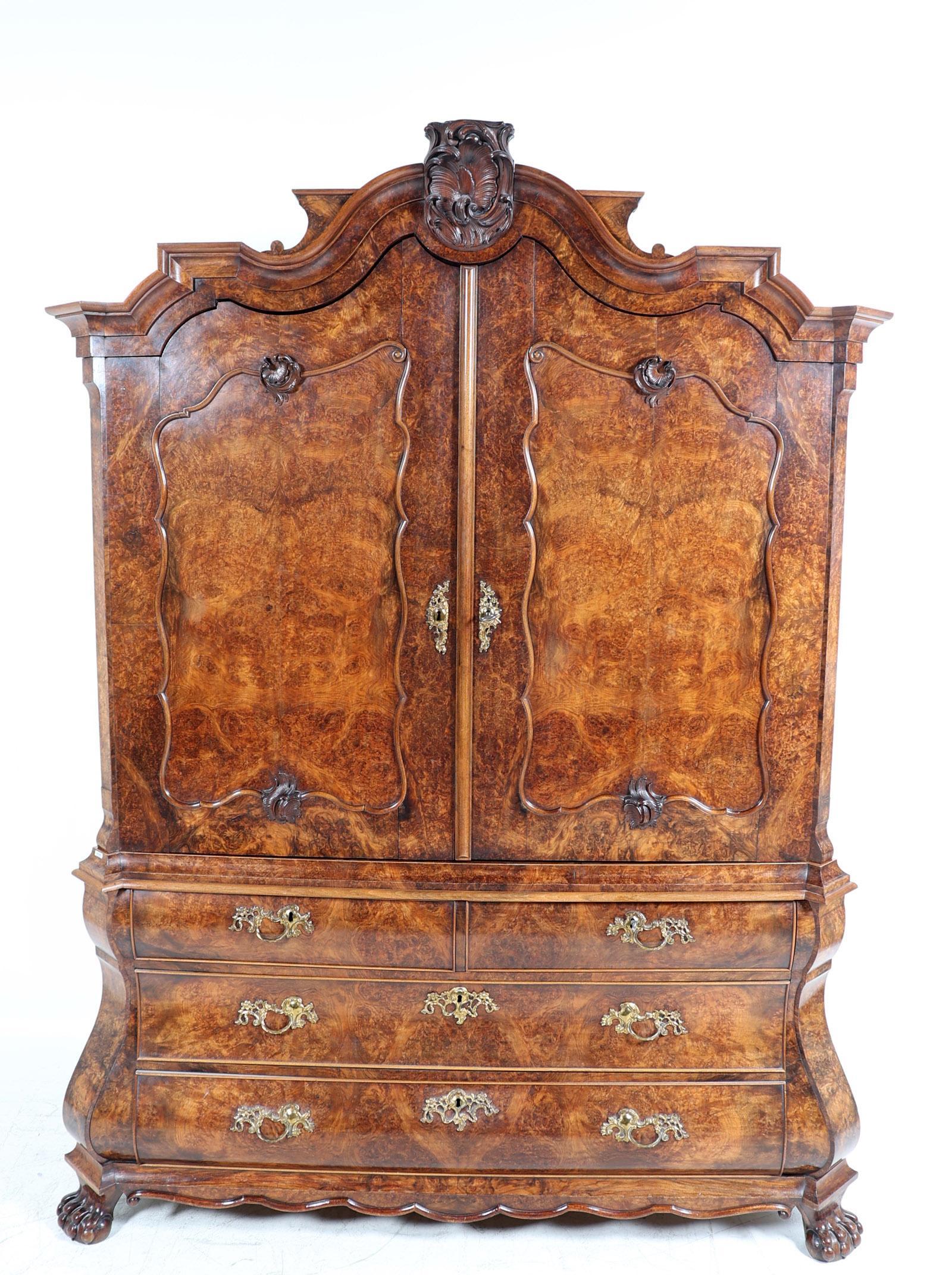 Antiek dubbelgebogen wortelnotenhouten kabinet met gecontourneerde kap en rustend op klauwpoten, Holland ca.1760, h.244 x b.180 x d.65 cm.