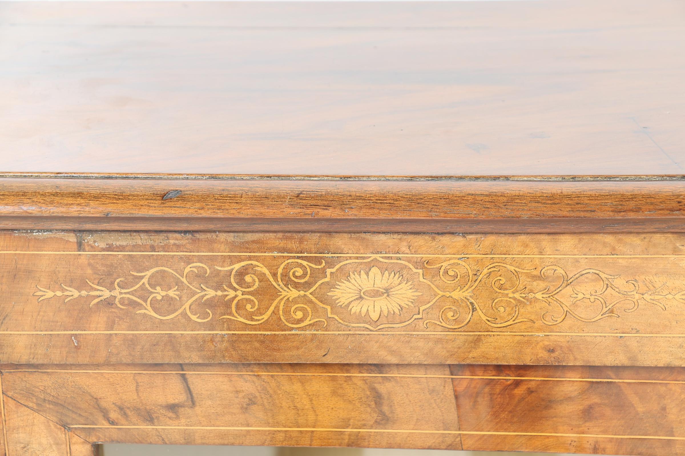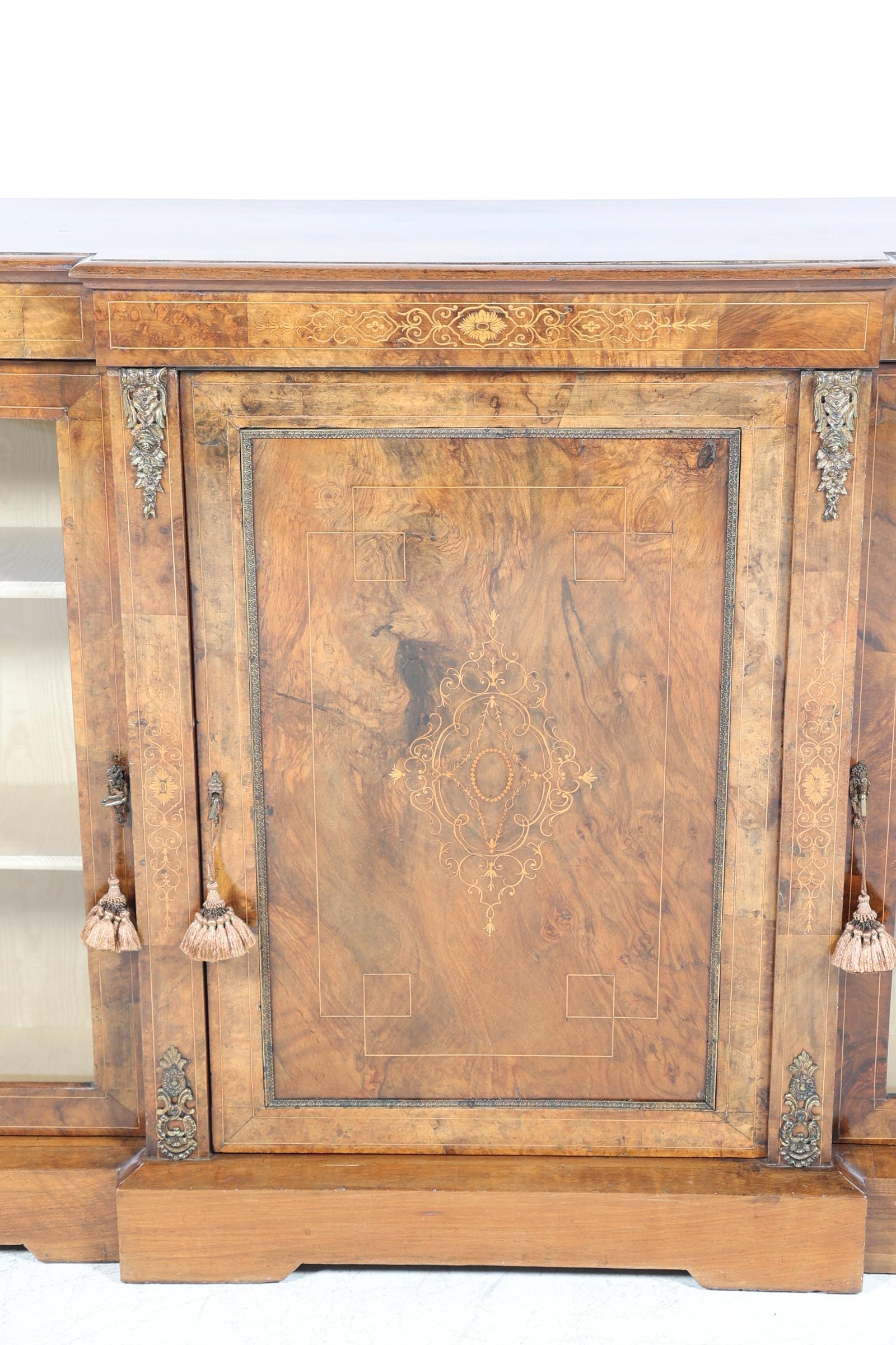 Oude wortelnotenhouten buffetkast met inlegwerk en vitrinedeuren, h.103 x b.176 x d.34 cm.