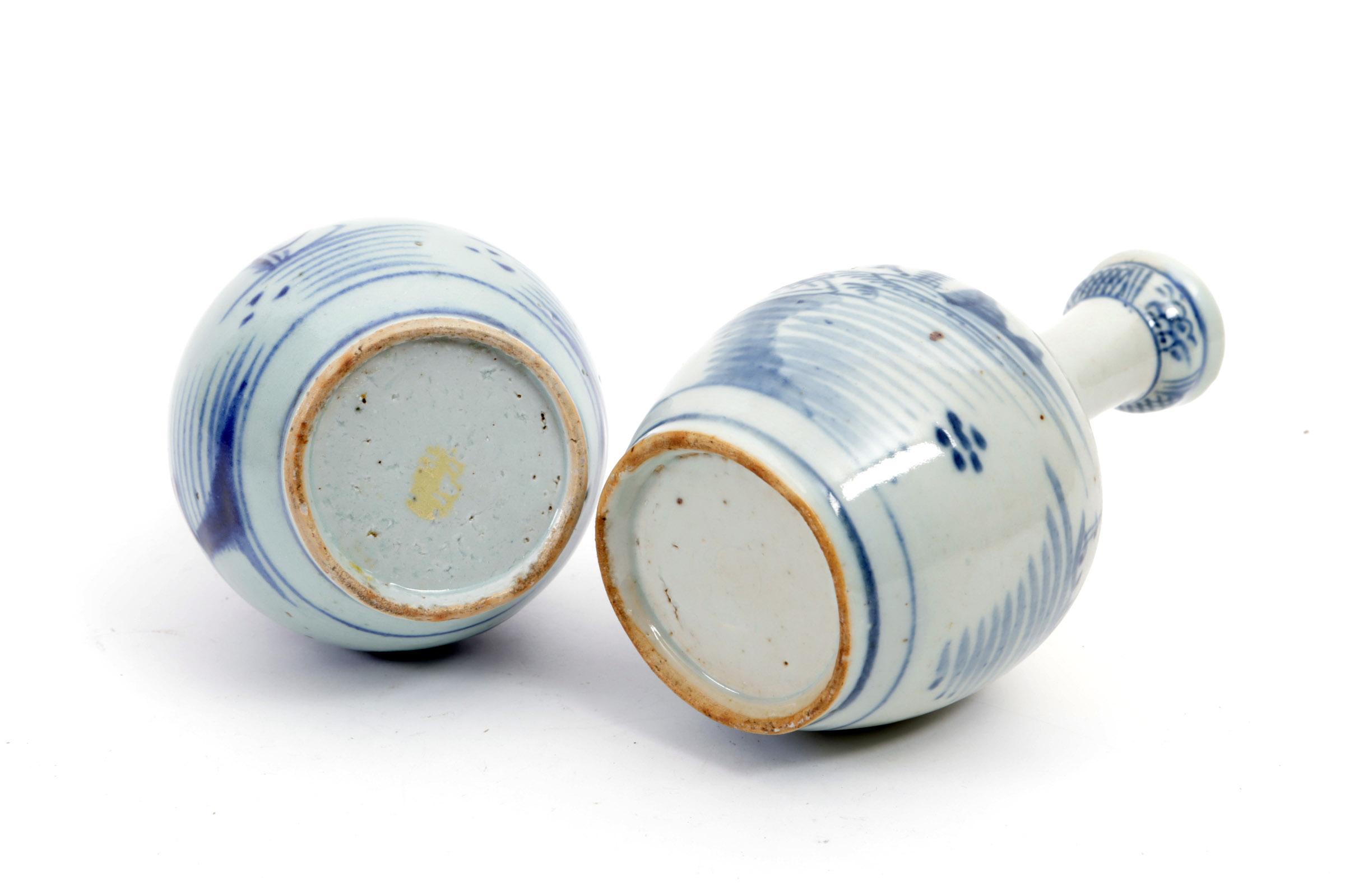 Koop van 2 blauw/wit gedecoreerde Chinees porseleinen kraagvazen, h.21 cm.