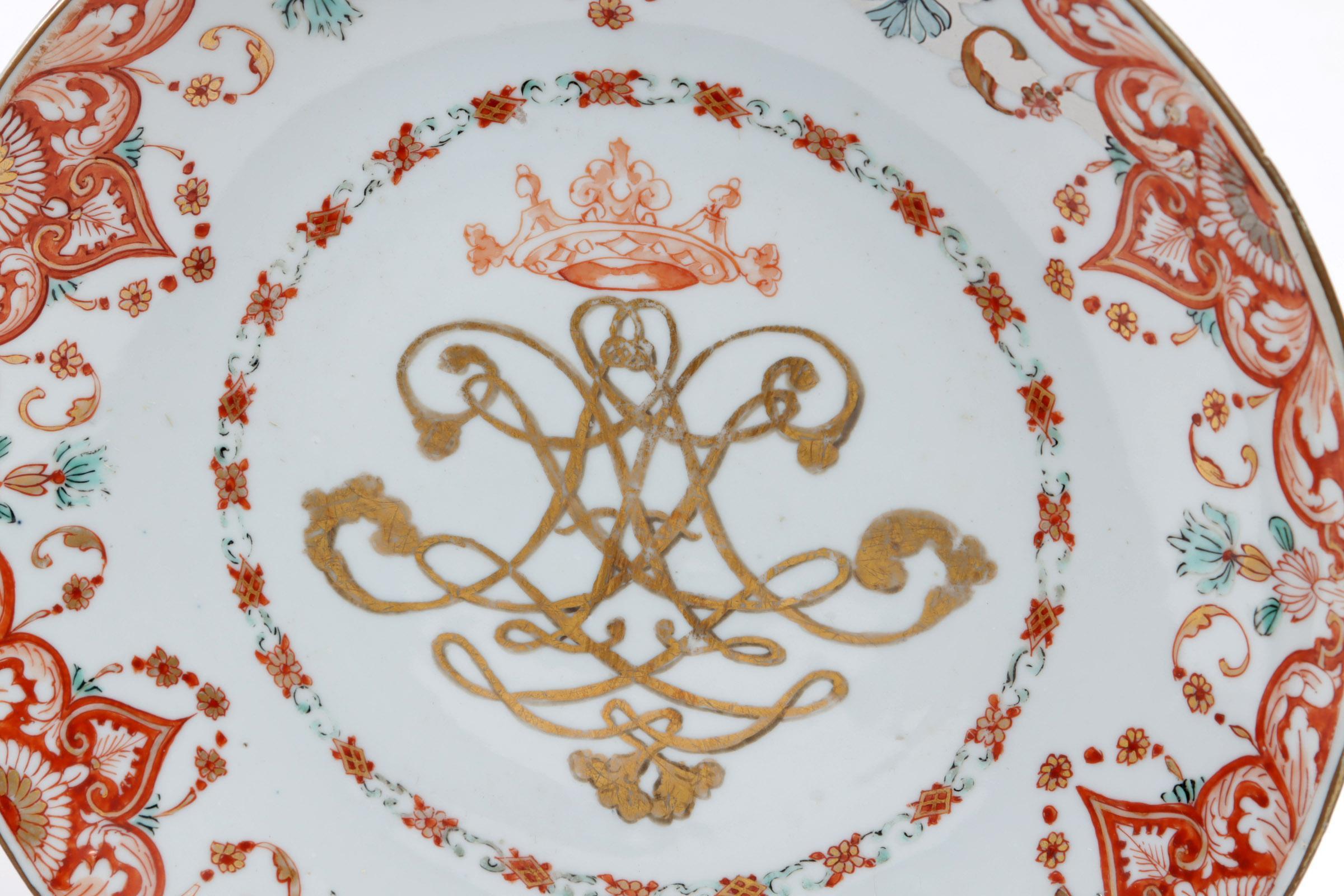 2 Antieke Chine de Commande schotels met monogram (gerestaureerd), diam.27 cm.