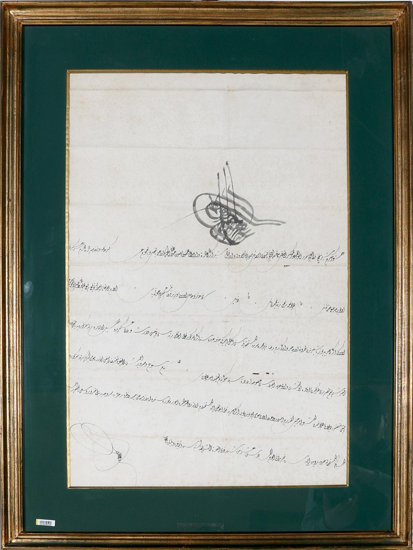 Ottomaanse ferman (koninklijk decreet of schriftelijk bevel van de Ottomaanse sultan), geschreven in Diwani, Sultan II Mahmud Han tuğralı (1808-1839), 70 x 48 cm.