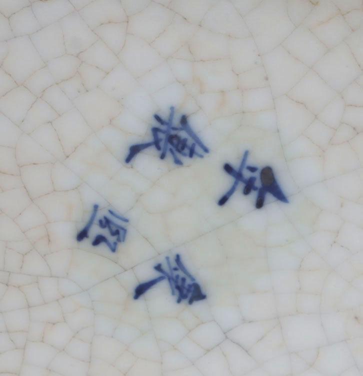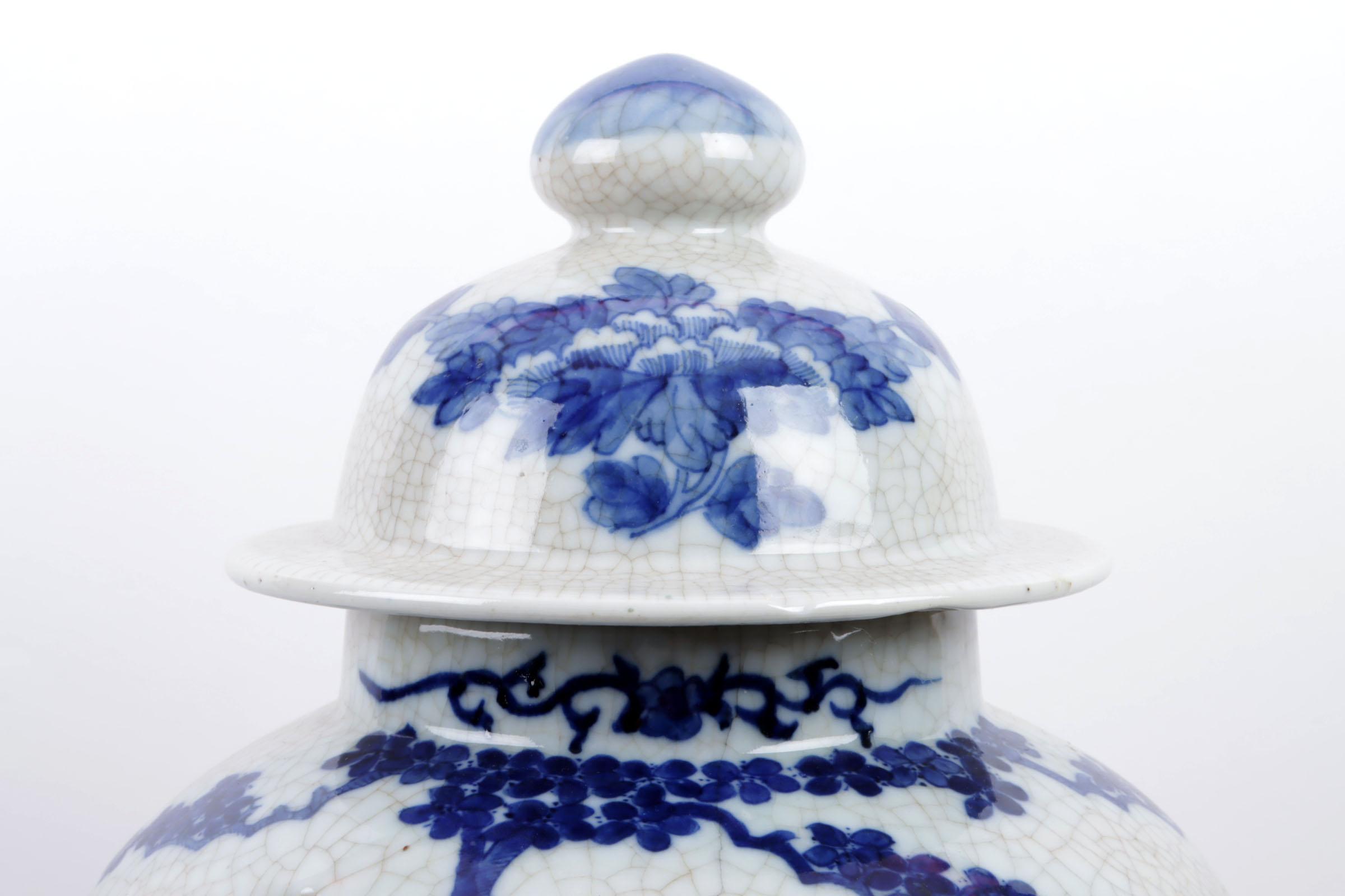 Blauw/wit met papegaaien gedecoreerde dekselvaas rustend op houten voetstuk, totaal h.47 cm.