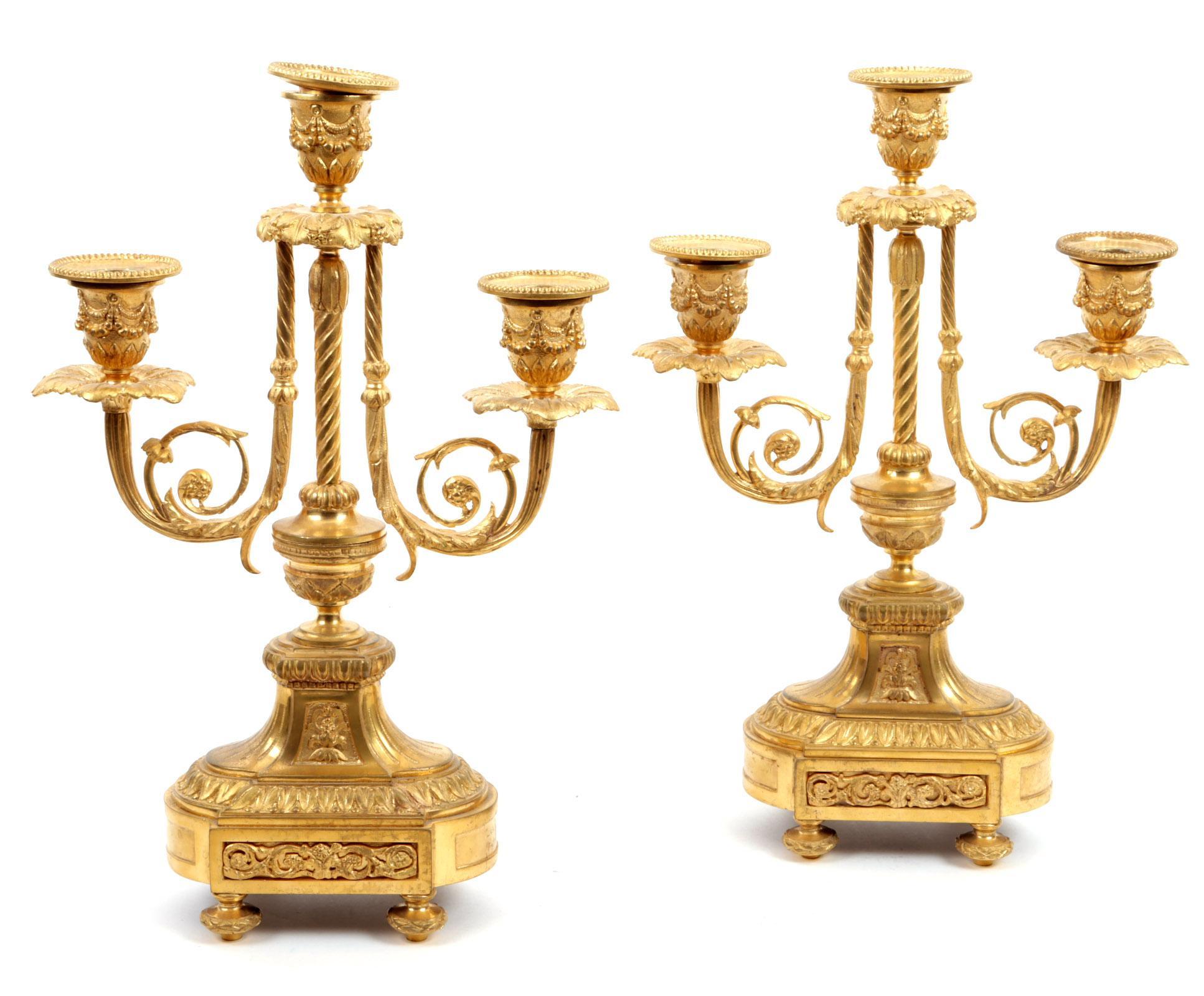 Stel antieke verguld bronzen 3-lichts kandelaars, Louis Seize stijl, h.31 cm.