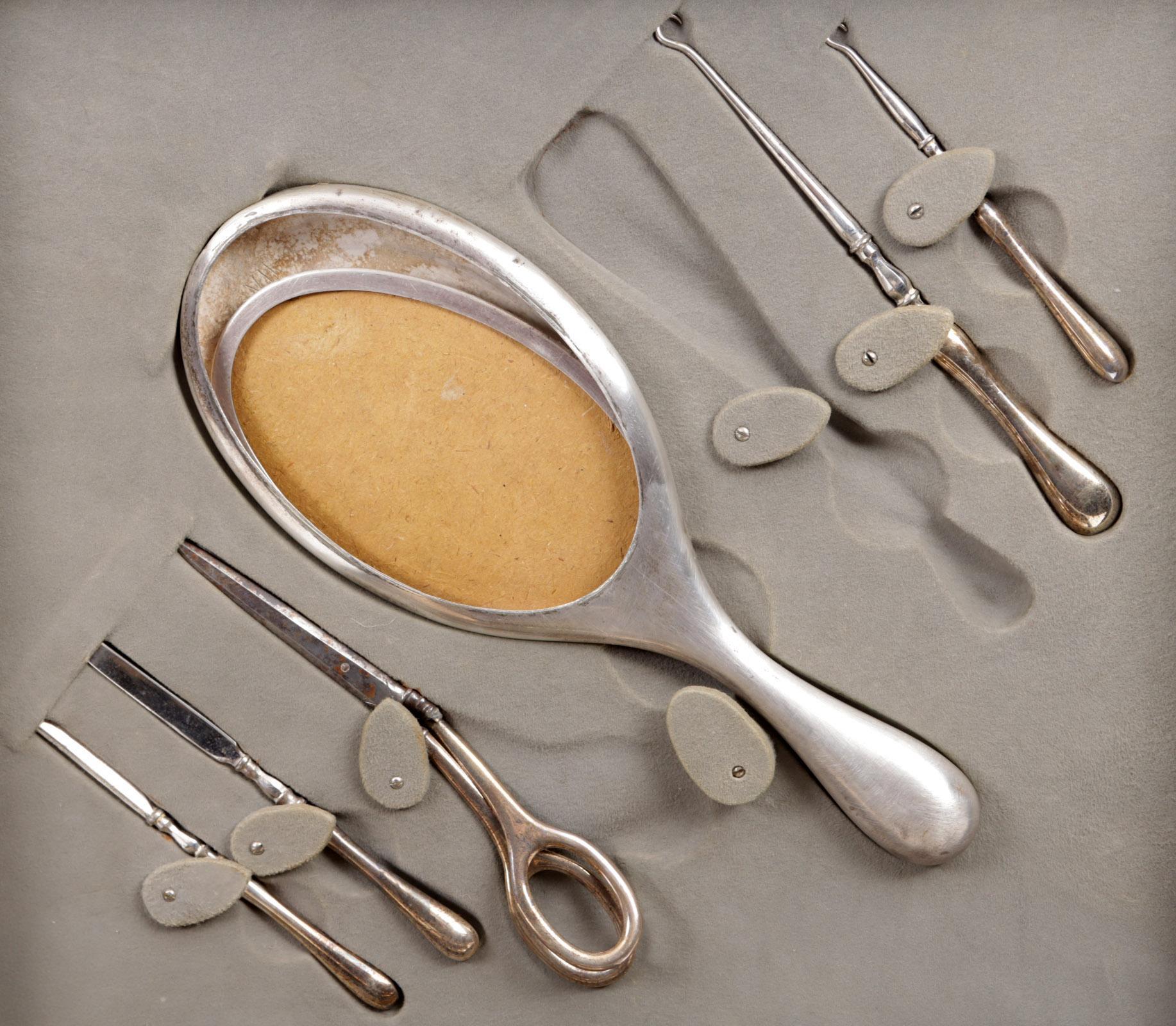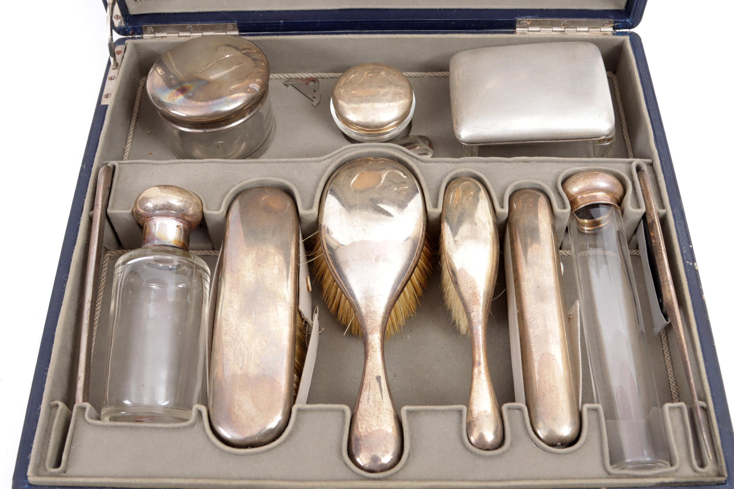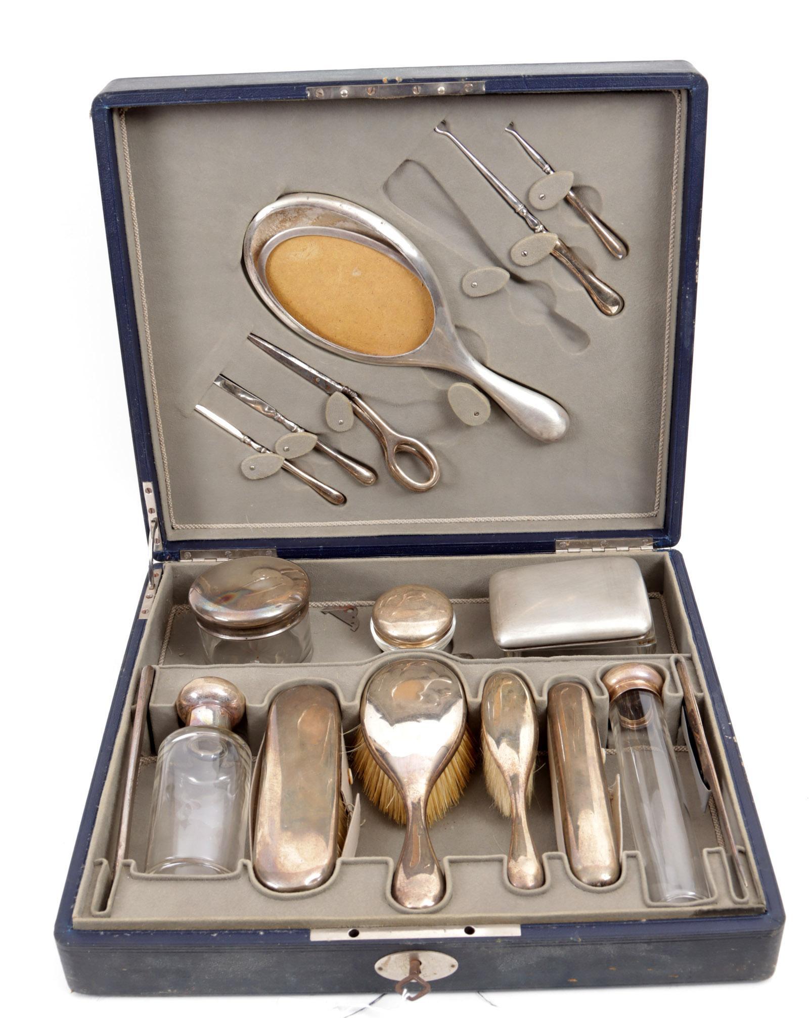 Verzilverde reiskapset in bijpassende koffer (defecten)