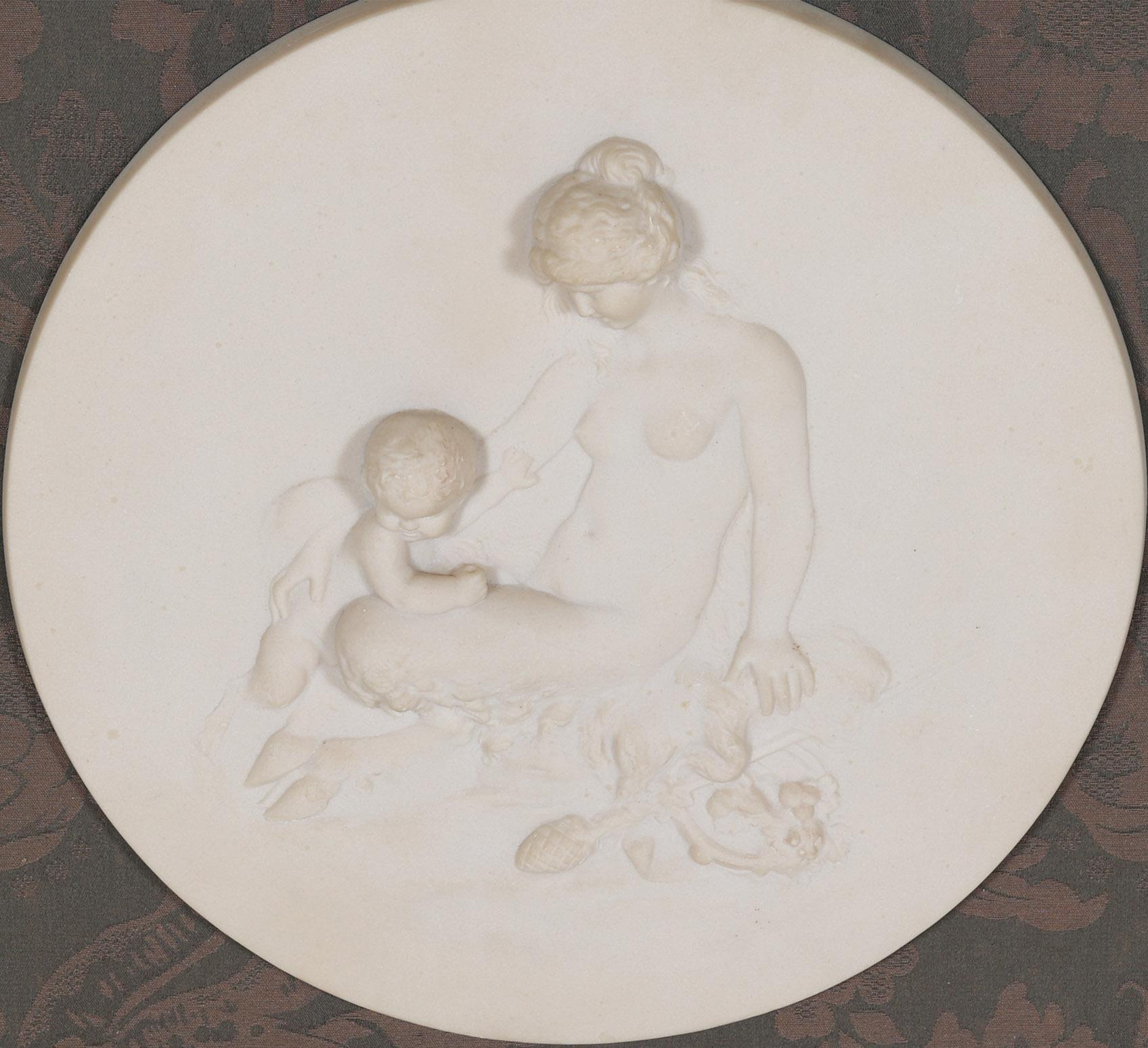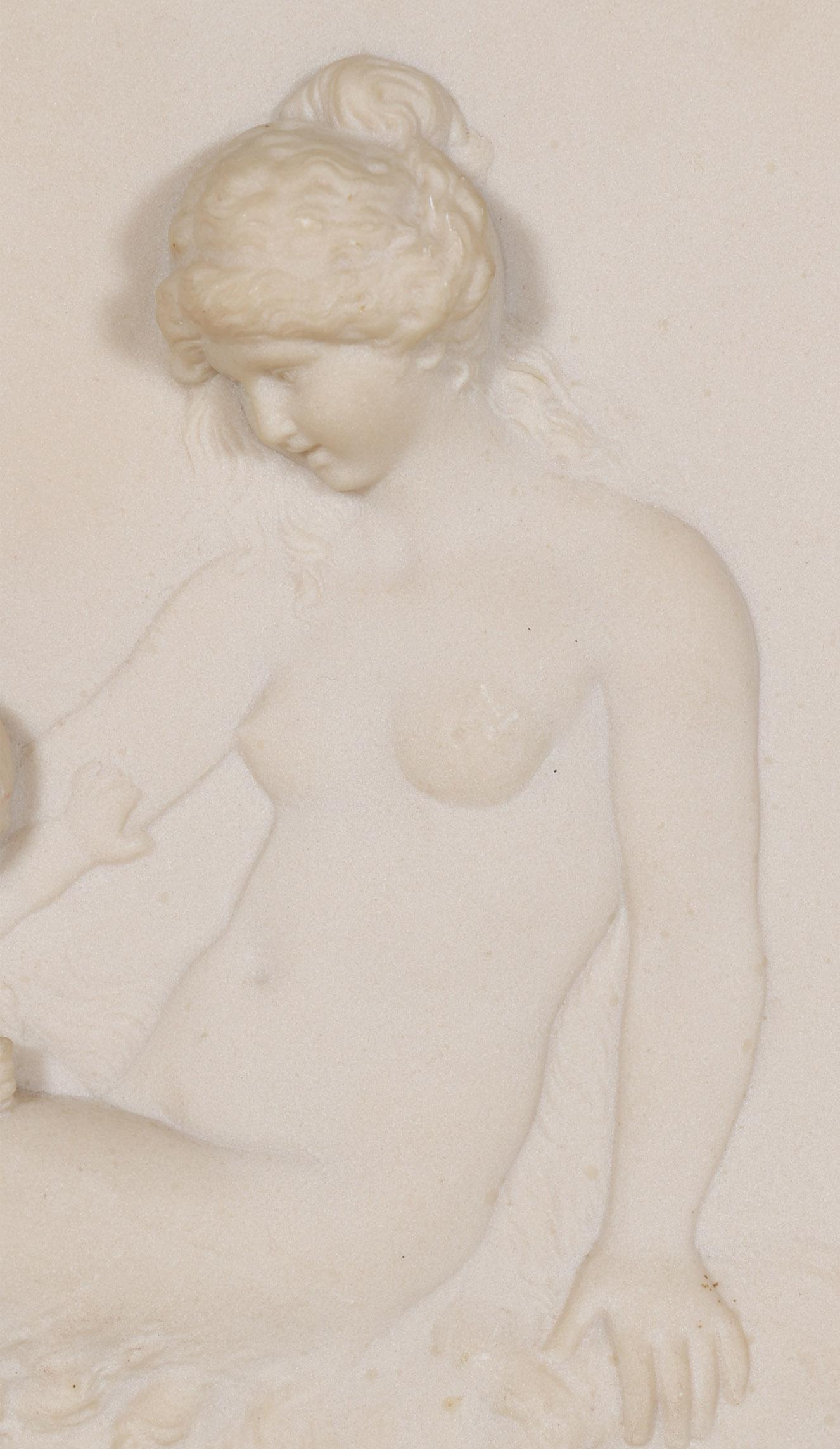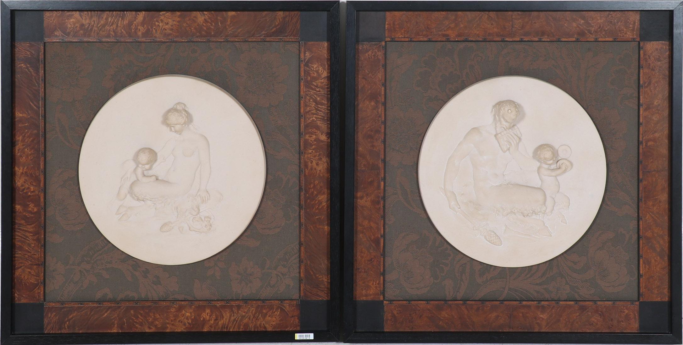 Stel ingelijste albasten plaquettes met klassieke voorstelling, 60 x 60 cm. (incl.lijst/per stuk)